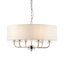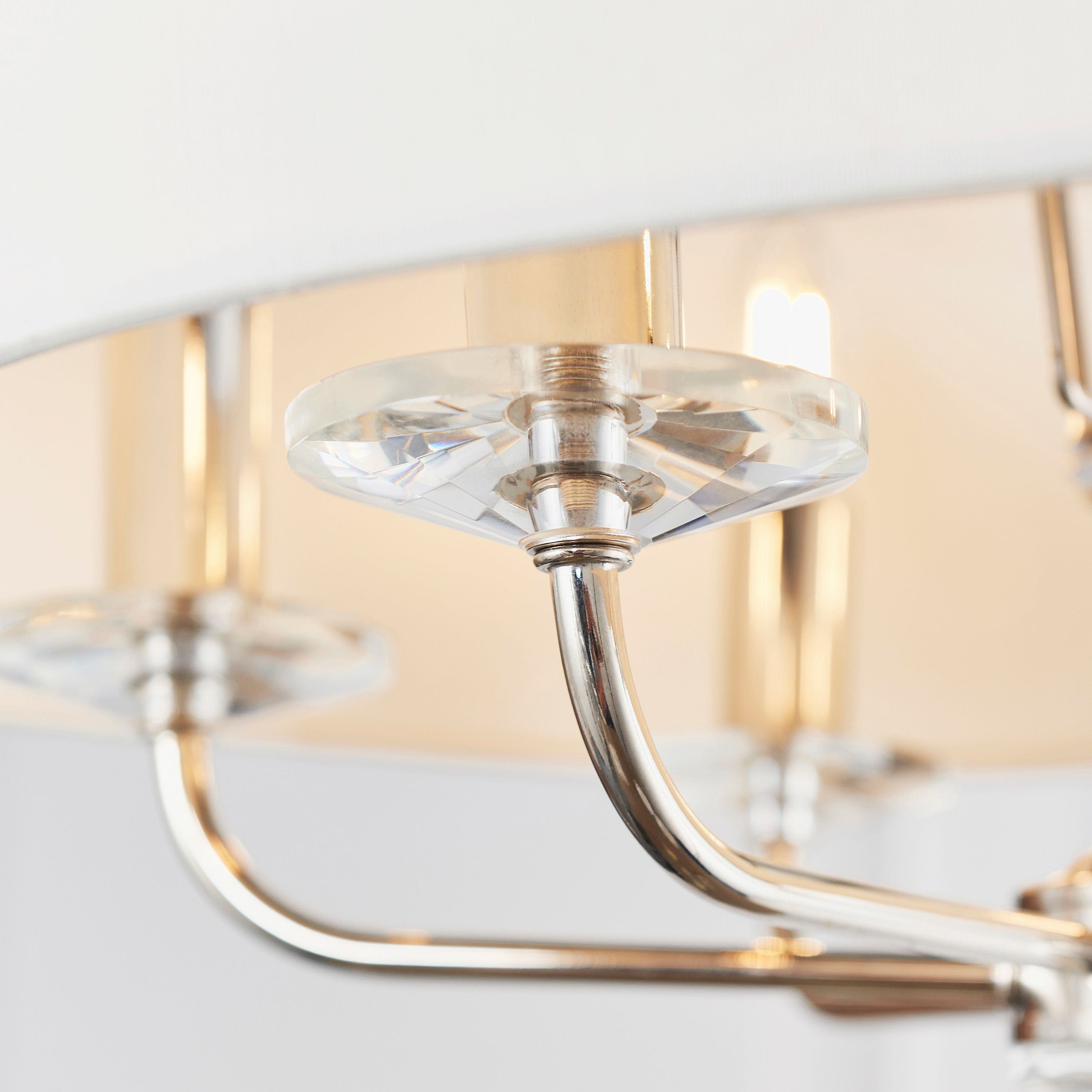 The Nixon 3 light ceiling pendant is finished in a bright nickel plate. The 3 arms are complimented with a touch of crystal and the fitting is topped with a narrow, vintage white, faux silk shades. Height is adjustable, dimmable and suitable for use with LED lamps. Matching items available