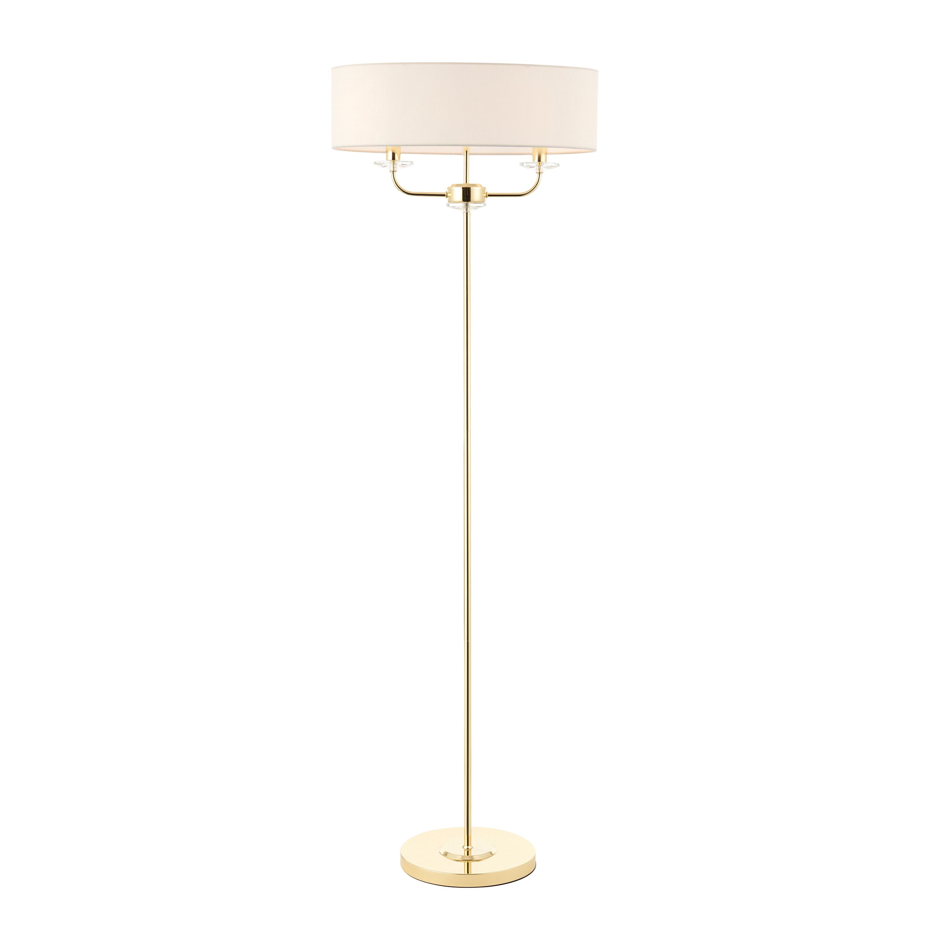 A 2 light floor light finished in a bright nickel plate with a vintage white silk shade and crystal glass detailing. suitable for use with LED lamps and supplied with an inline foot switch