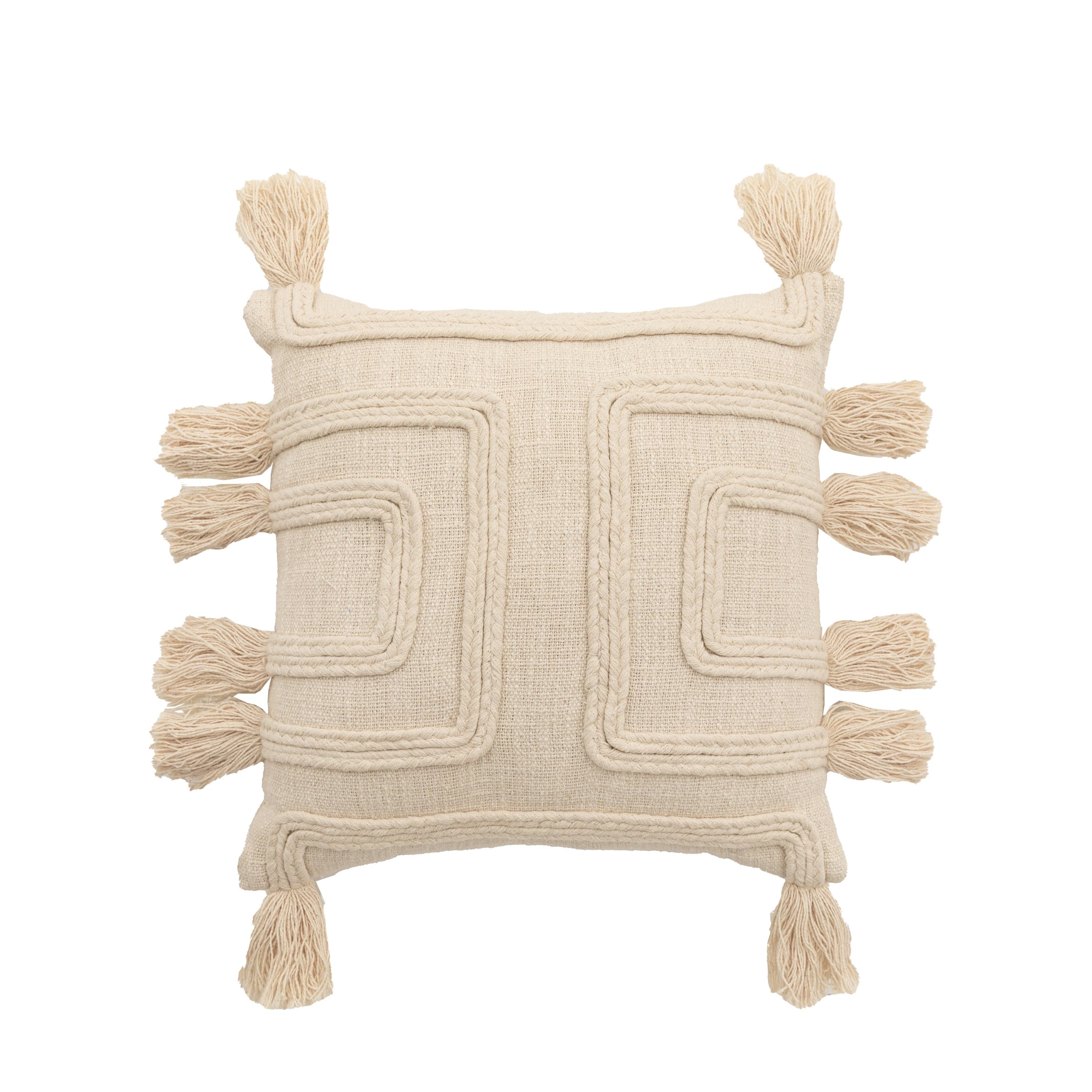 In a neutral cream tone, this soft cushion adds some cosy boho style to your room. The geometric textured pattern is finished with tufted tassel sides and a plain backing.