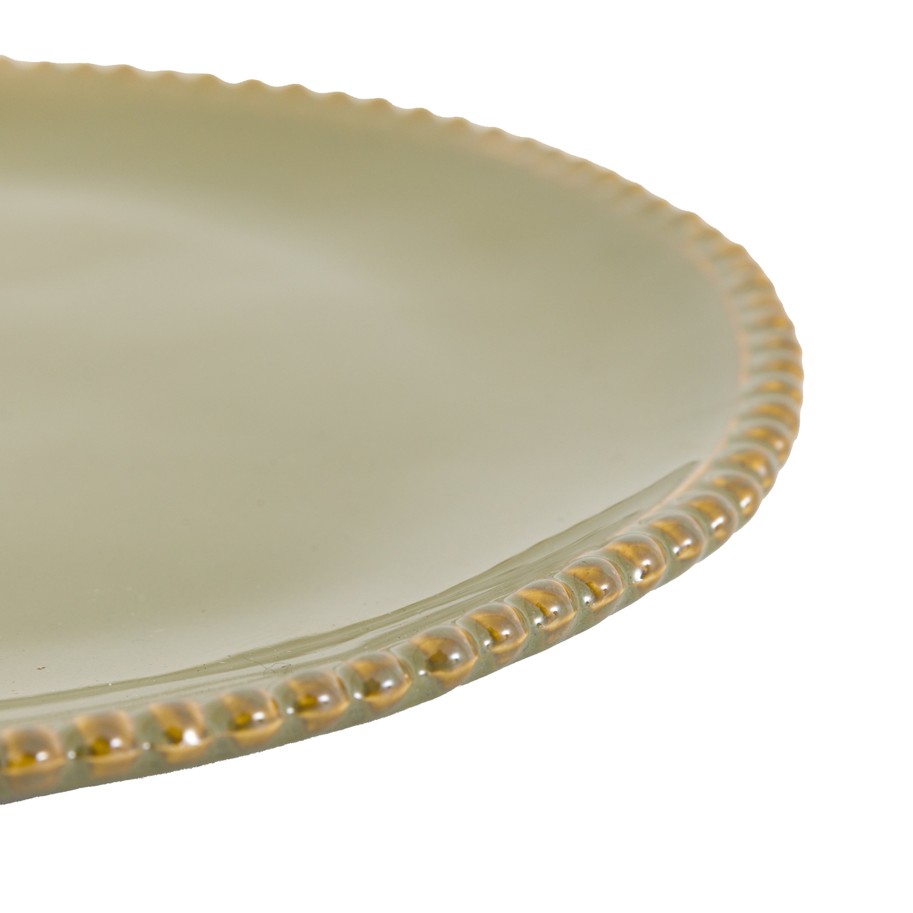 With a high gloss olive green finish and soft organic curves, this set of 4 dinner plates are finished off with a beaded edge trim. Dishwasher and microwave safe.