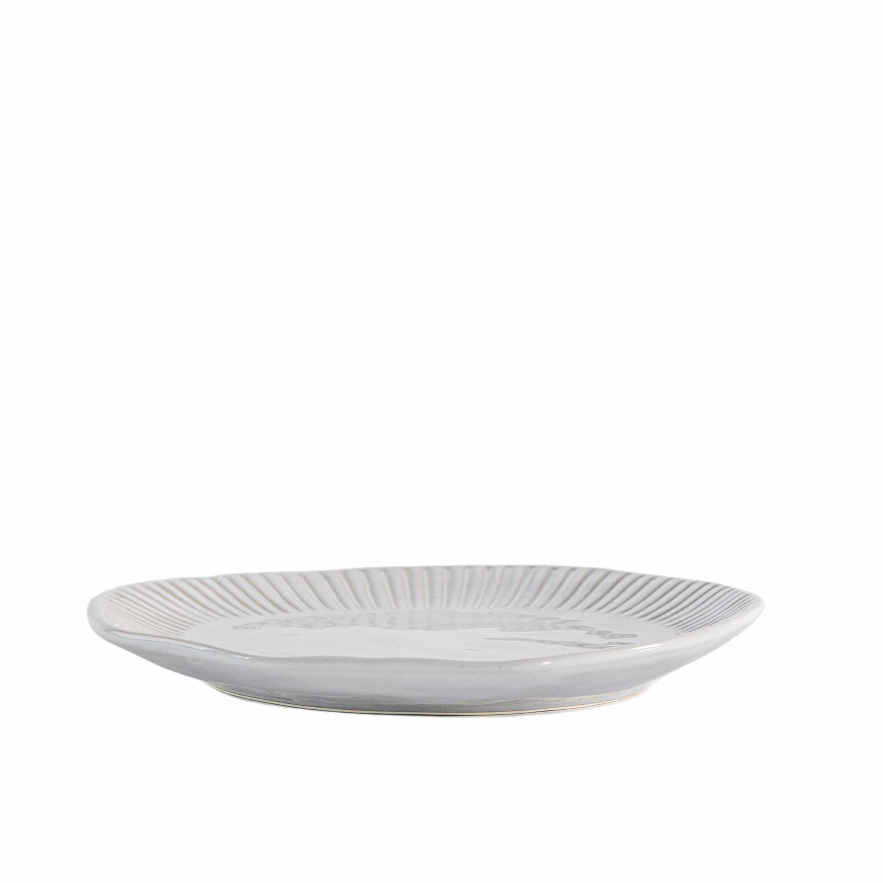 Set of four dinner plates which are our exclusive own design, featuring an organic shape and textured ridge detailing around the rim. Coordinating pieces available.