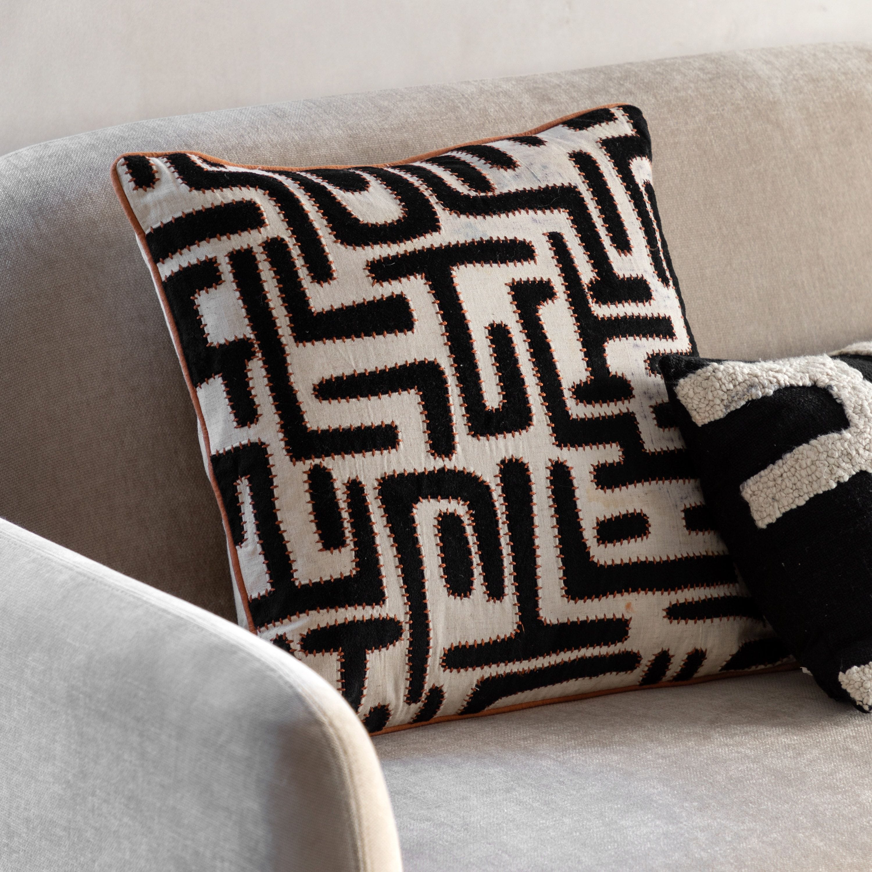 A bold stand out addition to any room, this cushions black velvet geometric pattern is highlighted by contrasting embroidery and edge piping. All coming together to truly elevate your space.
