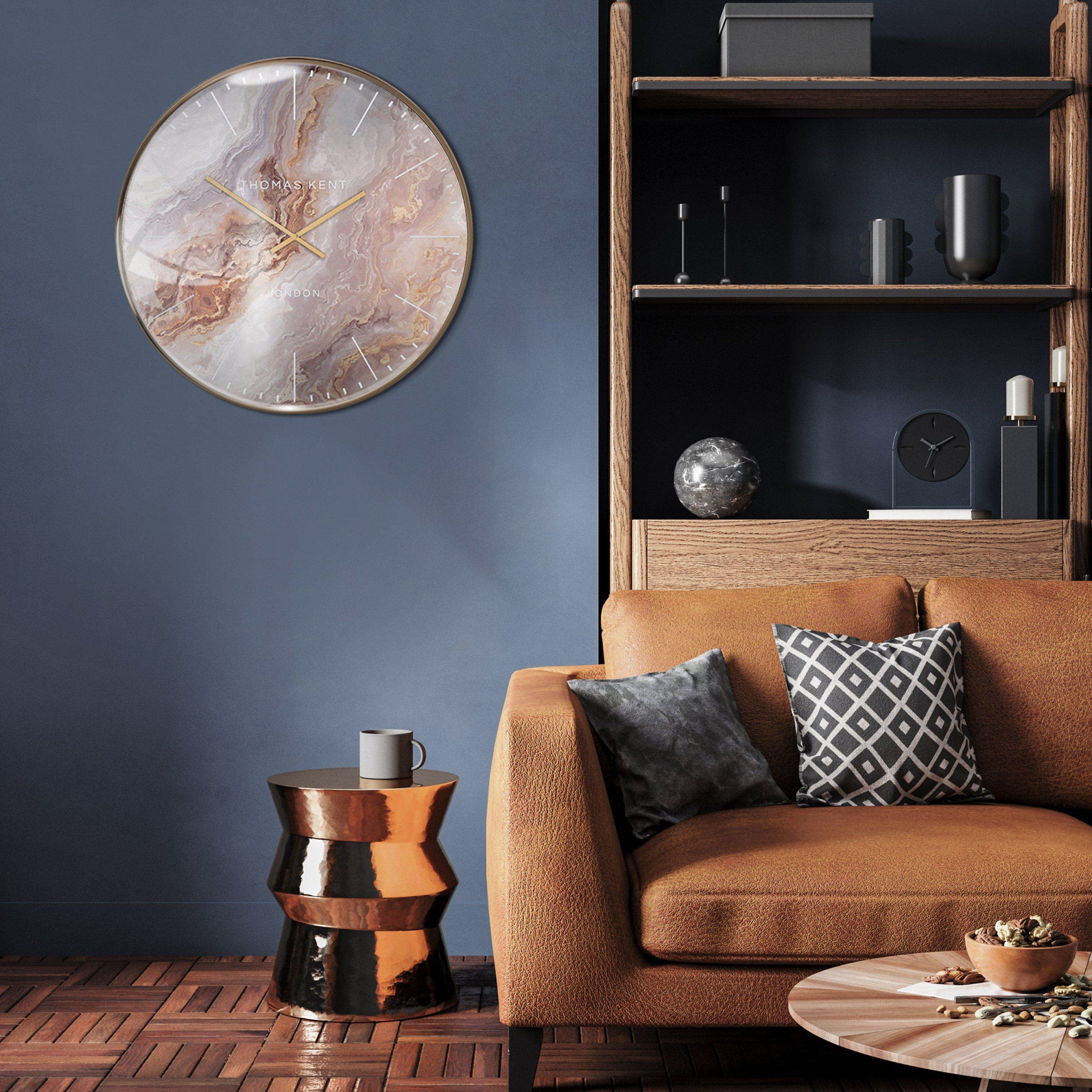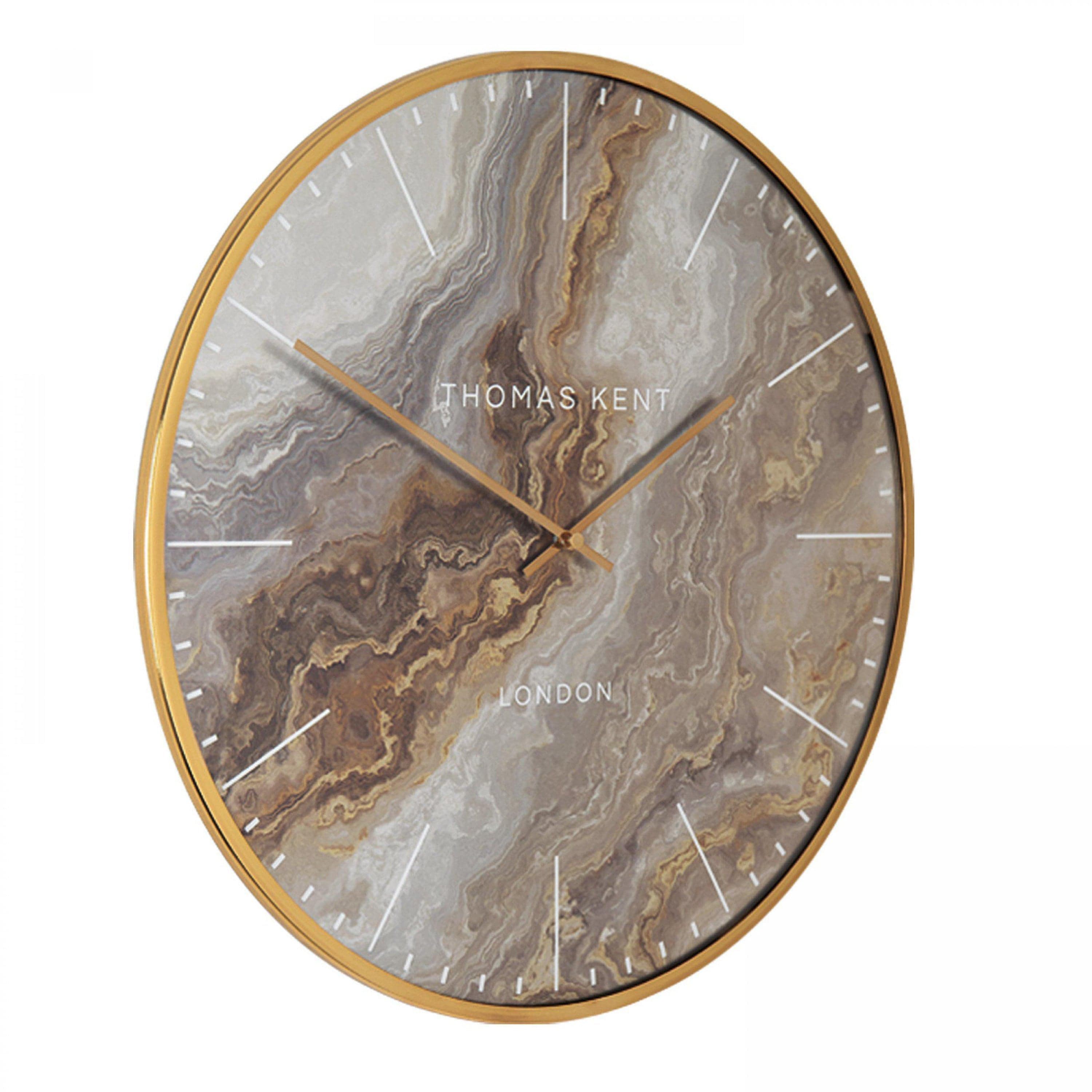 The 26" Thomas Kent Oyster wall clock takes its inspiration from the irregular contours found in a mother of pearl. The elaborate bronze movements glide across the oversized clock dial. A spectrum of hues presents themselves behind a domed glass lens. A gold foil rim, along with matching hands put the finishing touches to this sophisticated feature piece.