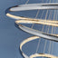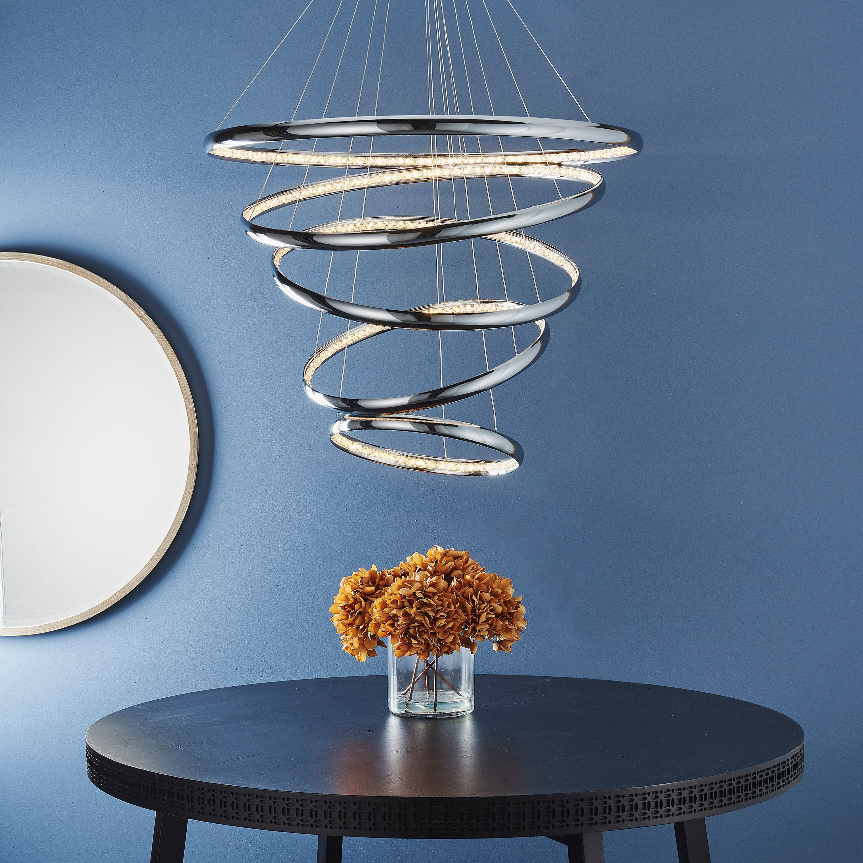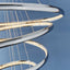 An impressive contemporary multi hoop LED pendant. Polished chrome concentric circles enclose clear crystals that diffuse the integrated LED light, creating a stunning modern design. Delicately suspended from height adjustable clear cables.
