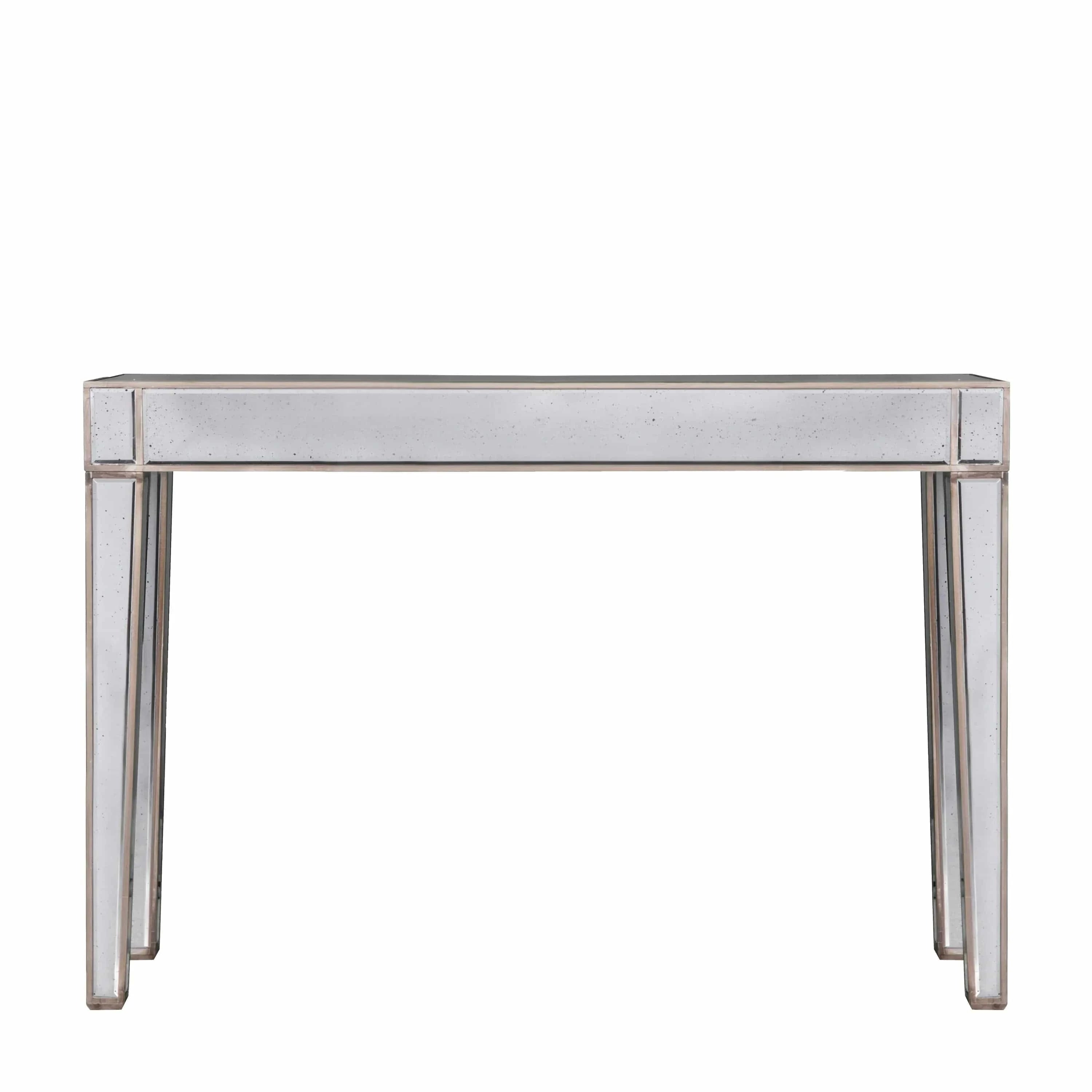 Introducing the Pattington Mirror Console Table, the perfect addition to any contemporary home. With its antique finish and black painted details, this table exudes a well-loved charm. The glass panels are complemented by a soft silver finish on the edging, adding a touch of elegance to any room.