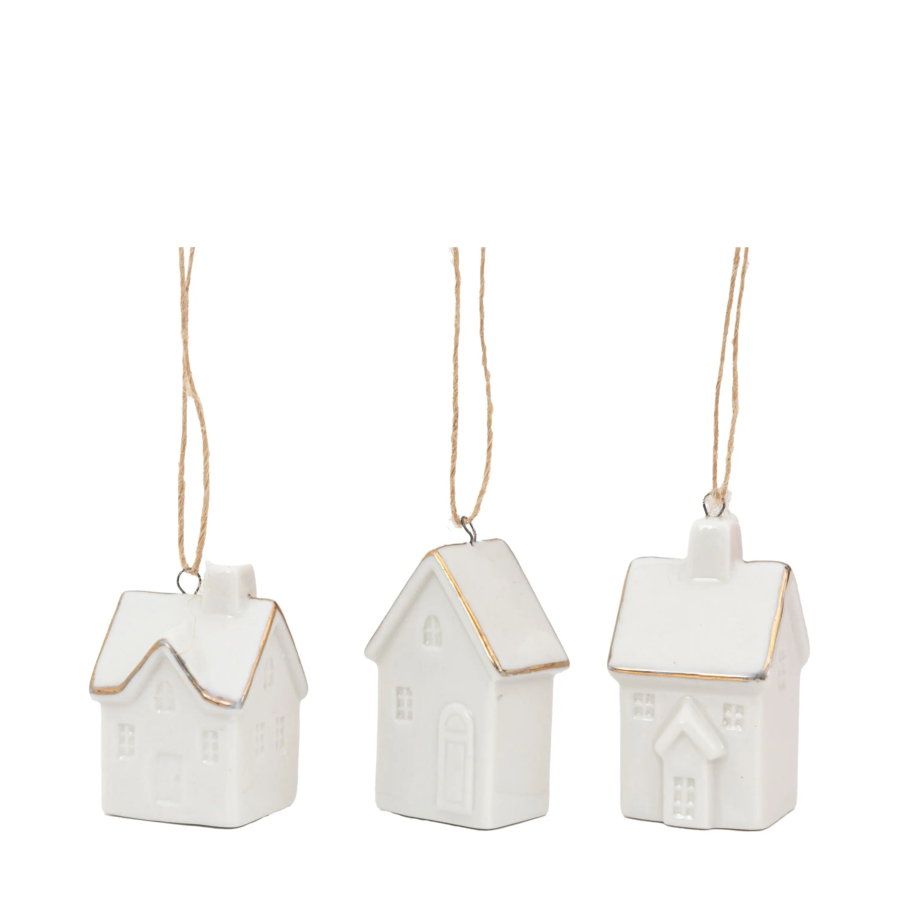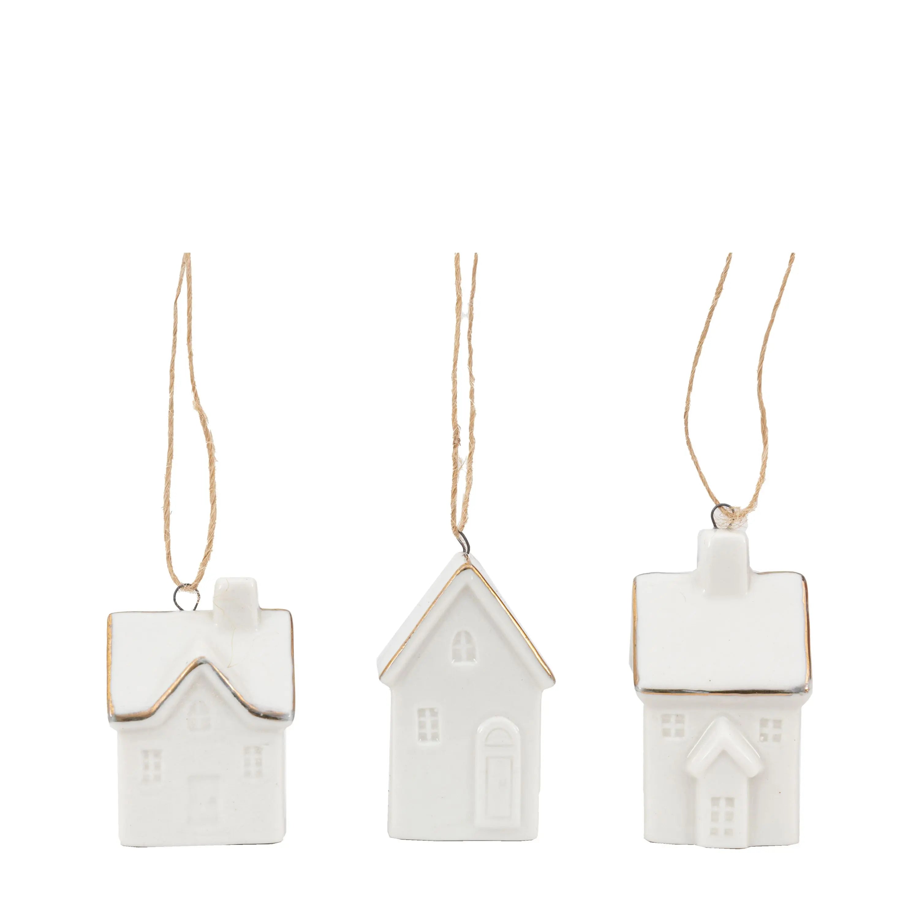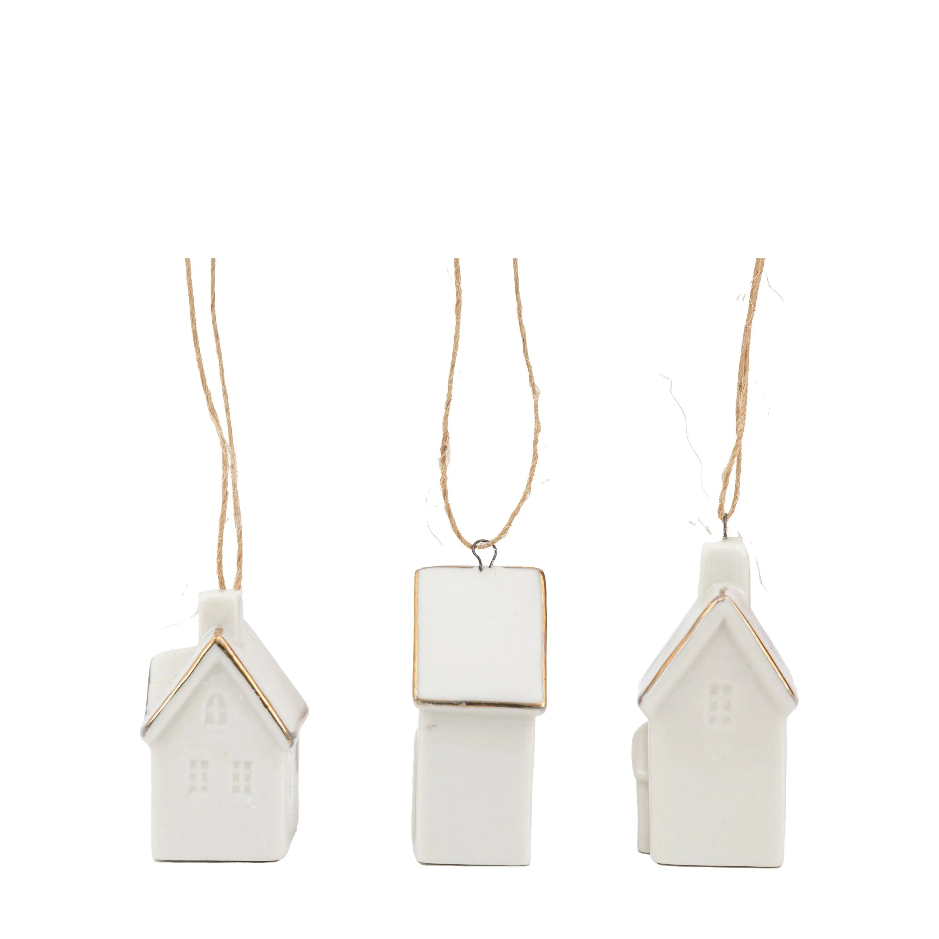 A trio of cosy little homes, these miniature houses are finished in a pearly white glaze with shiny gold highlights adding a touch of luxe, perfect for your Christmas tree.