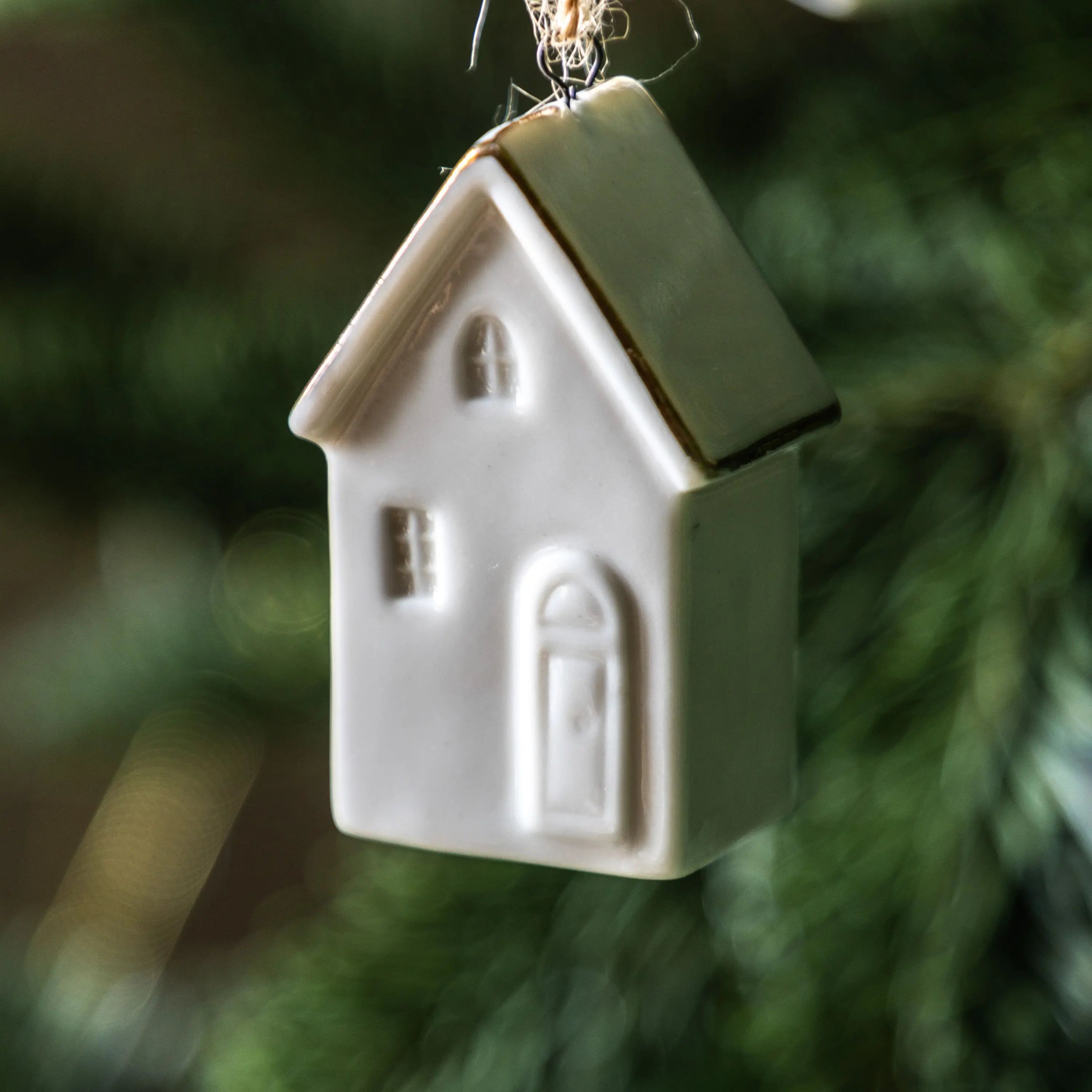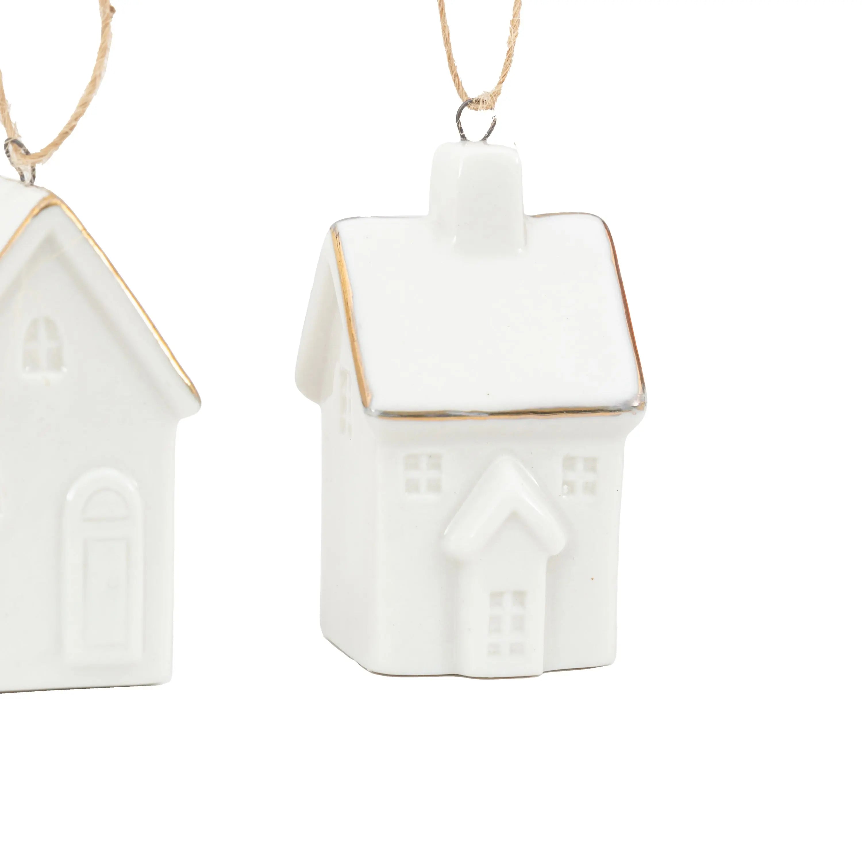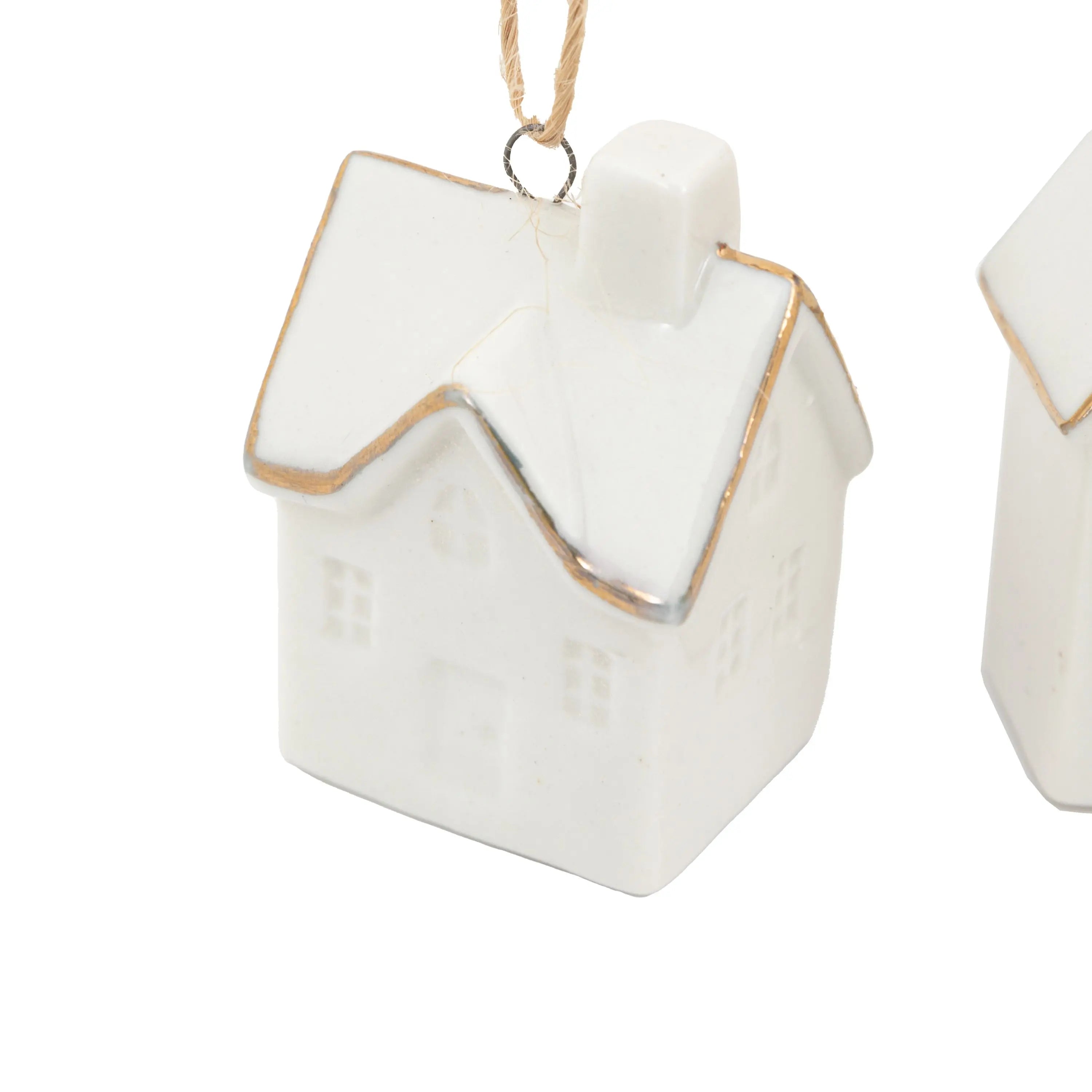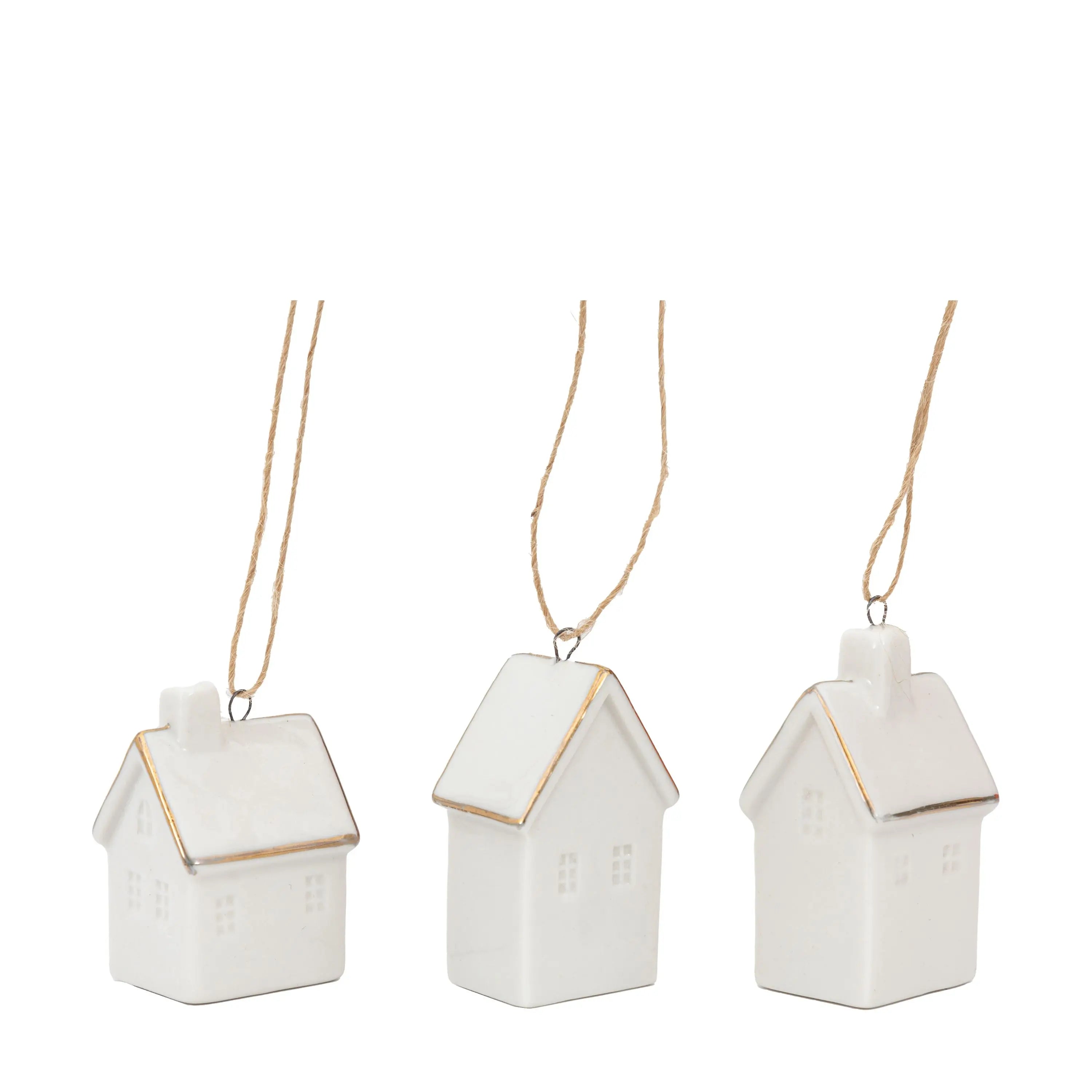A trio of cosy little homes, these miniature houses are finished in a pearly white glaze with shiny gold highlights adding a touch of luxe, perfect for your Christmas tree.