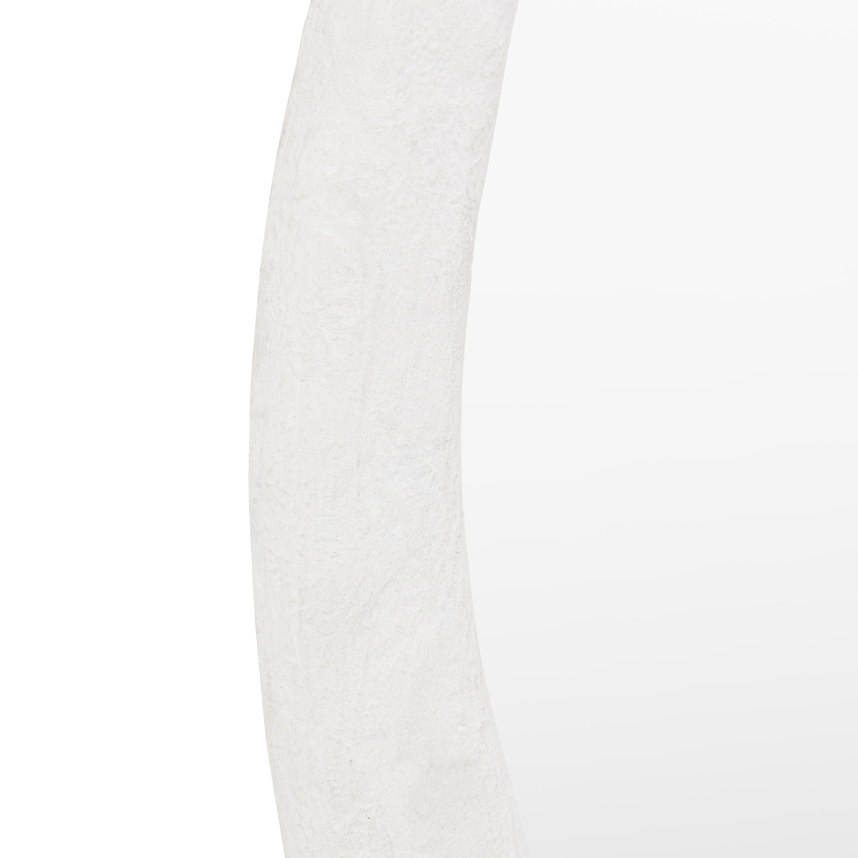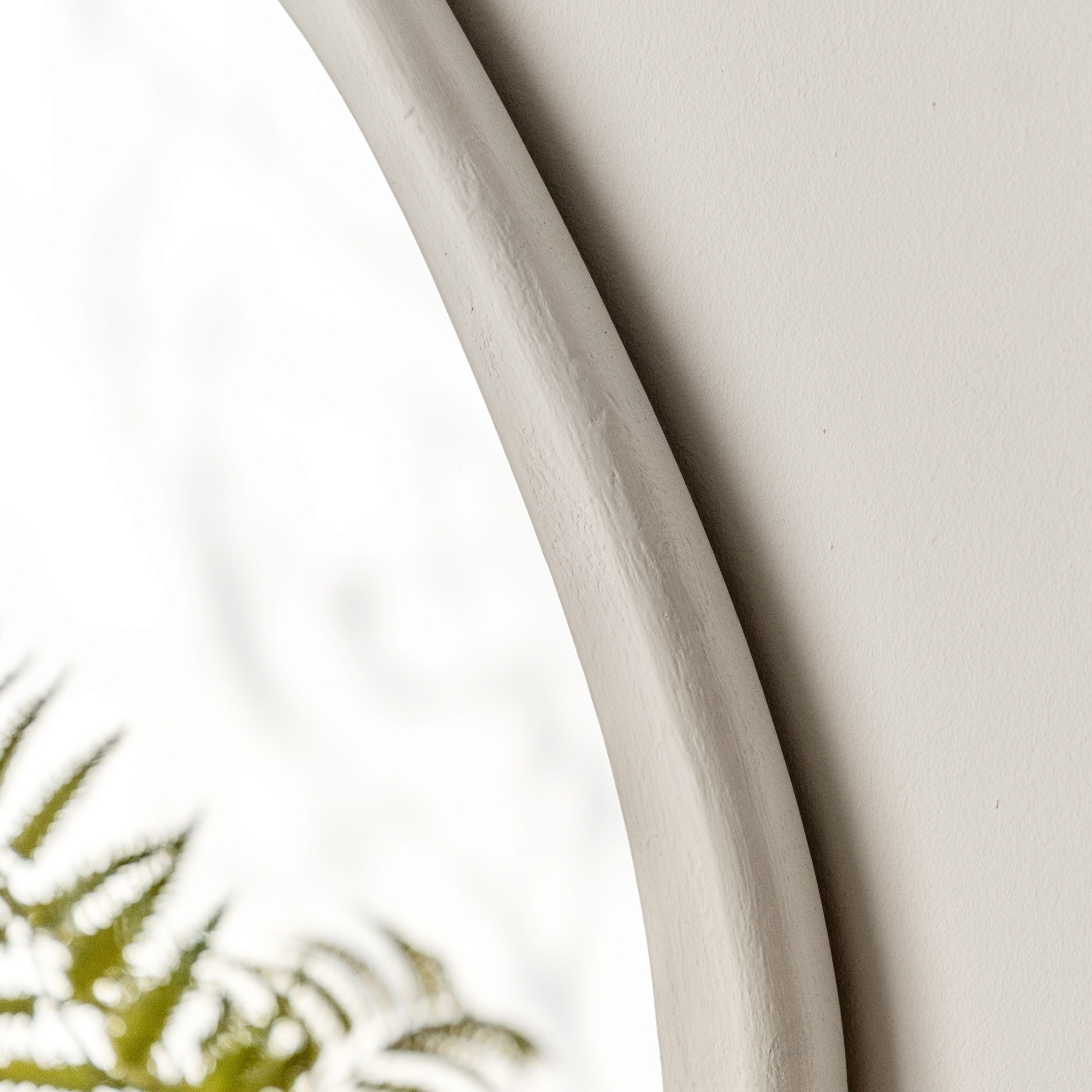 Round mirror with a white, concrete-effect frame and wavy, irregular edges. The mirror appears to have a unique, artistic design, with a modern and slightly organic feel due to its uneven frame. This kind of mirror would be a statement piece in any room, adding a blend of industrial and natural elements.