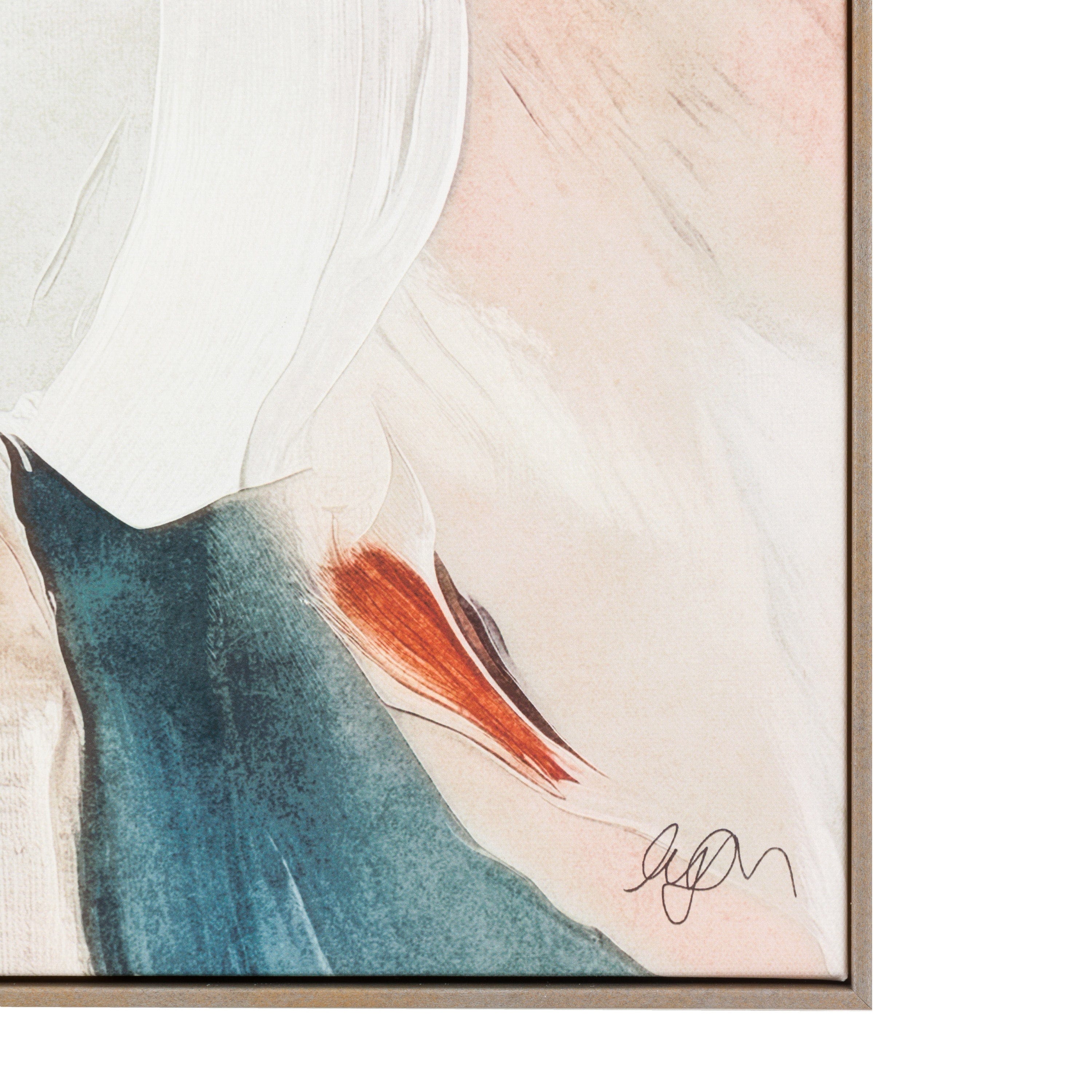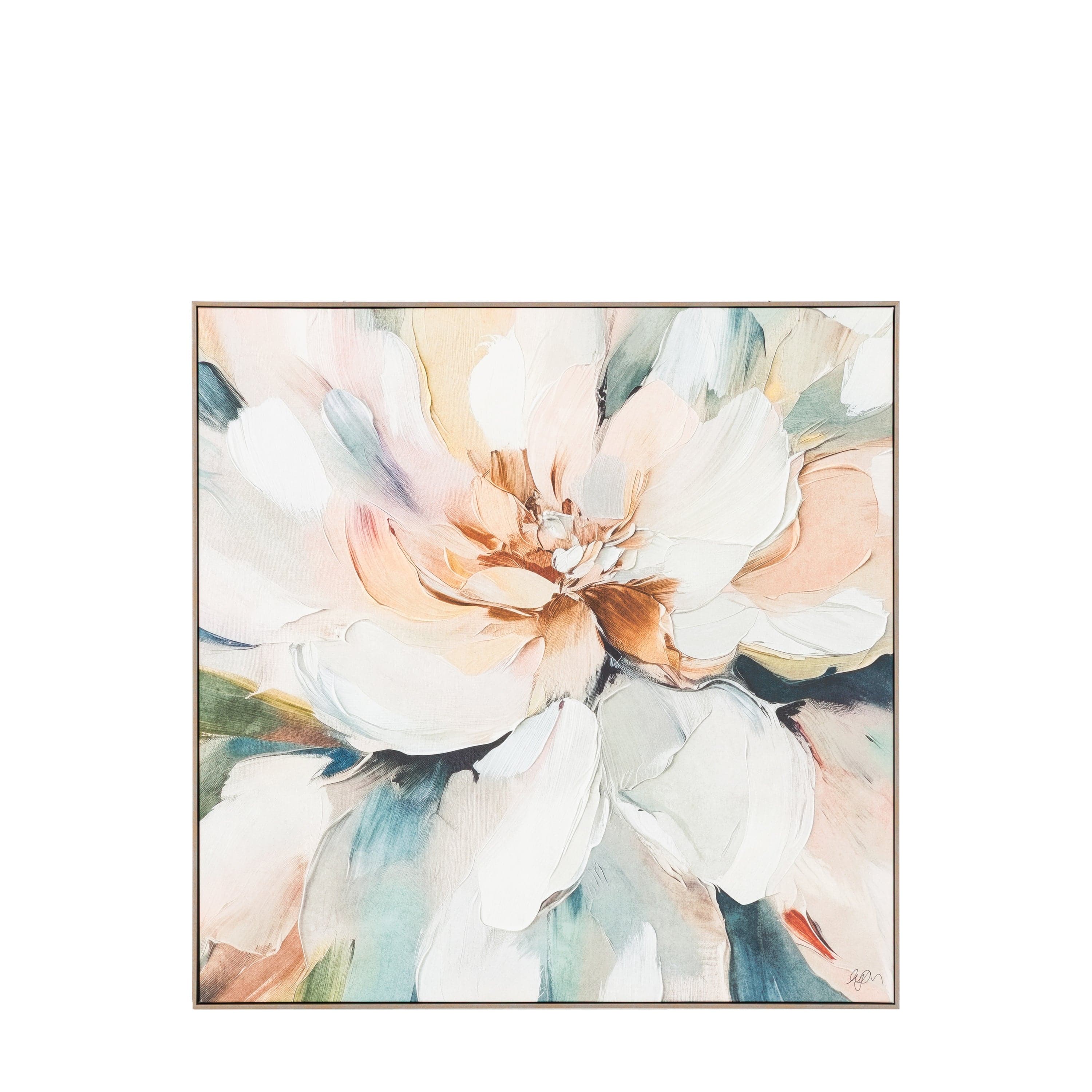 Get up close to the stunning beauty of flowers with this captivating canvas. In expressive, loose brushstrokes, the delicate petals come to life, filling the canvas in a soft palette of dusky pinks, whites, warm beiges and contrasting dusty blues and greens. The canvas is surrounded by a mottled, dusty pink frame, ready for hanging.