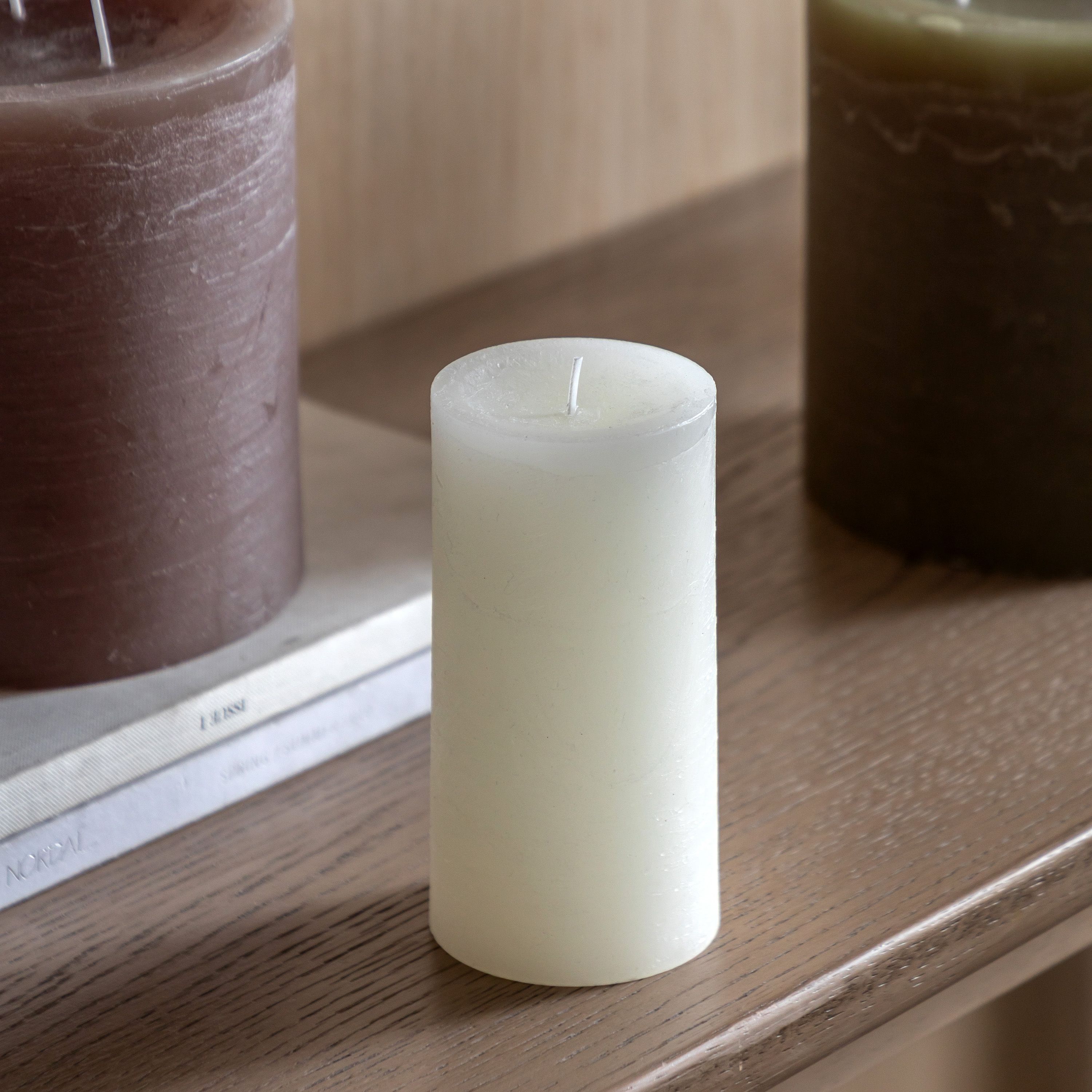Classic ivory pillar candle, perfect addition to a candlestick or lantern. Burn time of approximately 85 hours.