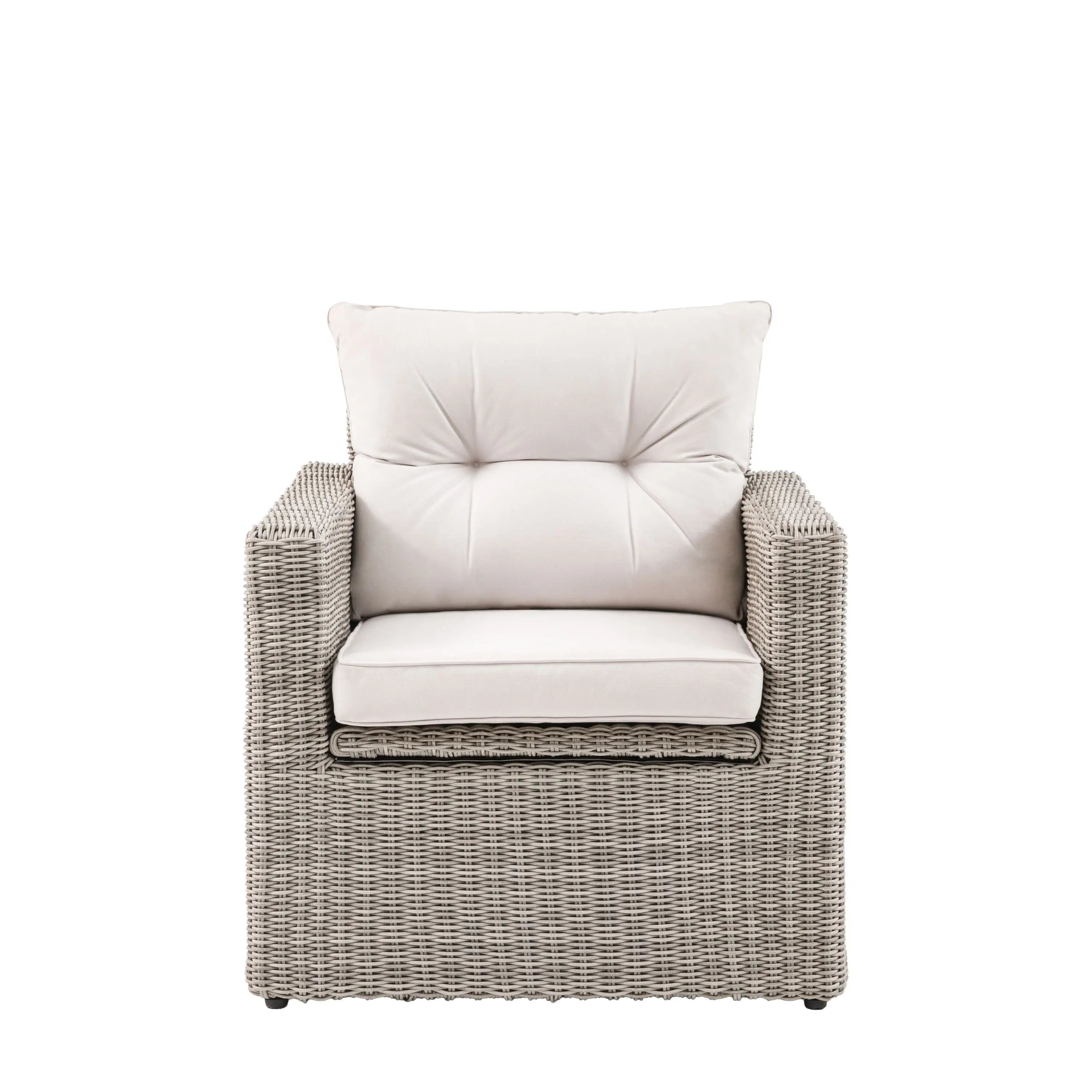 This stylish outdoor armchair offers both comfort and practicality. Crafted with a blend of natural wicker and plush cushions, it provides a relaxing and inviting seating option. The neutral colour palette complements any outdoor decor, while the durable construction ensures years of enjoyment. And with under seat storage, you can keep your outdoor essentials organised and within easy reach.