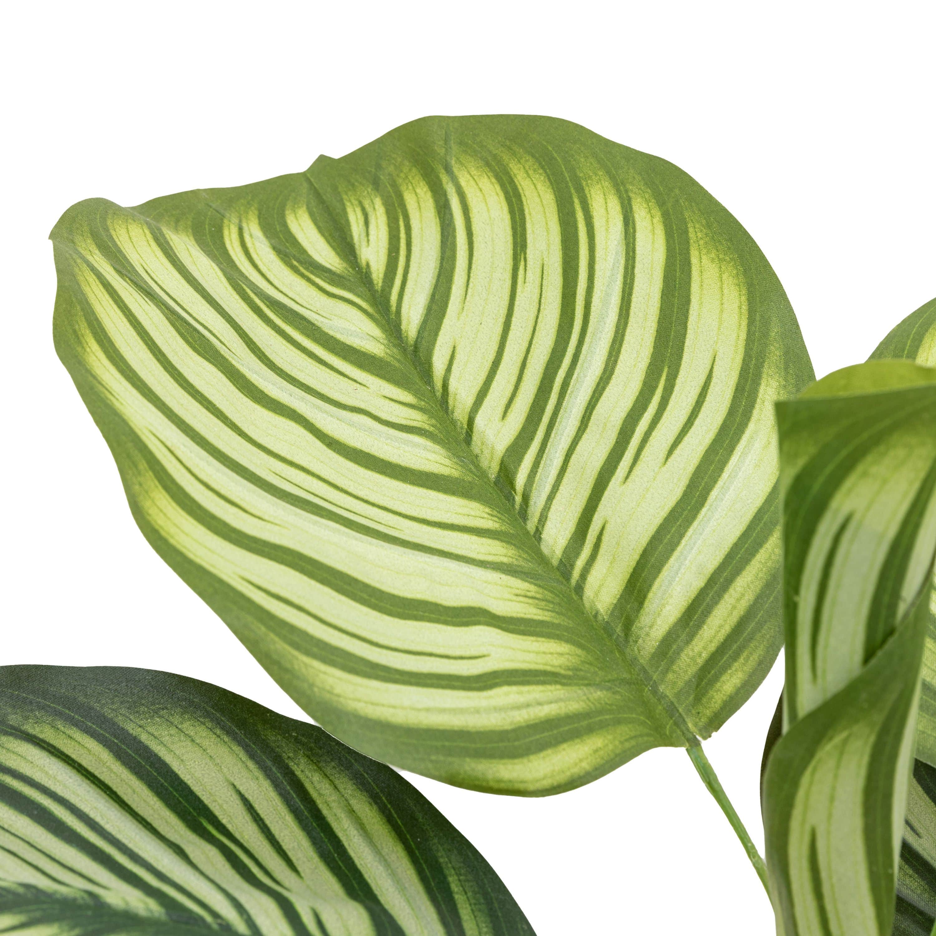Introducing the Potted Calathea Leaf Tree Small, the perfect solution for those who want the beauty of a plant without the hassle of maintenance. This faux plant features large, vibrant patterned leaves that add a tropical touch to any room. With its verdant jungle vibe, it will bring life and color to your space without the need for watering or pruning.