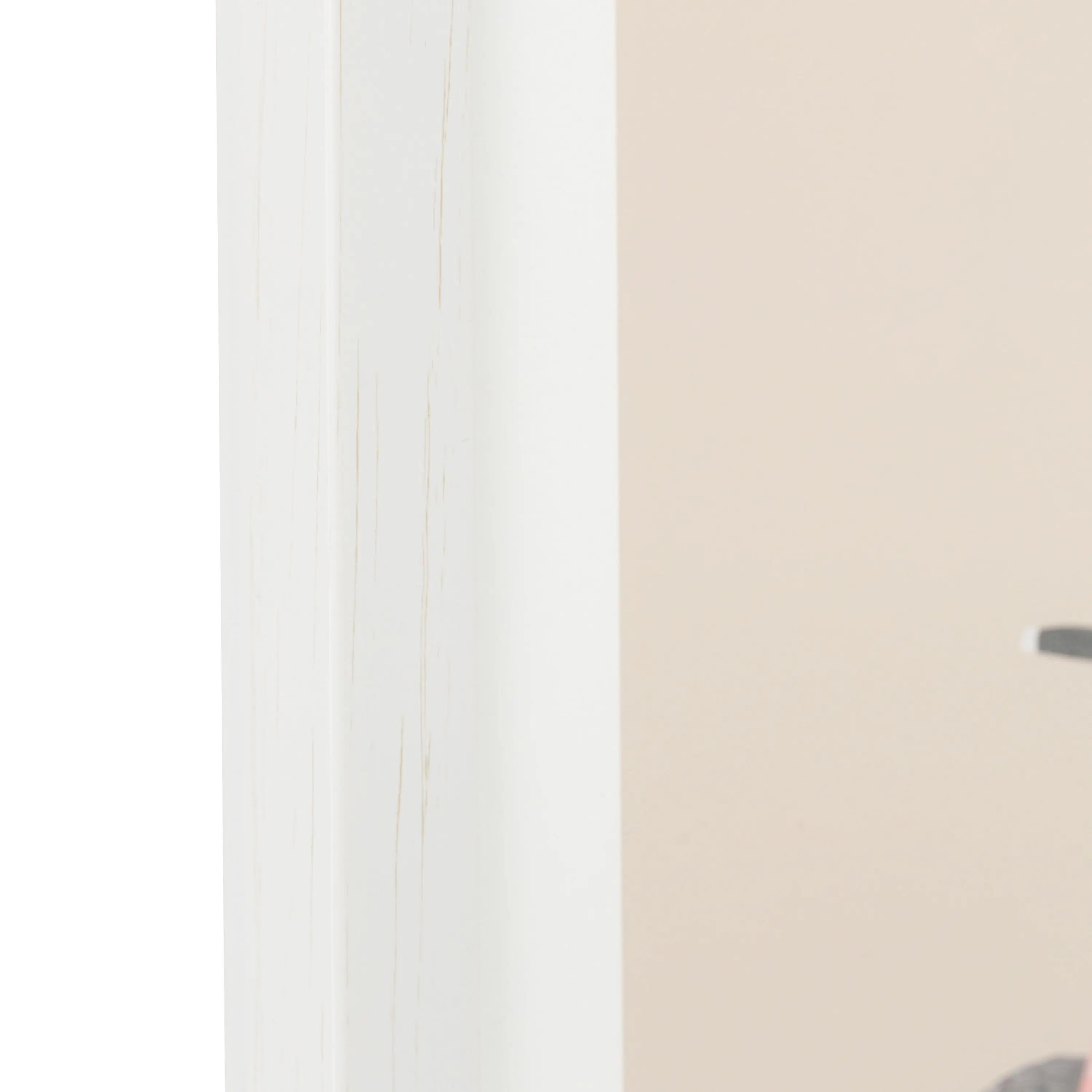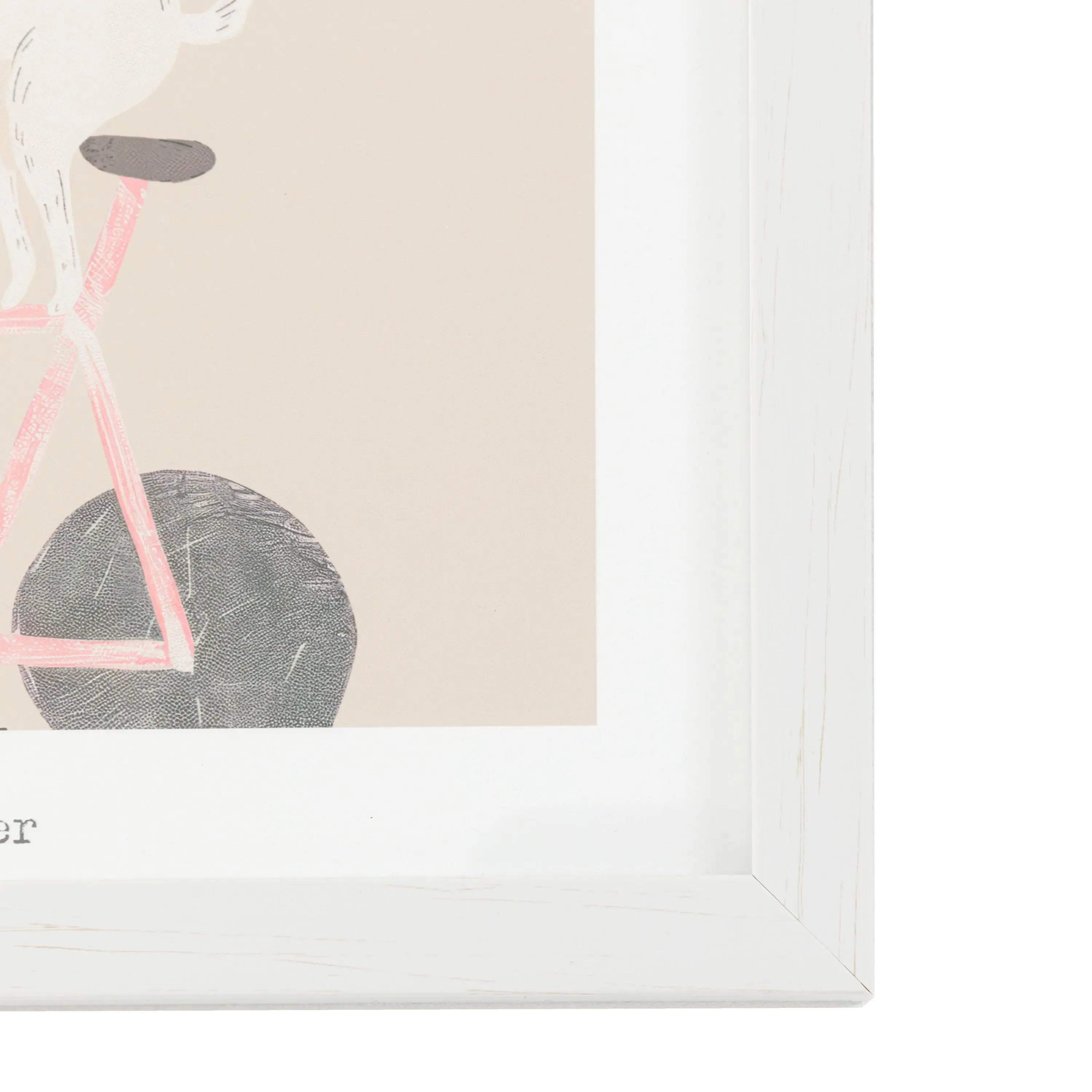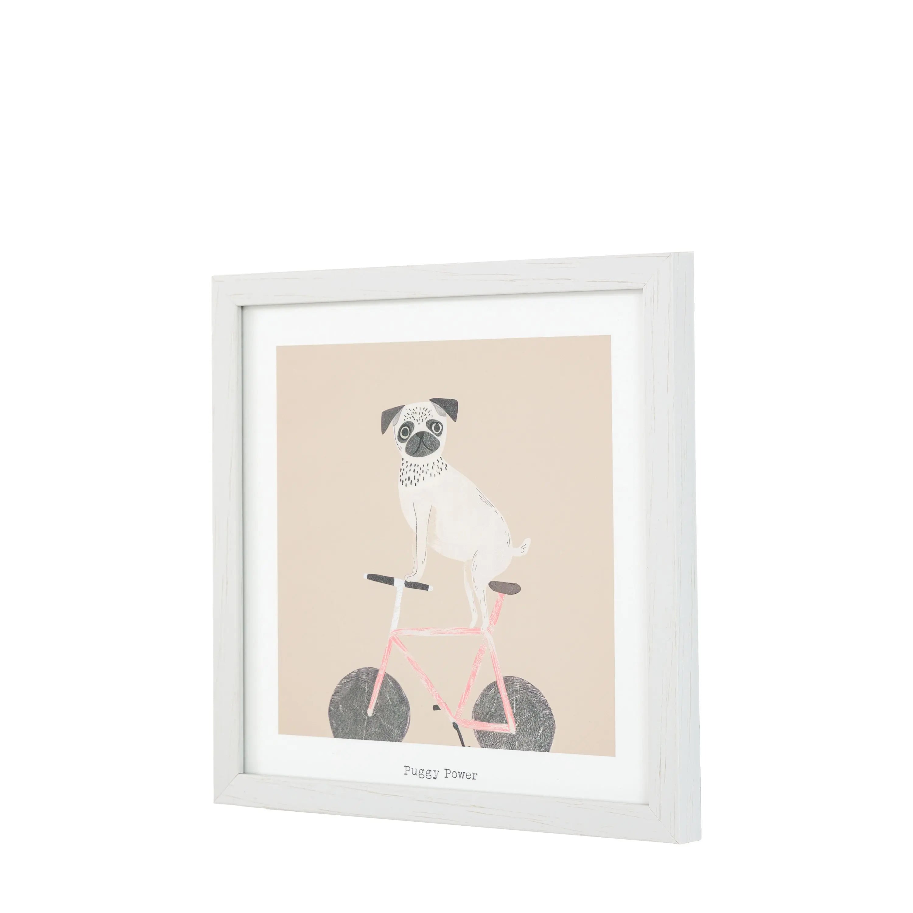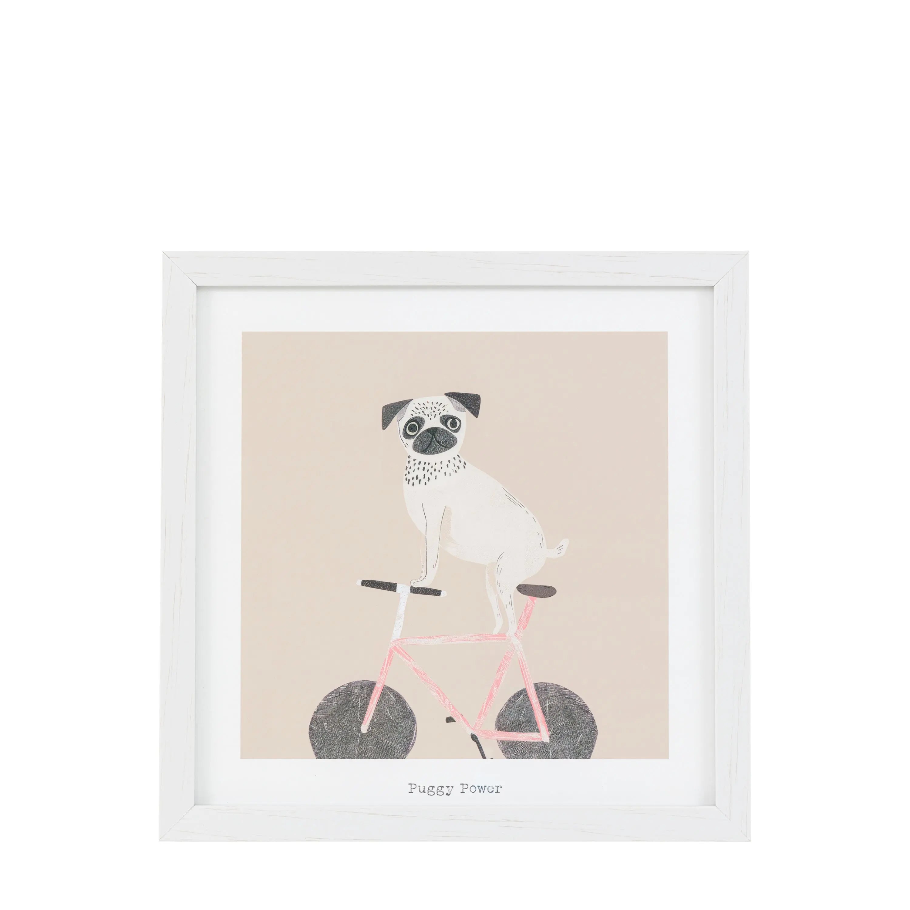 Add a little whimsy to a room with this charming illustration of a cheeky little pug playfully riding a bicycle. With a pretty palette of muted pinks, creams and beiges, the print is complemented by a simple off white wood effect frame.