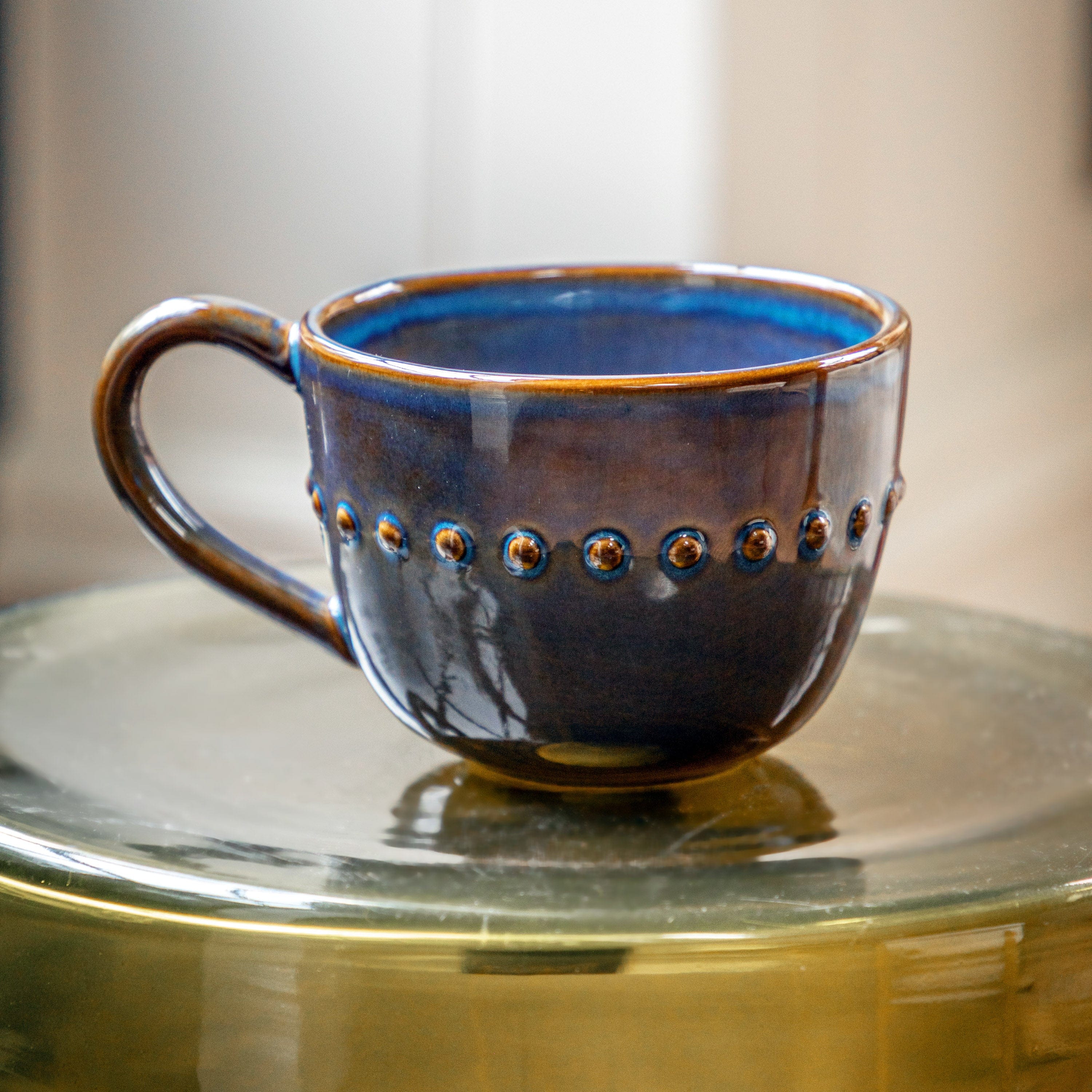 Offered as a set of 4, these beautifully organic mugs evoke a true sense of the term hand crafted. Put through several layers of kiln firing, the reactive nature of this 'slip' glaze style ensures that each mug reacts in the kiln slightly diffently, offering a sense of uniquiness to every piece. The rich ink blue glaze is offset by the warm brown base colour, visible on the handle and across the horizontal bead pattern.