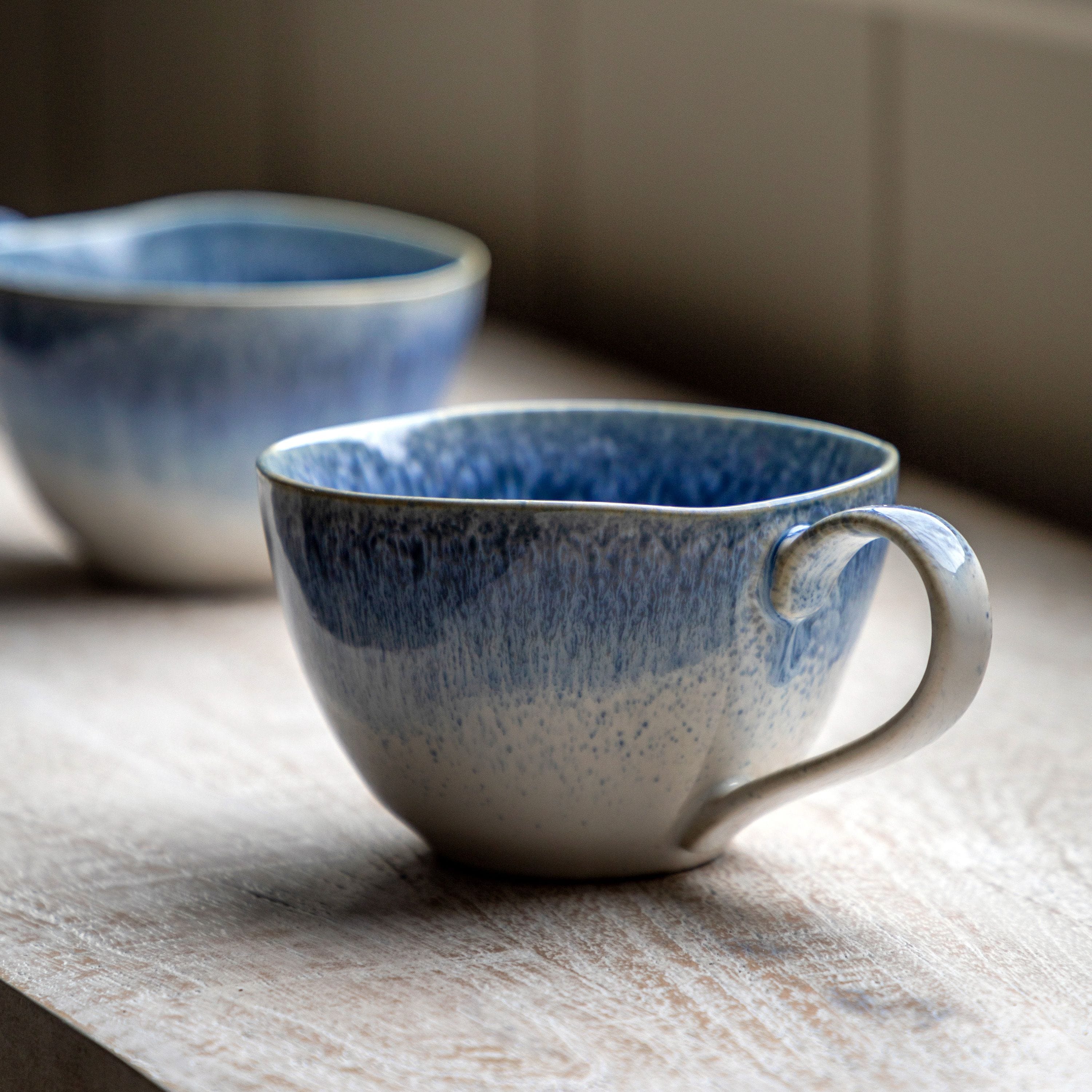 Introducing the Reactive Organic Mug Ink Blue 4pk, available now at House of Isabella. These stunning mugs are hand crafted and feature a unique `reactive` glaze style that creates a one-of-a-kind look for each piece. With a soft eau de nil color, these mugs are perfect for both contemporary and classic interiors. And the best part? They come in a convenient set of 4, making them perfect for entertaining or everyday use.