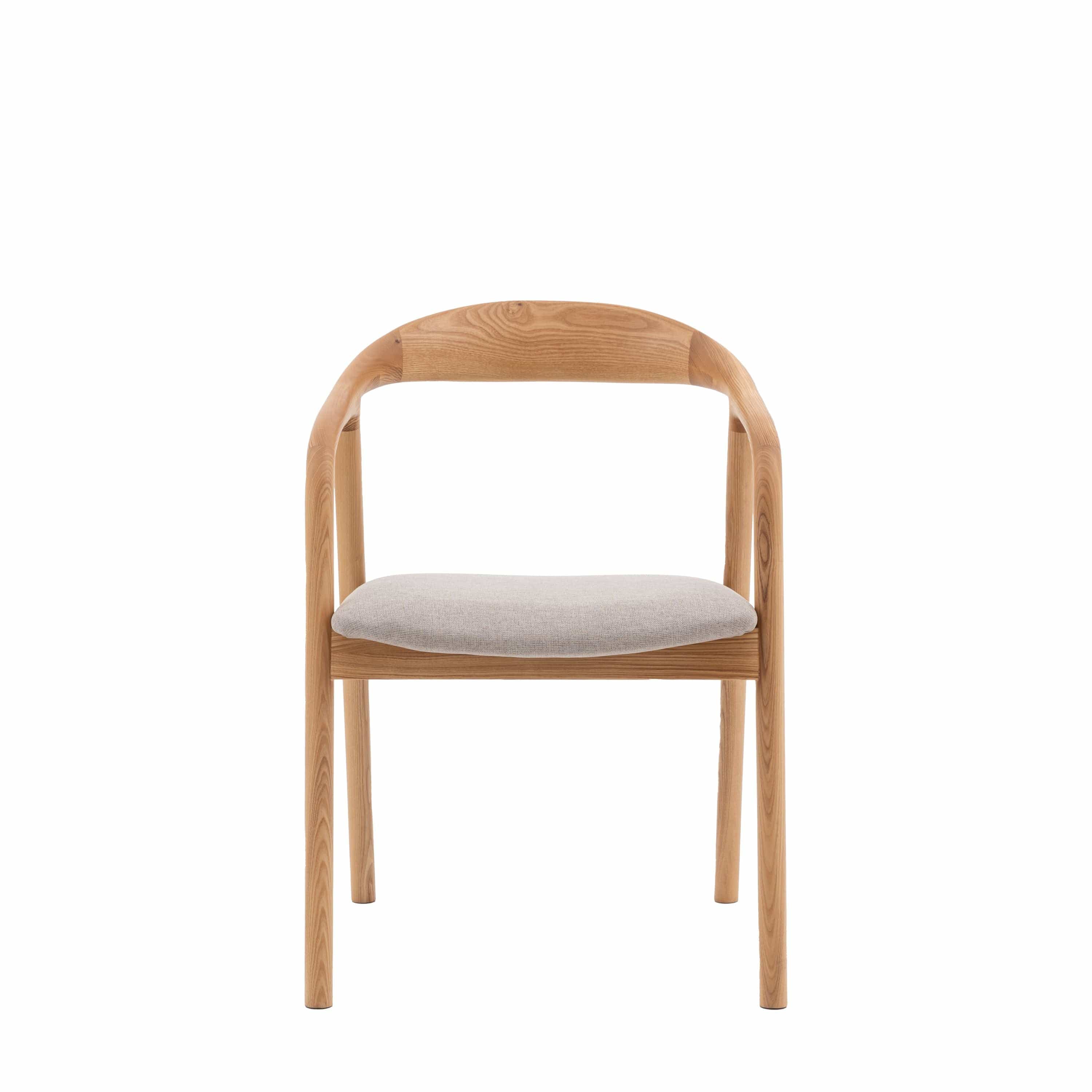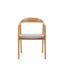 This dining chair is a stylish and comfortable addition to any dining space. Its curved backrest and armrests provide excellent support, while the tapered legs create a minimalist and modern look. The upholstered seat offers comfort and style, while the natural wood finish adds warmth and character.