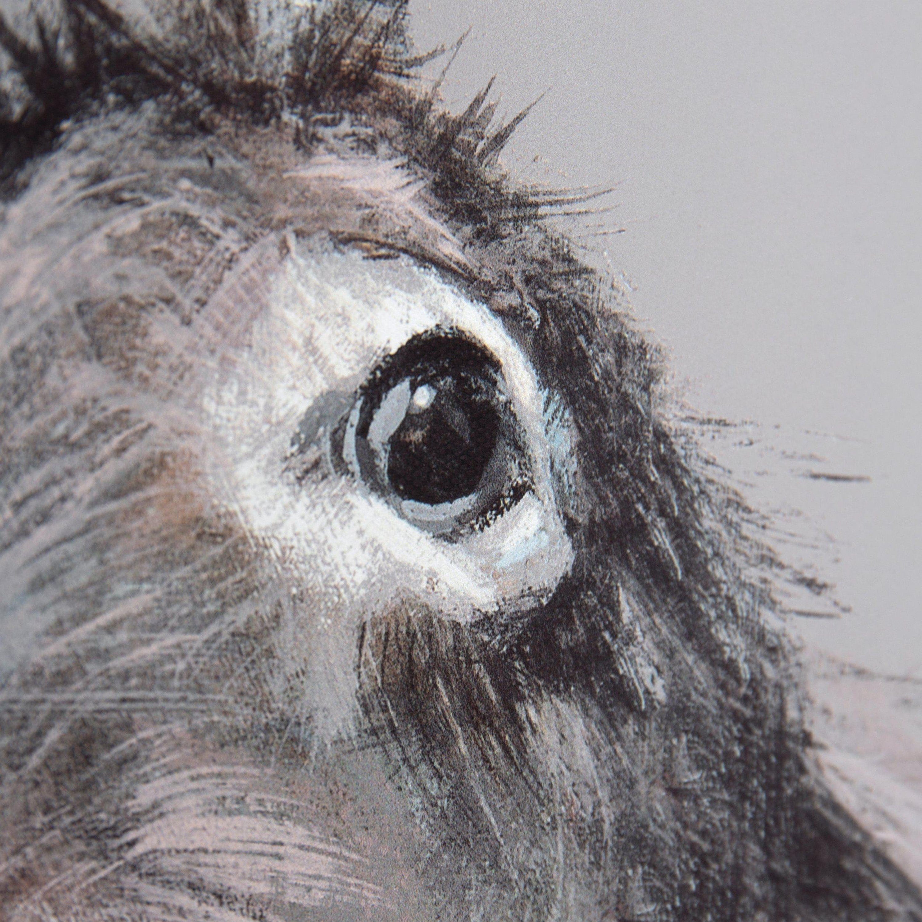 A social animal that enjoys the company of others: meet Reggie. Adelene Fletcher favours a muted colour palette with a scope of variety to illustrate the coarse fur of the mammal. The donkey's friendly disposition is beautifully captured through its heart-warming facial expression. The charming print presents itself in a light grey with white lip, unglazed frame.