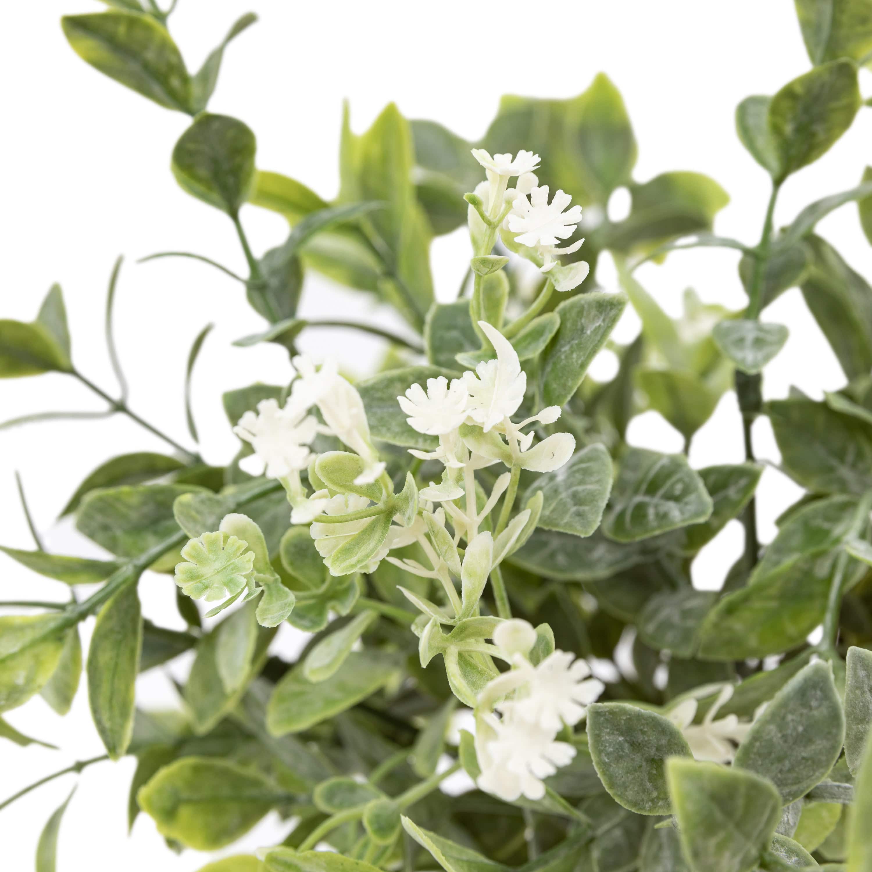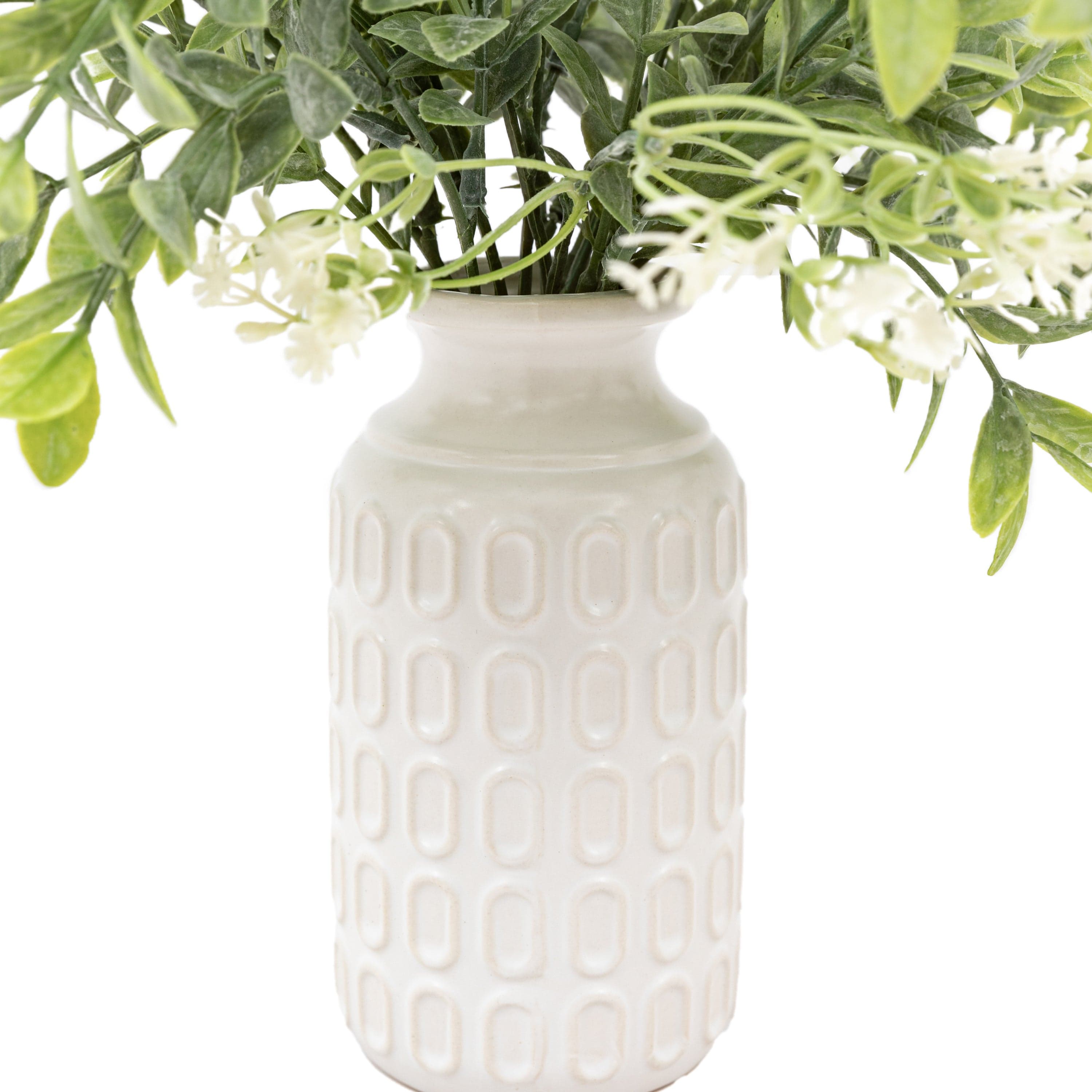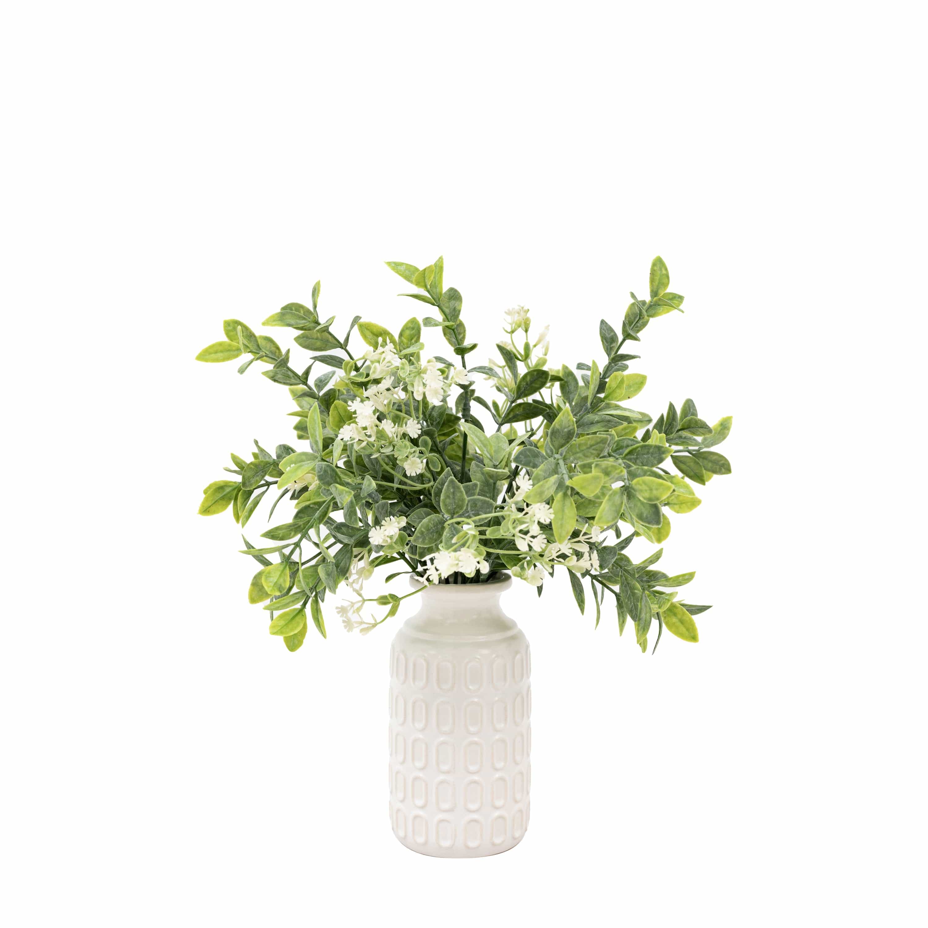Bursting with style this retro vase is just what your room needs. The soft meadow foliage is complimented by on trend white retro patterned vase.