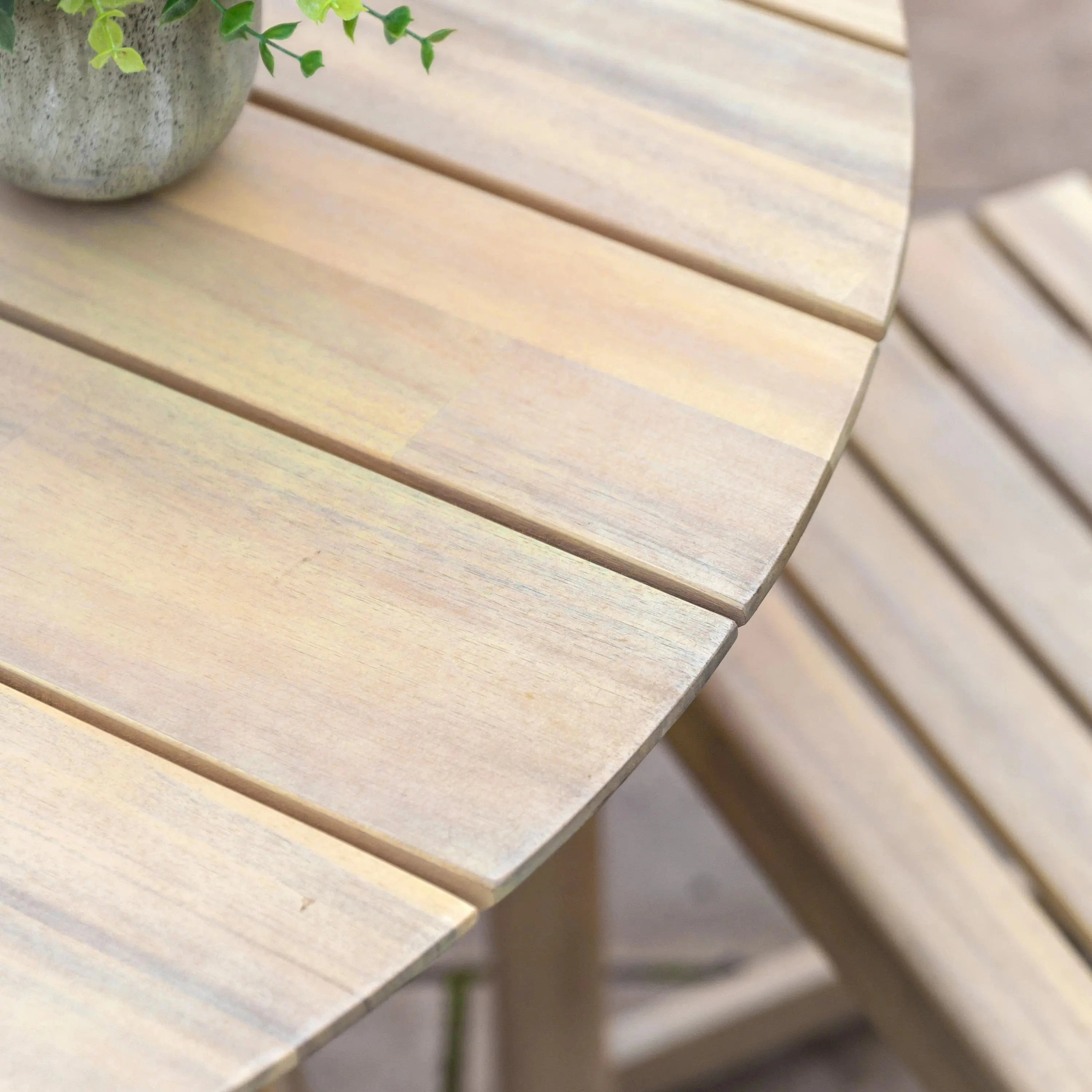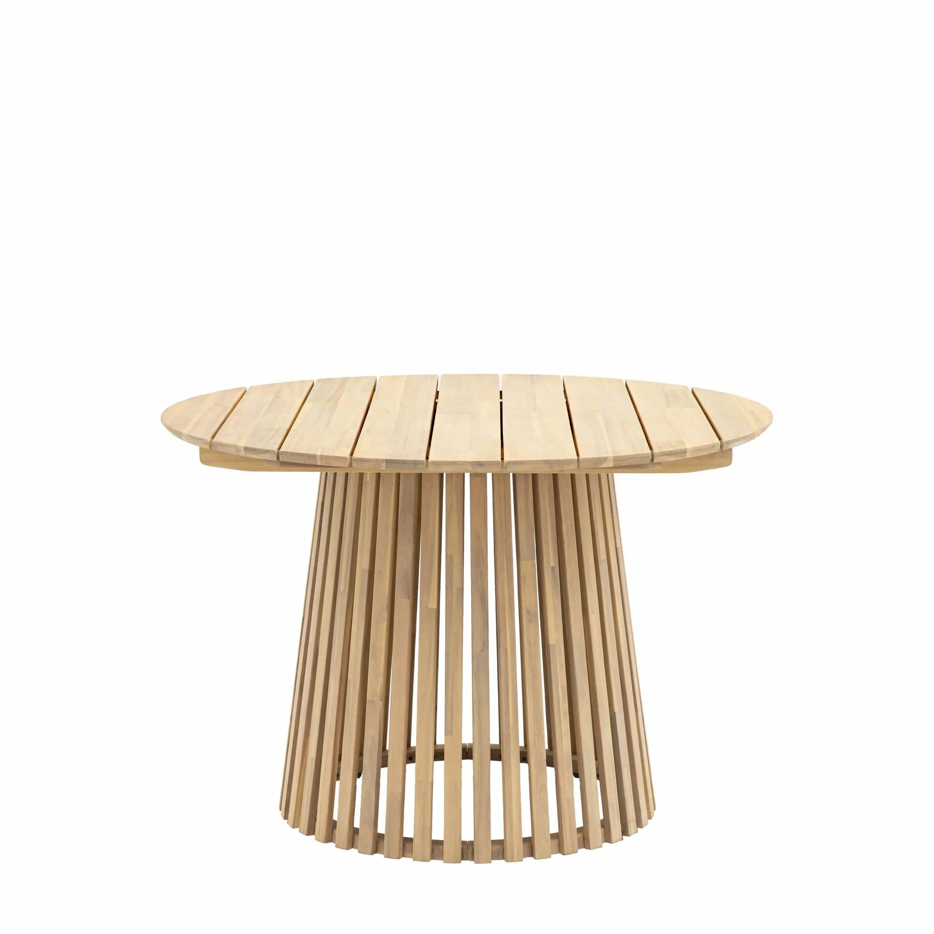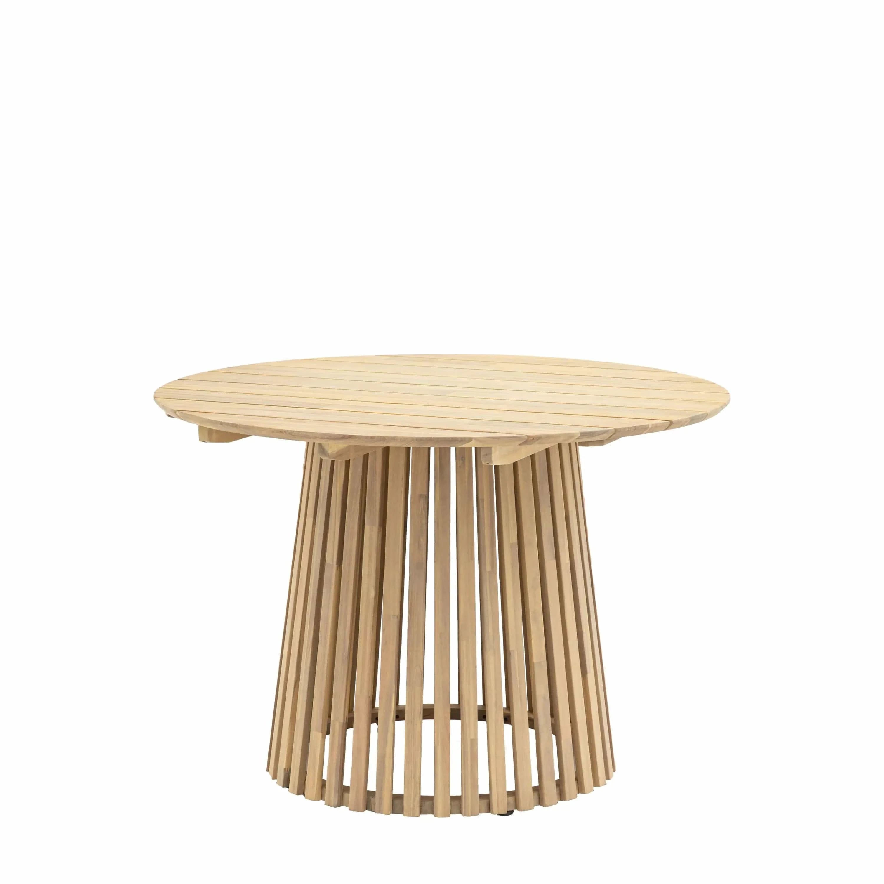 Introducing the Rialto Round Dining Table 4 Seater - the perfect addition to your outdoor space. Made from durable acacia wood, this elegant table features a circular top and a striking slatted base. Its natural color adds warmth and sophistication to any patio or garden setting. With ample space for dining, it's ideal for hosting gatherings or enjoying meals al fresco.