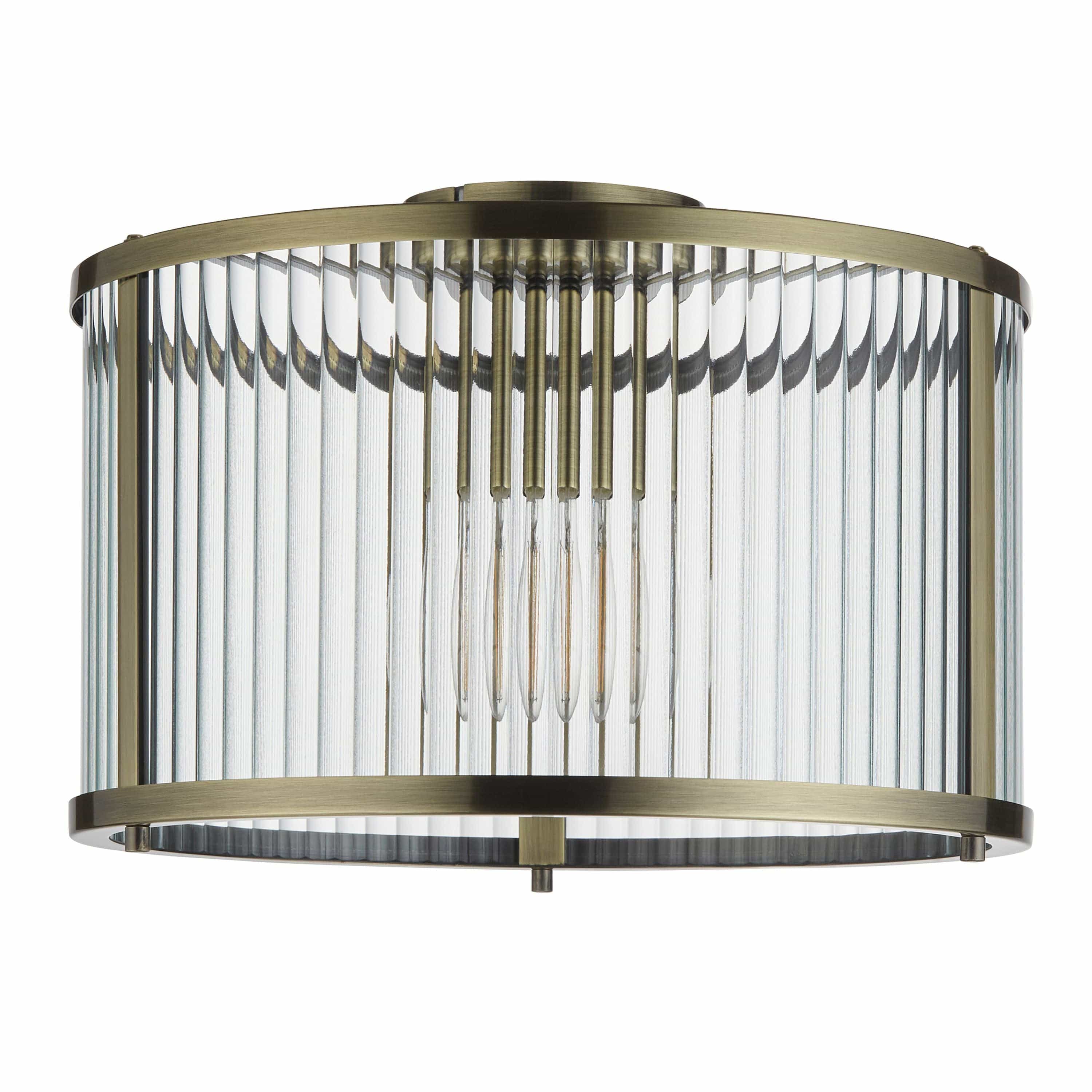 Ridgeton 1 Ceiling Light is a timeless classic flush light that adds a touch of elegance to any room. With its antique brass plated metalwork and clear ribbed glass panel shades, this light beautifully diffuses the light. It is perfect for low ceiling rooms and can be paired with the matching pendant light for a coordinated look.