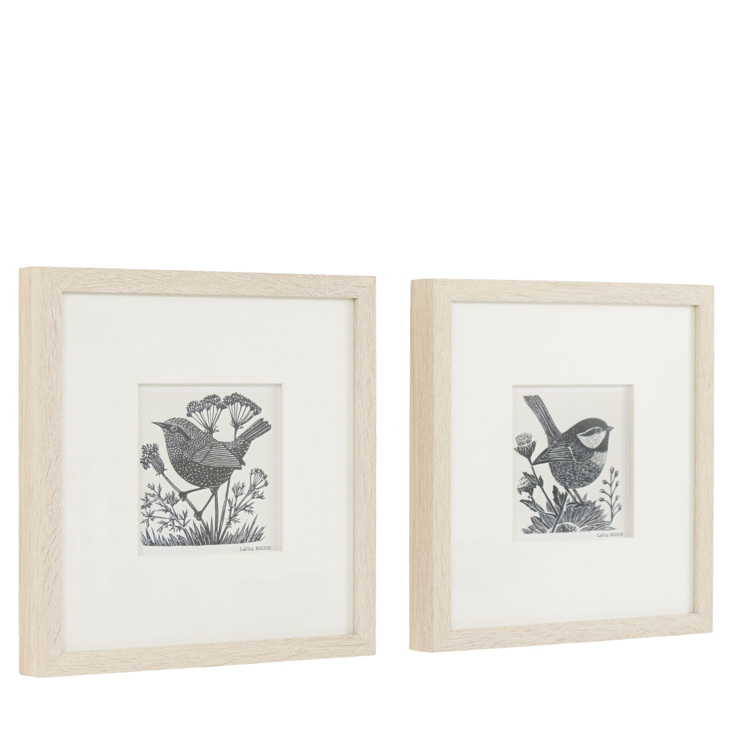 A delightful duo of small bird illustrations, each surrounded by blooming wildflowers. The crisp black and white design and fine detailing give these prints a charming, handcrafted feel. Presented in a frame with a pale oak finish, they bring warmth and whimsy to any space, perfect for adding a touch of charm to cosy interiors.