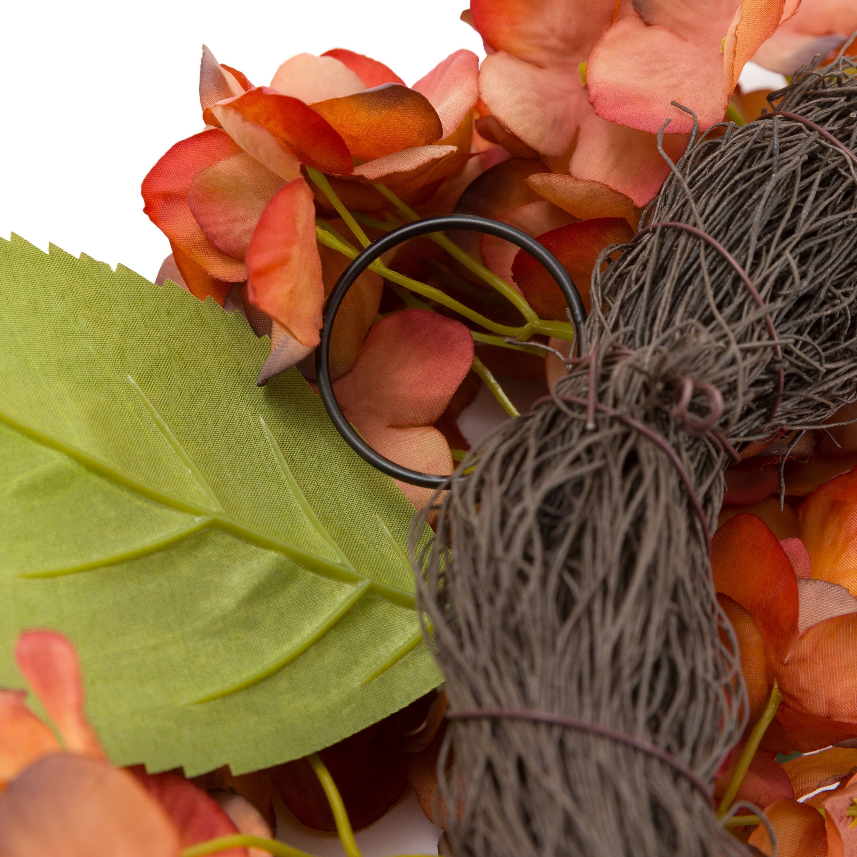Bursting with realistic faux hydrangeas in orange tones, this wreath will add autumnal charm to any door or table centrepiece.