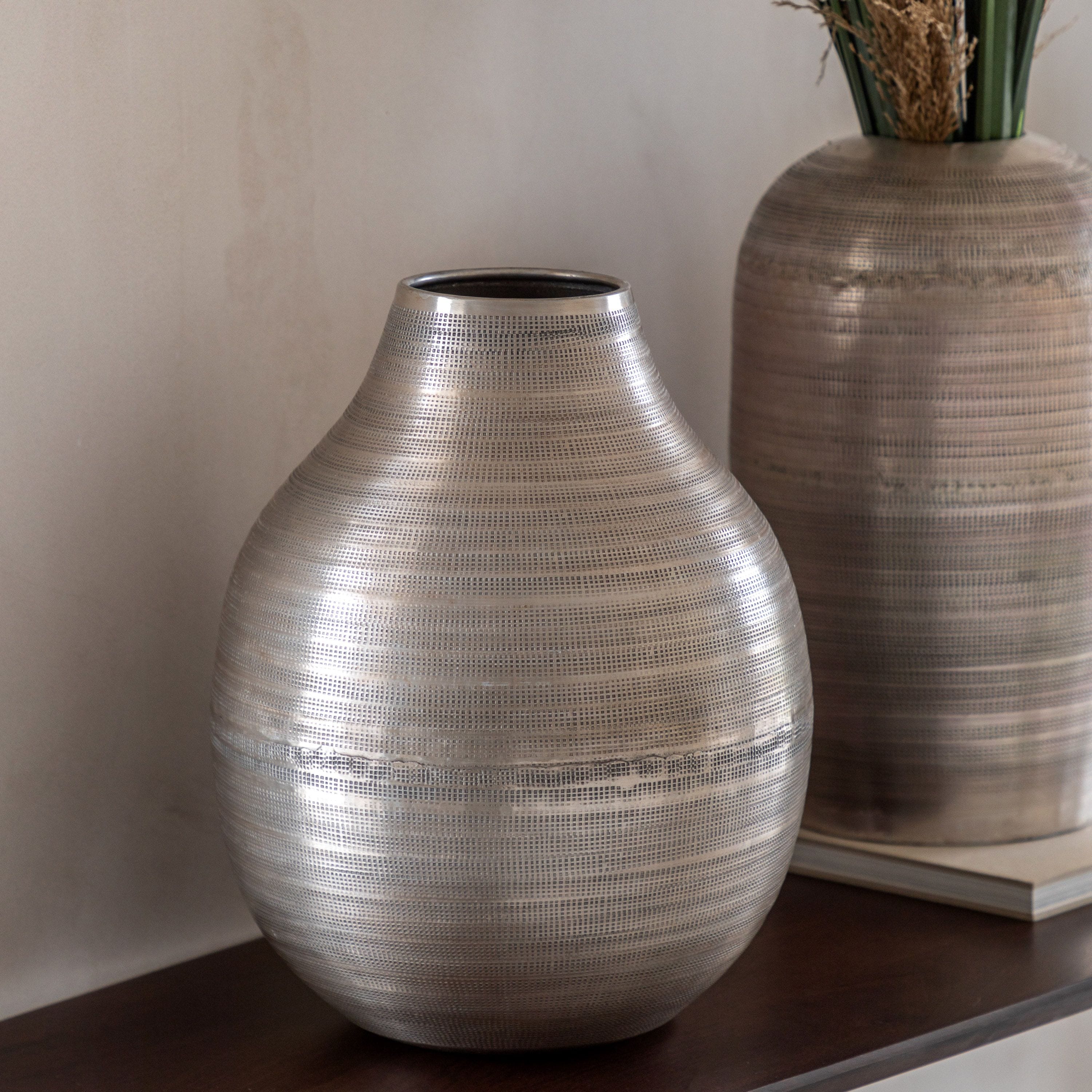 Introducing the Sahara Hammered Metal Vase Antique Silver Small, a stunning addition to any home decor. This hand-formed aluminium vase boasts a rough hand applied texture and an aged silver effect finish, giving it a unique artisanal charm. Not only is it a beautiful decorative piece, but it also adds a touch of handmade elegance to any space.