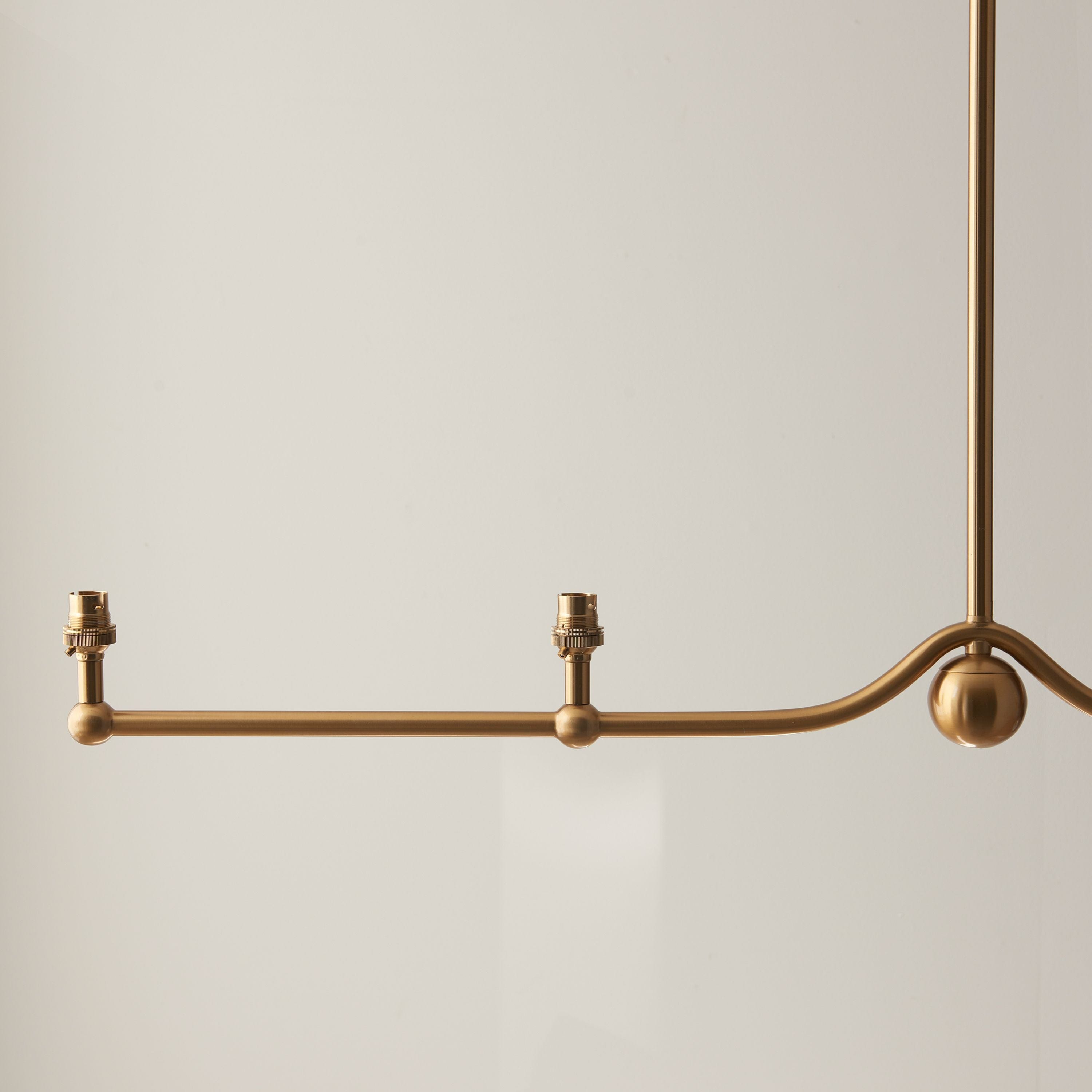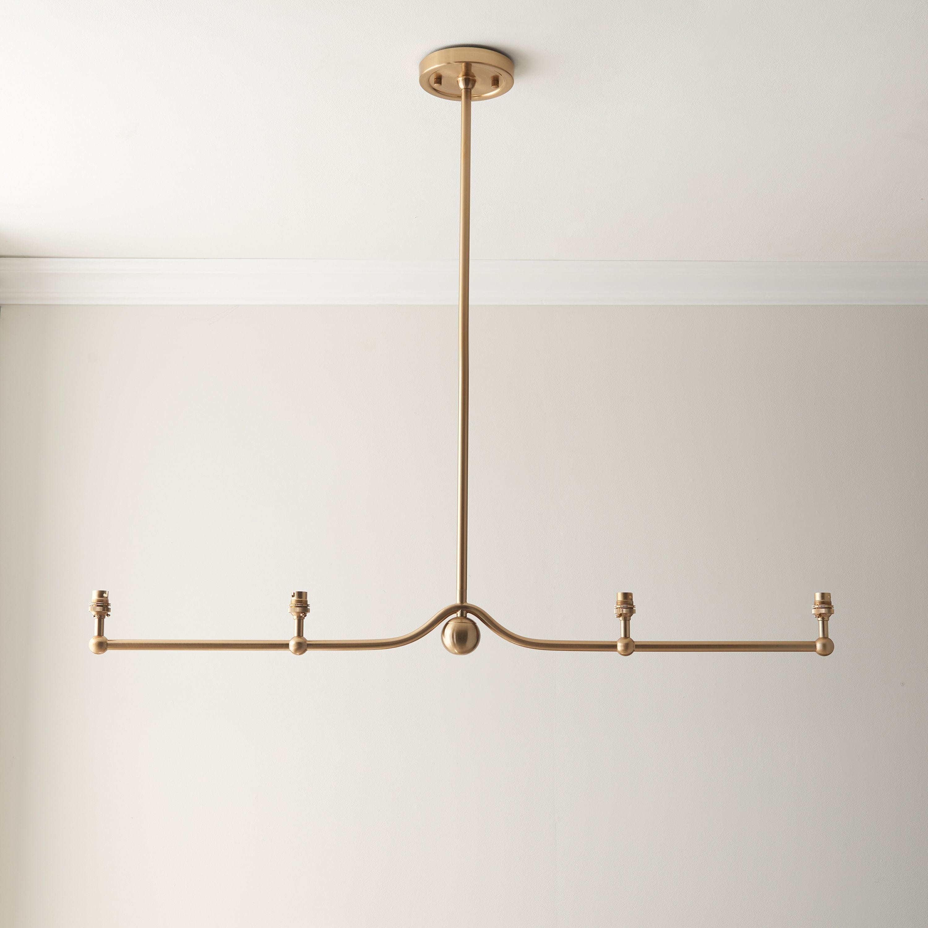 An elegant 4 light classic pendant fitting with multiple stem height options, finished in brushed aged brass and featuring B22 lamp holders for an authentic feel. This unique linear pendant with beautiful sphere detail is best positioned over dining tables helping to create a timeless look. A fitting only pendant, pair with 4 of our 16cm or 20cm decorative fabric shades to complete the look. Matching wall light, table light and ceiling chandeliers also available.