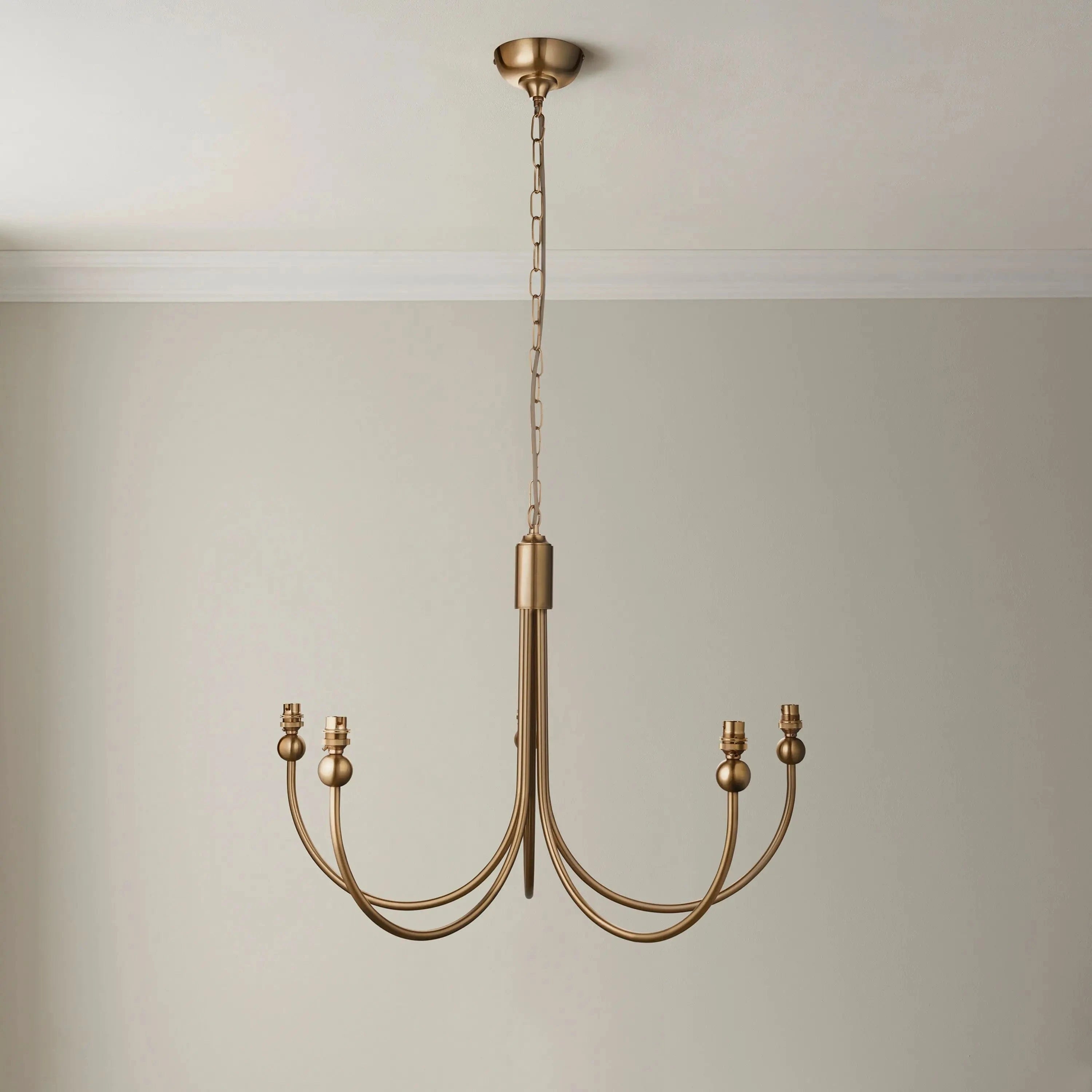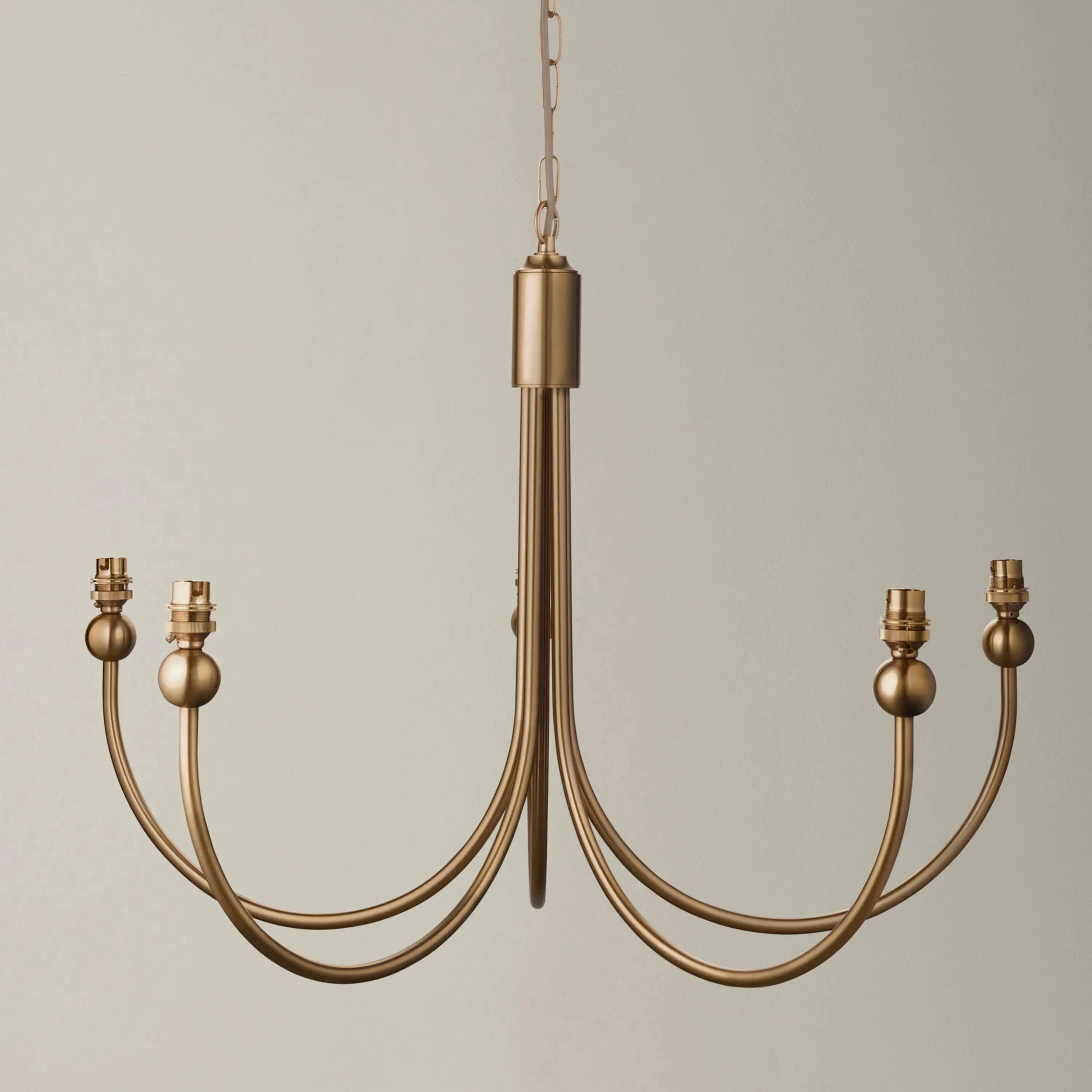 Introducing the Sandiego 5 Pendant Light Fitting Curved Brass, a stunning addition to any interior space. This elegant pendant light is inspired by classic designs from the past, but with a fresh new make-over. The brushed aged brass finish adds a touch of sophistication, while the 1.5m chain with grey braided fabric flex allows for adjustable height. With B22 lamp holders, this fitting exudes an authentic feel. Please note, this is a fitting only pendant and can be paired with 5 of our 16cm or 20cm decorative fabric shades for a complete look.