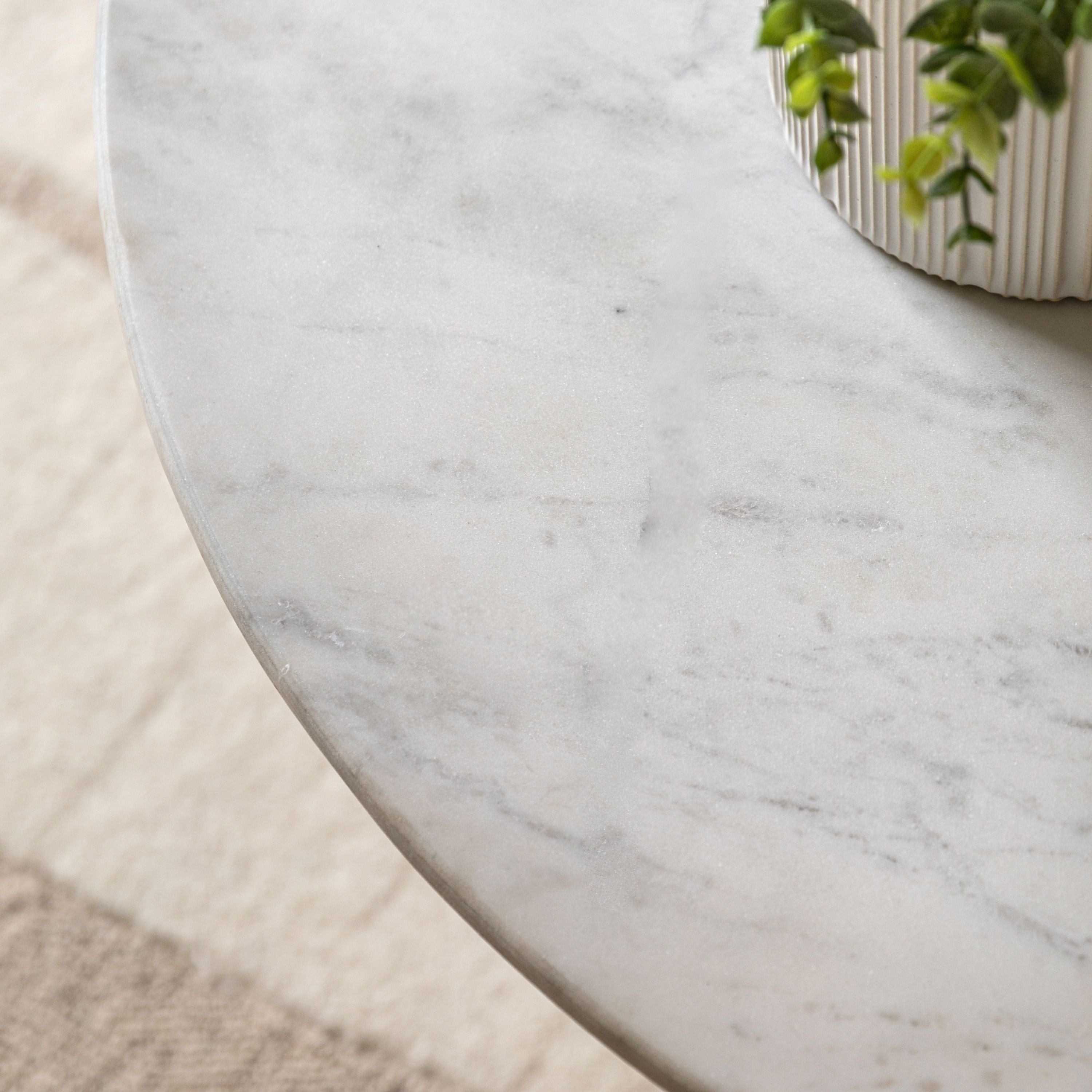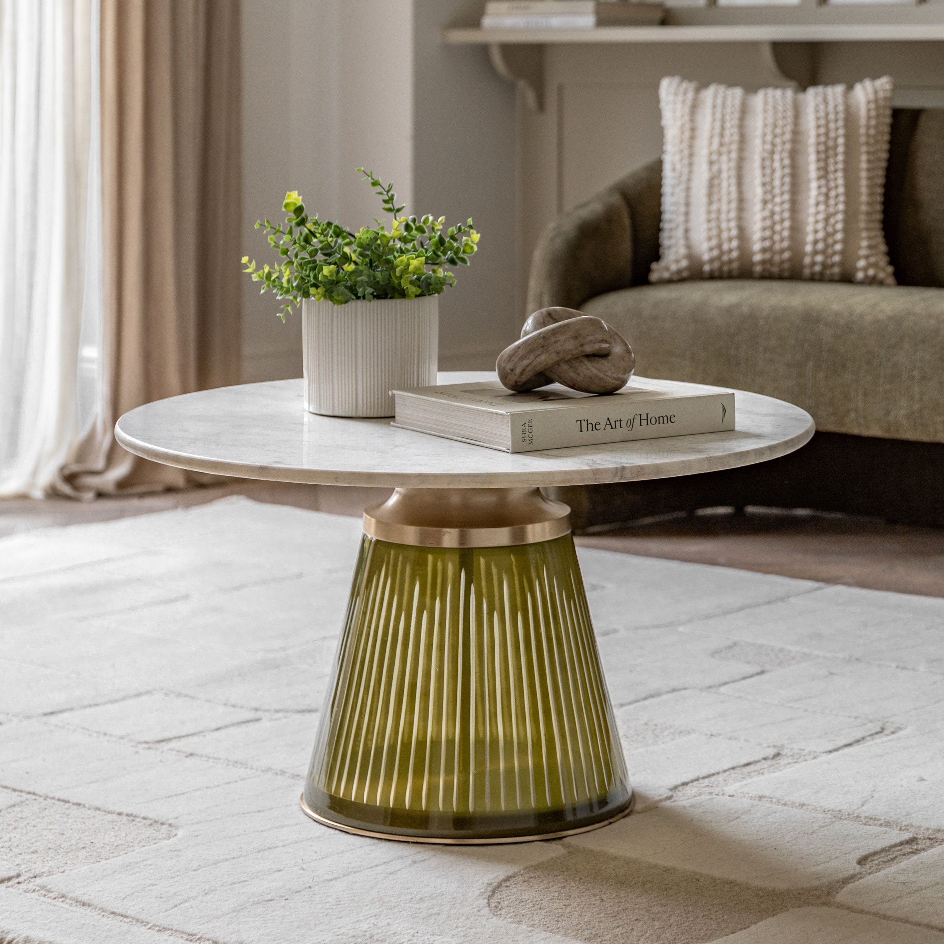 Introducing the Sarvi Coffee Table Dusk, a luxurious and elegant addition to any living room. This stunning piece of furniture features a round marble tabletop for a sleek and sophisticated surface, while the fluted glass base adds a touch of glamour and visual interest. The brass accents complete the opulent look, making this table a true statement piece.