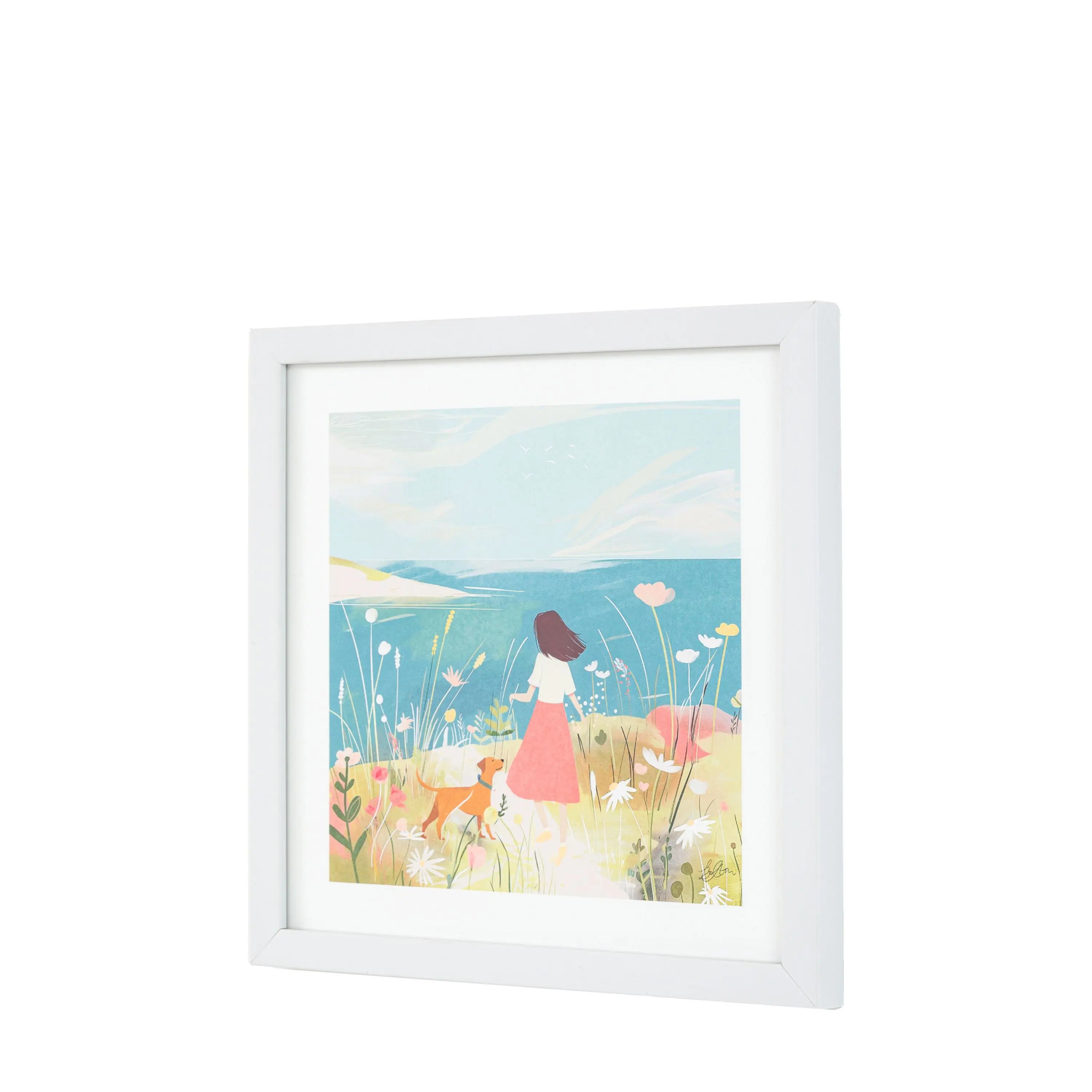 With a touch of whimsy, this charming print of a woman and her little dog enjoying a hilltop walk through the wildflowers, overlooking the sea, is a lovely addition to any wall. The soft colour palette of blues, greens, pinks and creams is complemented by a simple matt white frame.