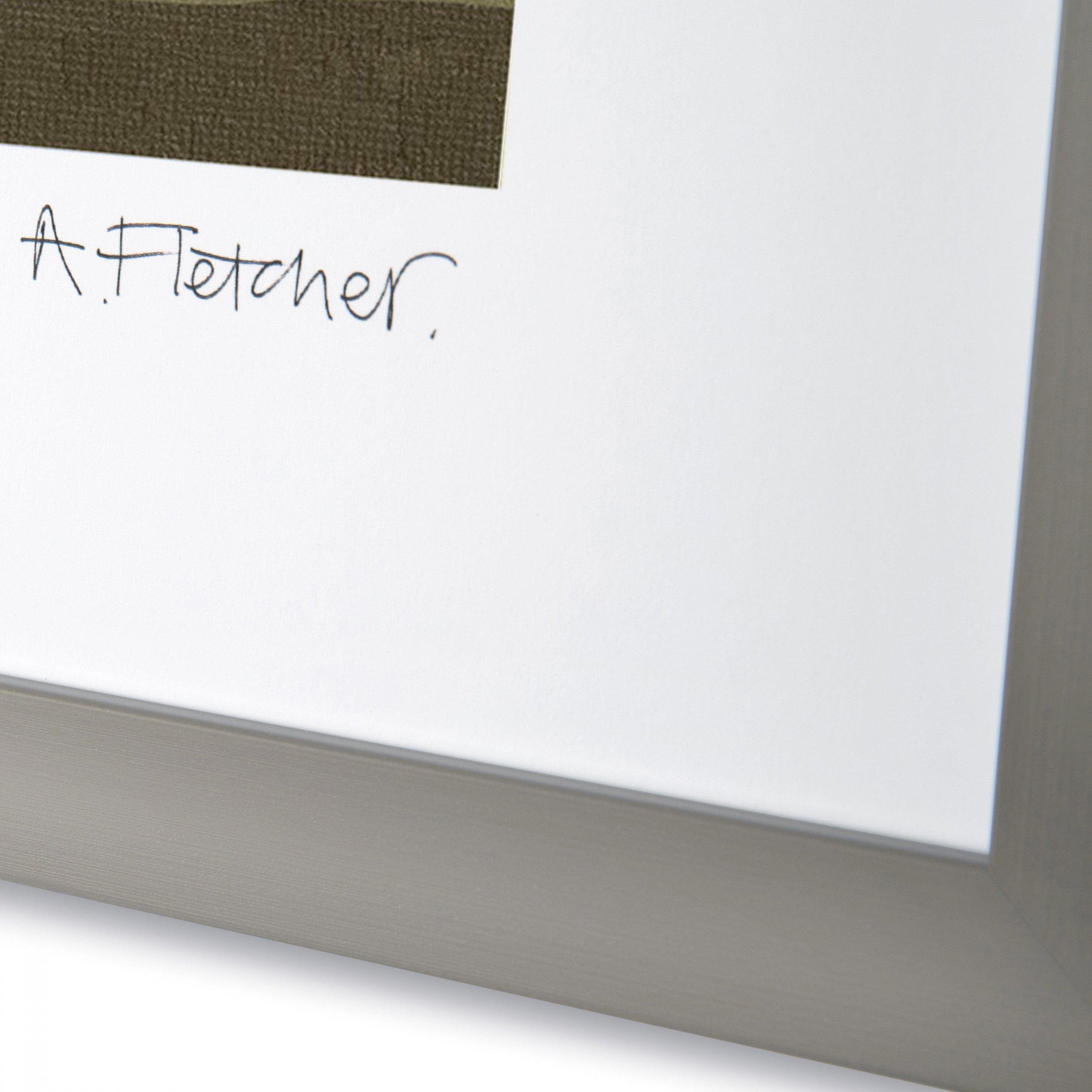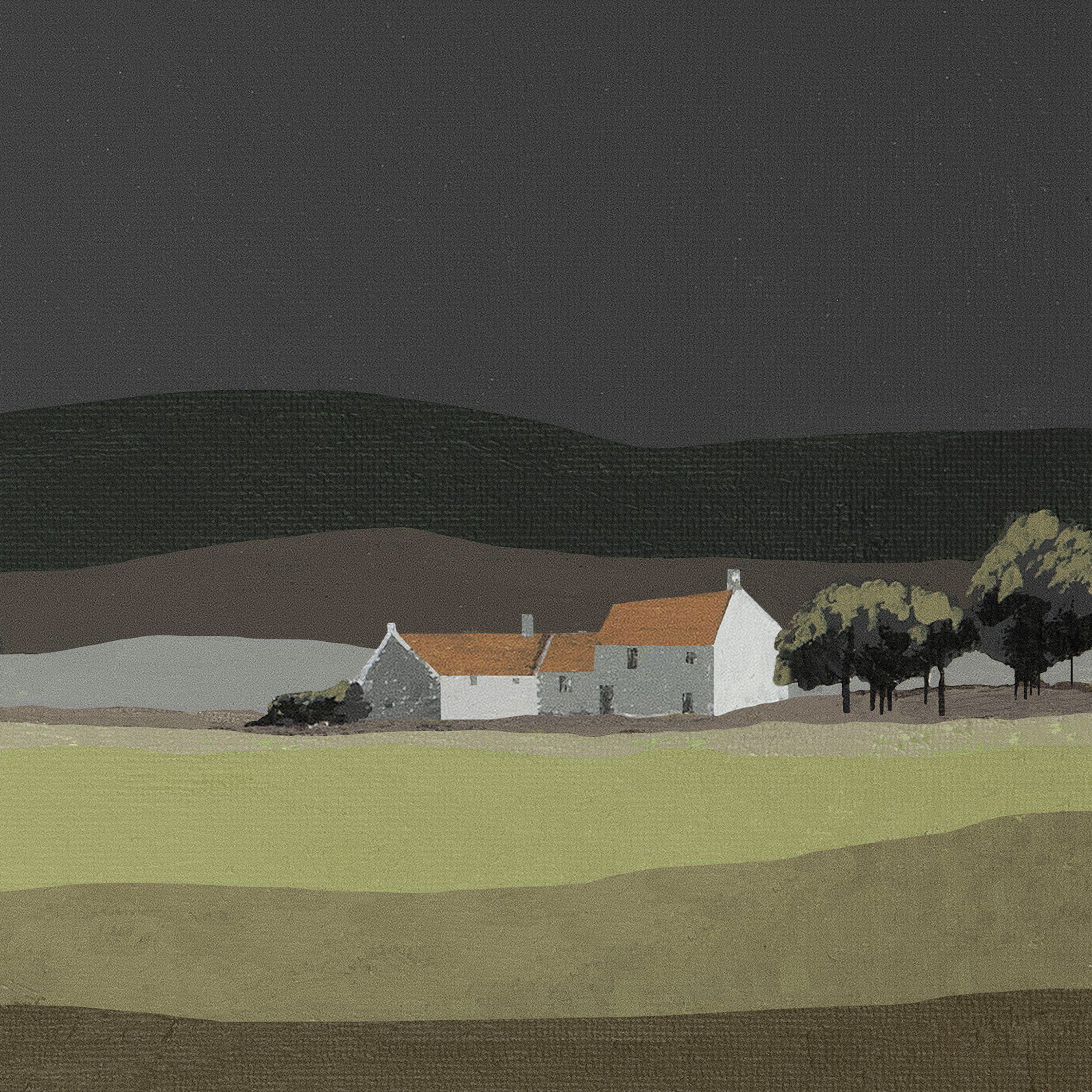 A bold muted colour palette forms a dramatic block backdrop of a classic rural scene. Adelene Fletcher paints a simple composition with a contemporary twist. Using acrylic paints, the landscape is brought to life by the sharpened detail of tree clusters that patrol a large, isolated farmhouse. The simple design is presented in a slimline mid-grey frame, with a glazed finish.