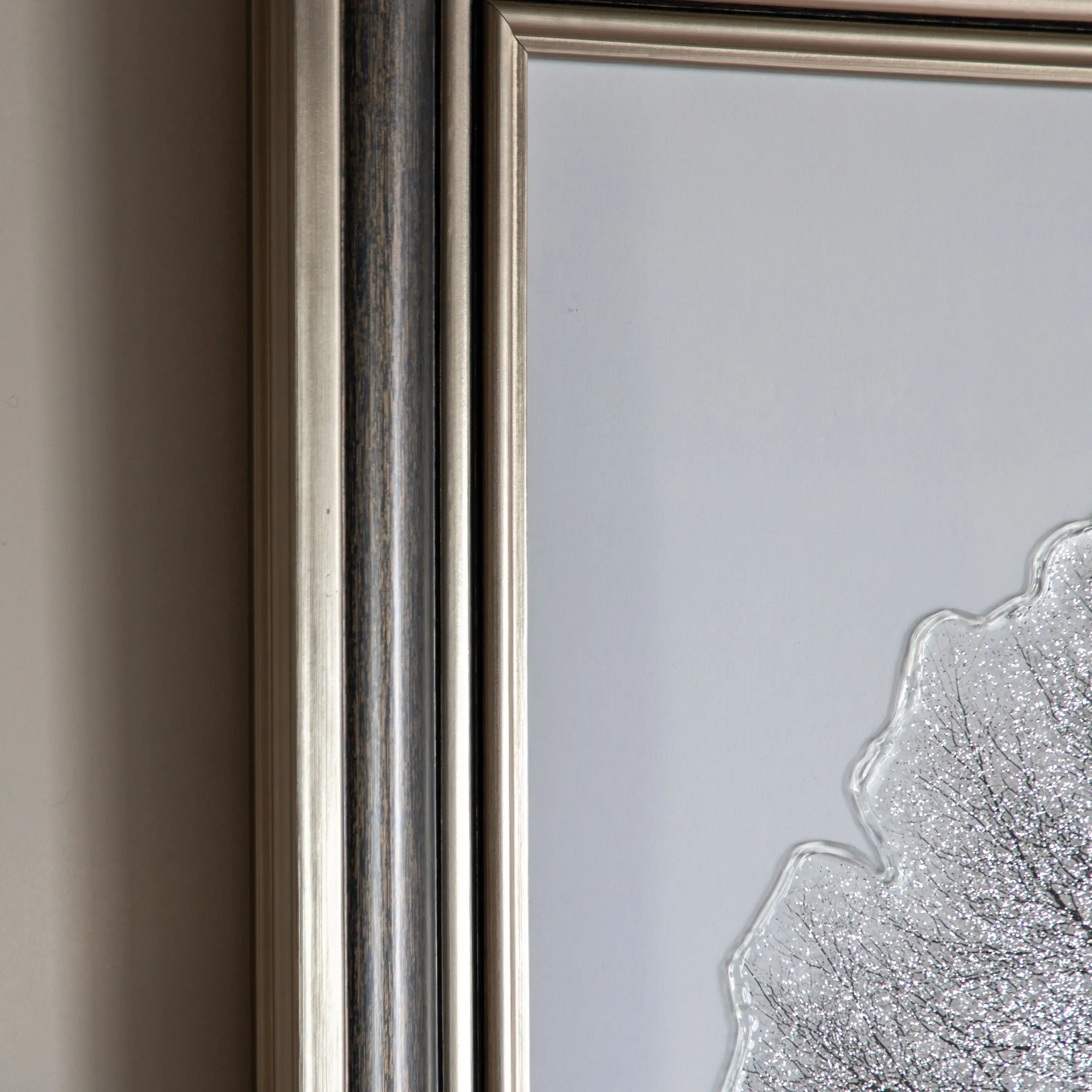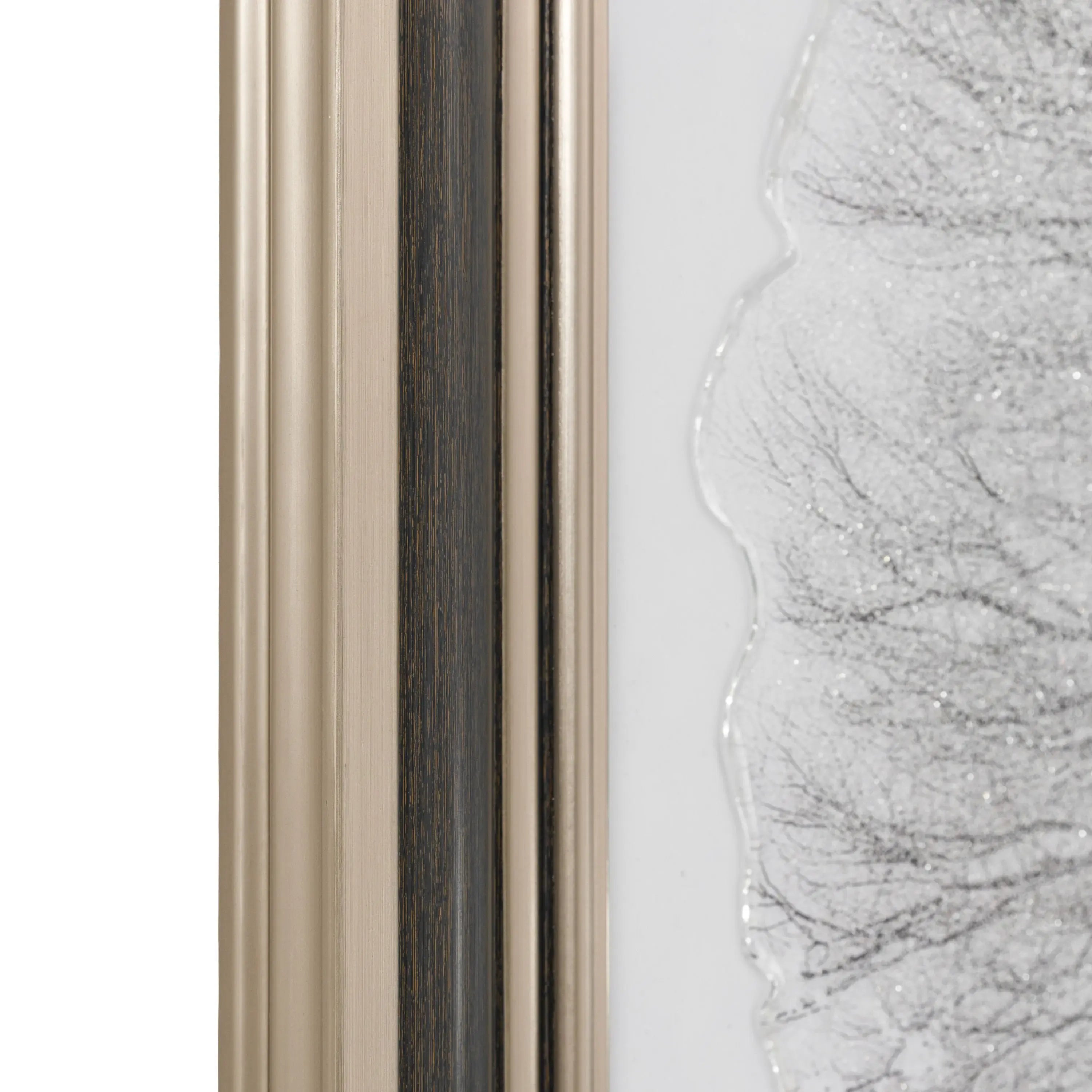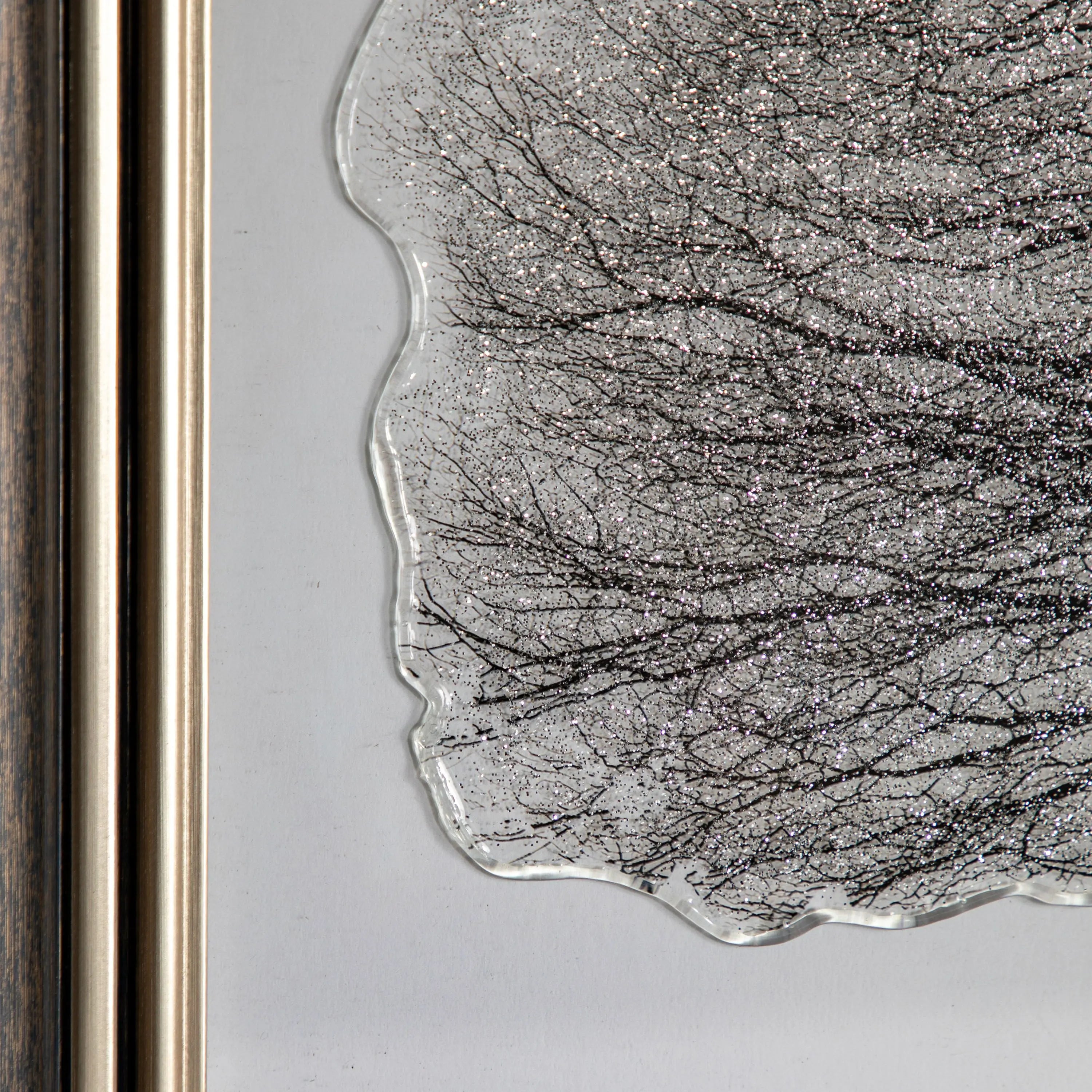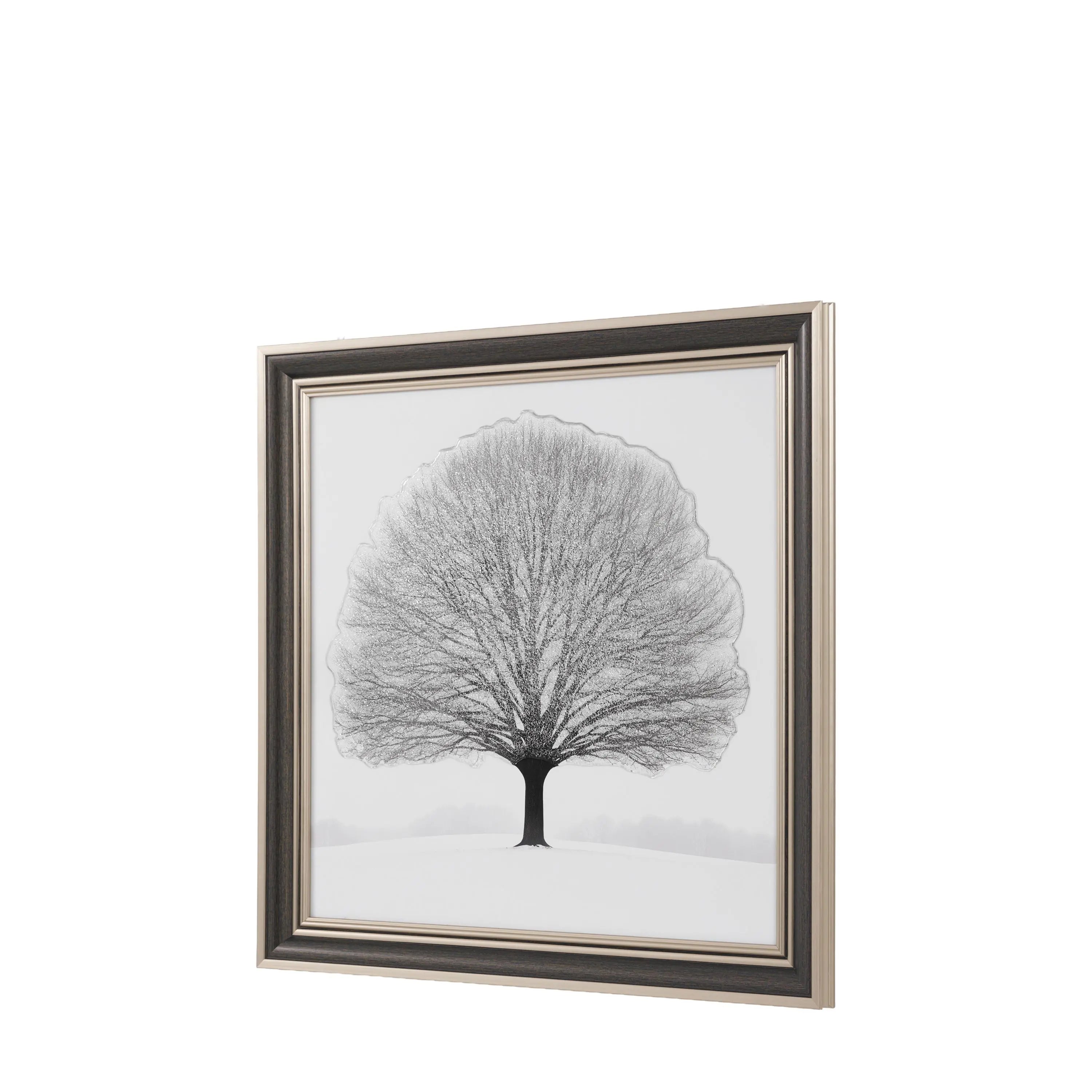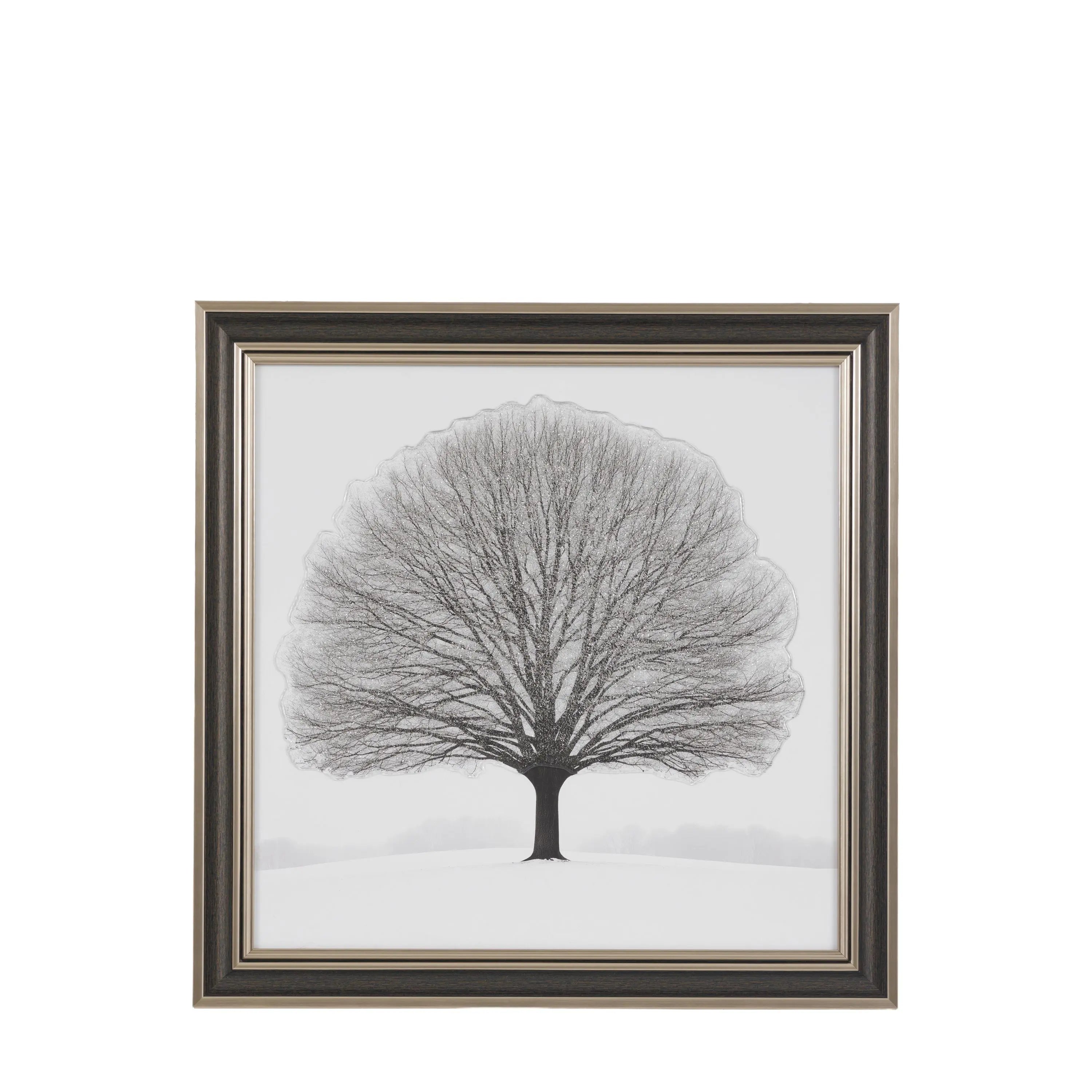 A solitary tree stands on a soft, snowy hill, its branching crown in delicate charcoal tones. A veil of high gloss shimmering glitter traces the twigs, catching light like frost and giving the image a gentle, crystalline shine. Calm, minimal and contemplative, the piece balances graphic clarity with sparkle, turning a quiet winter silhouette into a luminous focal point for modern interiors.