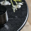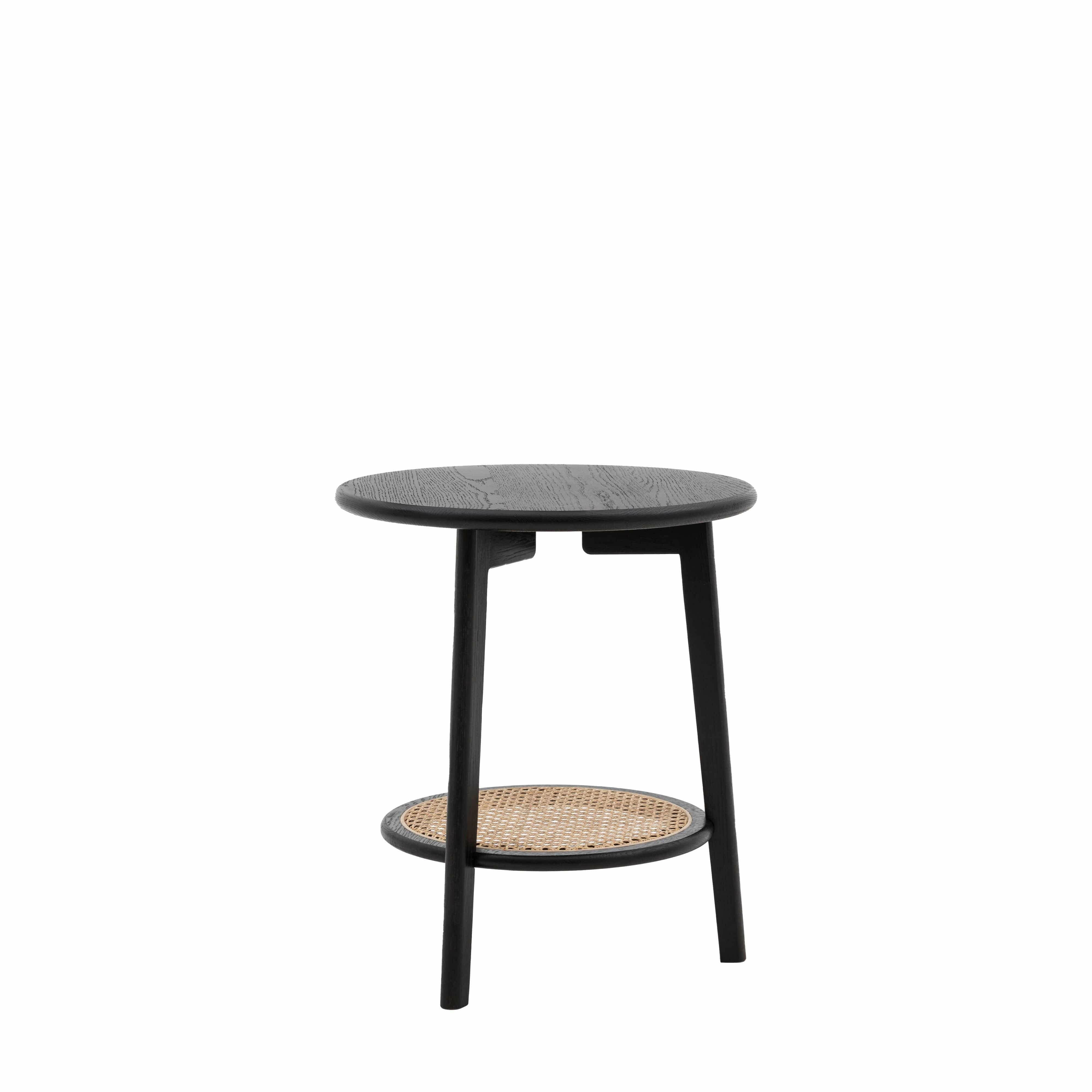Introducing the Gravel Bedside Table from House of Isabella. This stunning piece features a touch of art deco design and is made from black stained solid oak, making it a statement piece in any bedroom. The round shape is perfect for resting a lamp and bedtime book, while the woven rattan lower shelf adds extra storage and a striking contrast of materials and color.