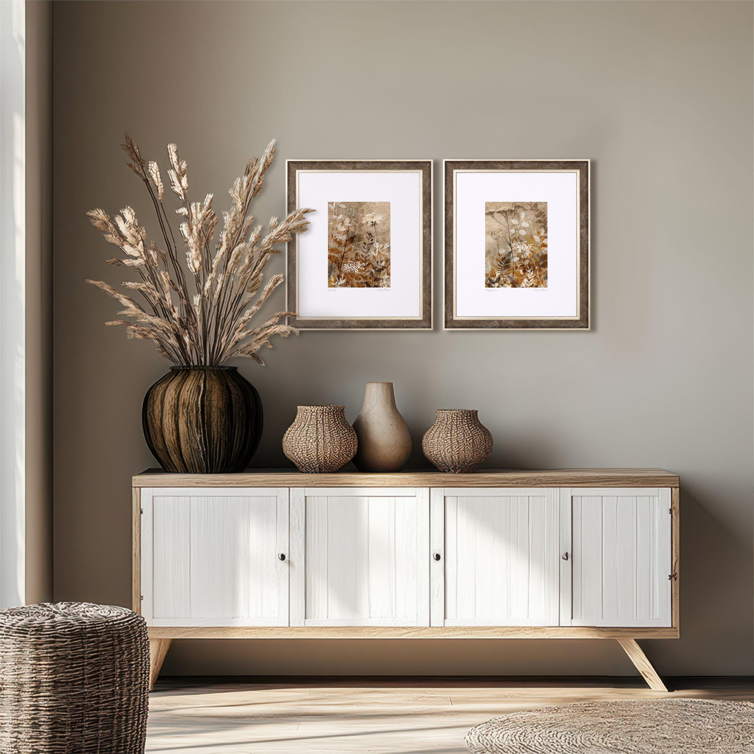 A stunning collage of an enchanting wild meadow sits beautifully against a dramatically textured backdrop of warm beige with a vintage accent. This stunning contrast not only creates enormous depth but also adds a unique perspective to the creative composition. The subtle tones that Sabrina Roscino weaves through the captivating scene of wildflowers, ferns and evergreen foliage have a whimsical effect. Printed onto paper and delicately placed behind a glaze. A decorative textured frame completes the design.