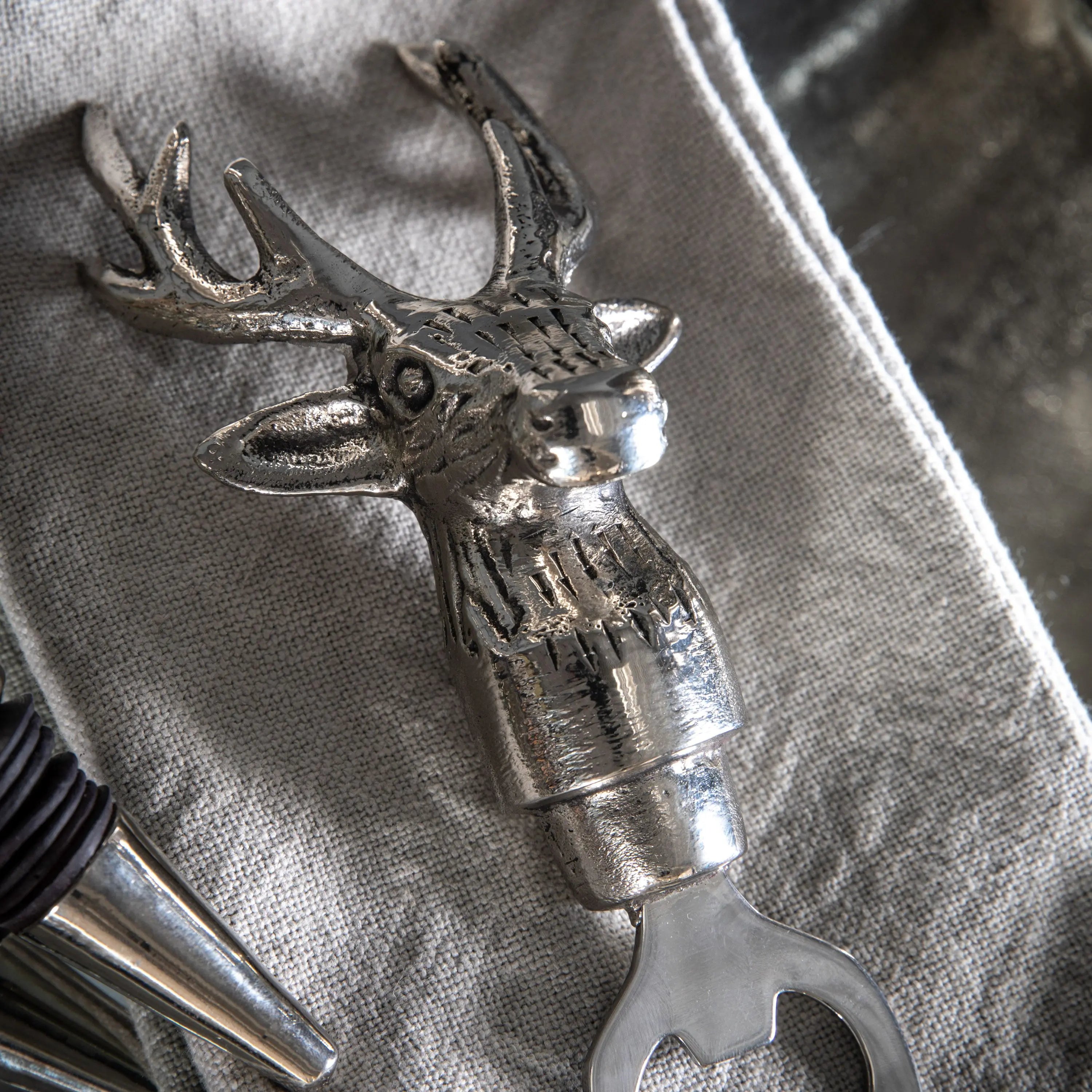 Add a luxe feel to your dinner table with this practical aluminium stag design bottle opener.