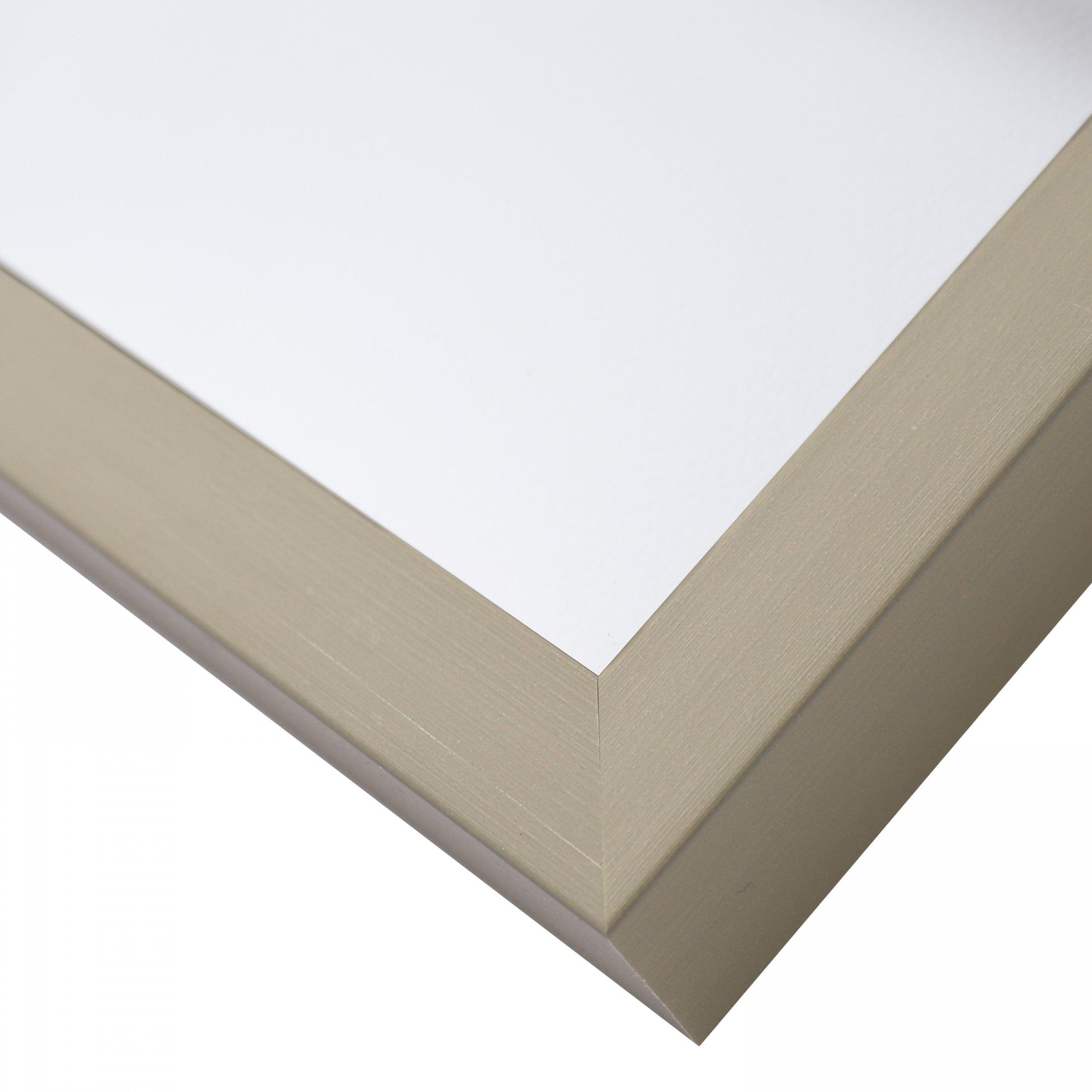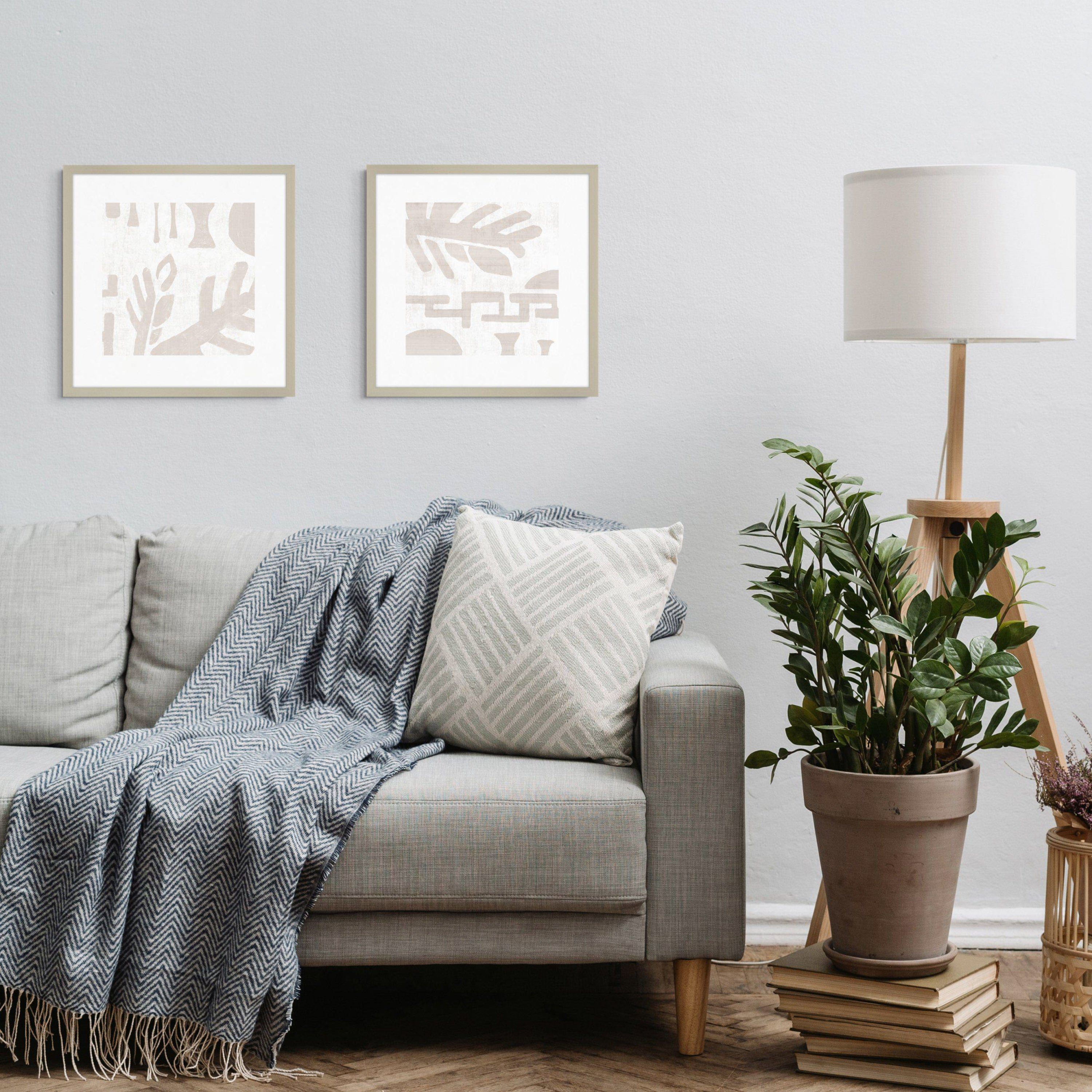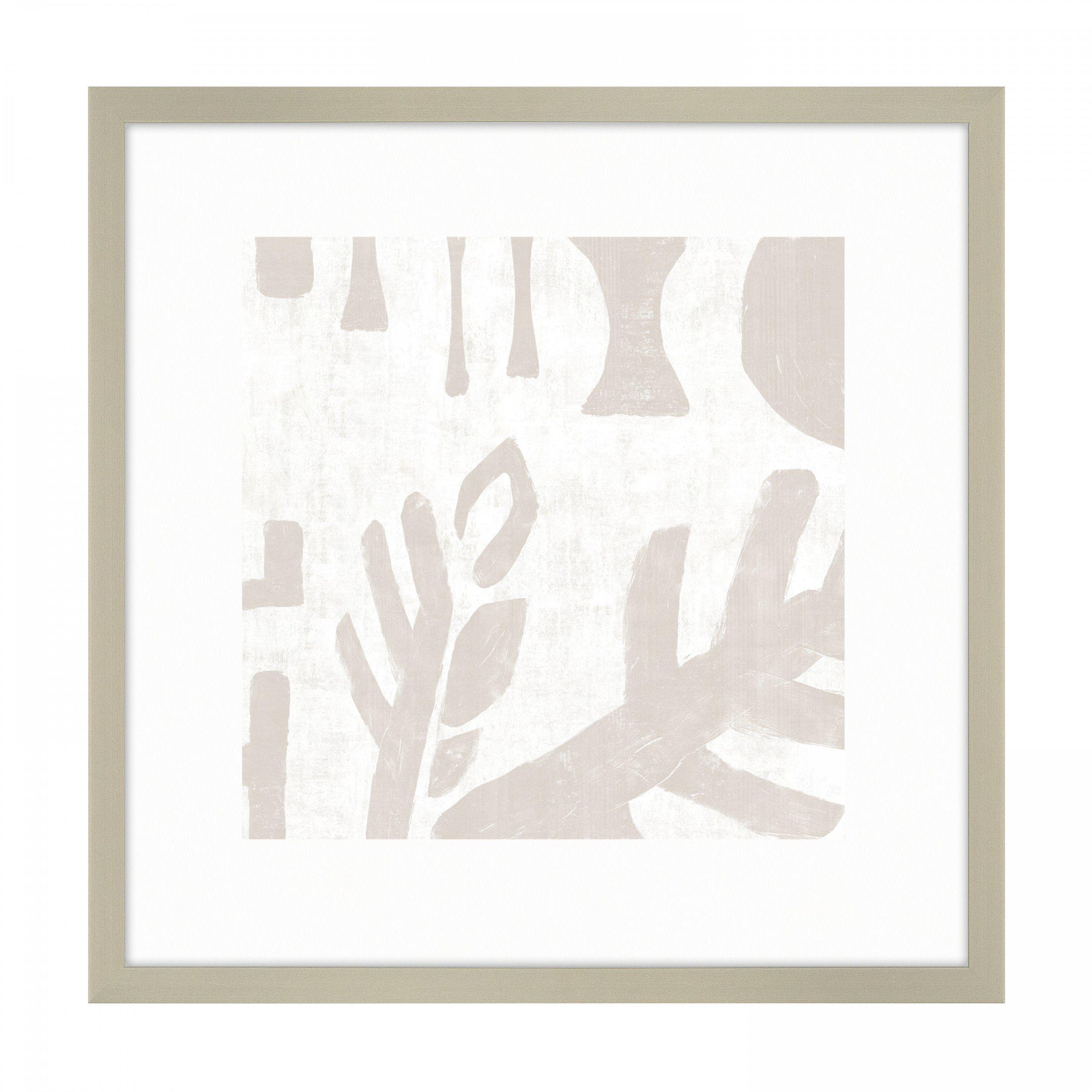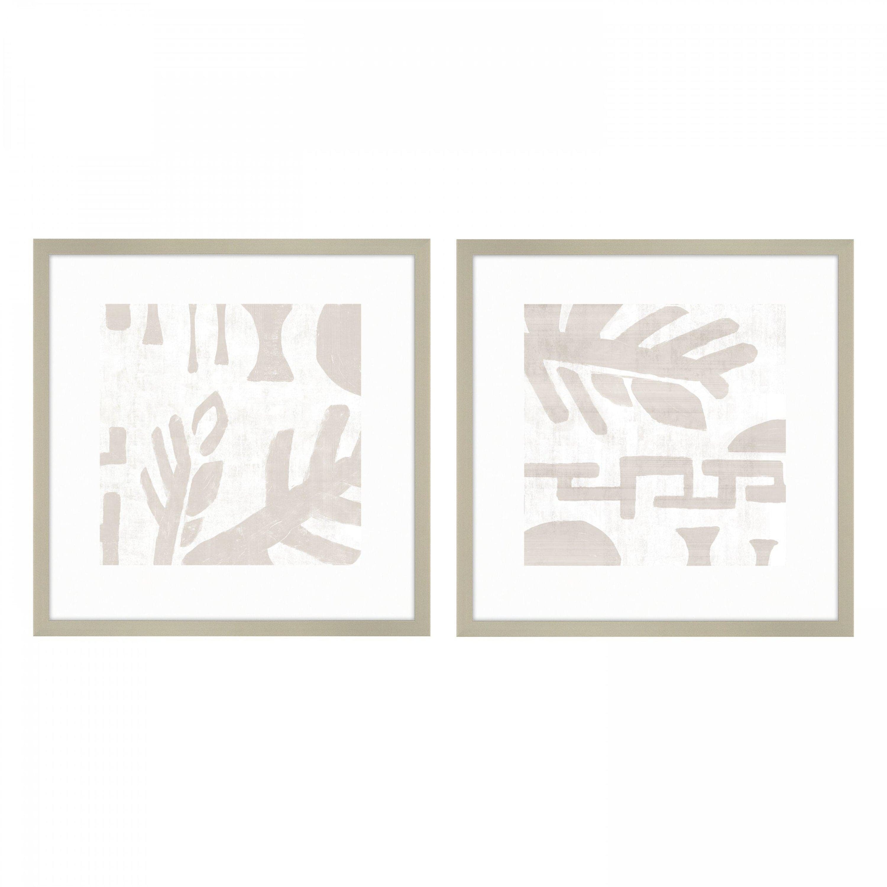 Printed onto textured Newell paper, a former textile designer, Eva Watts exhibits an uncomplicated print that takes inspiration from Aztec patterning. Wrapped in a mid grey frame, the glazed pair present a contemporary abstract design from an organic subject. A muted monochrome colour palette emphasises the simplicity seen in basic shapes.