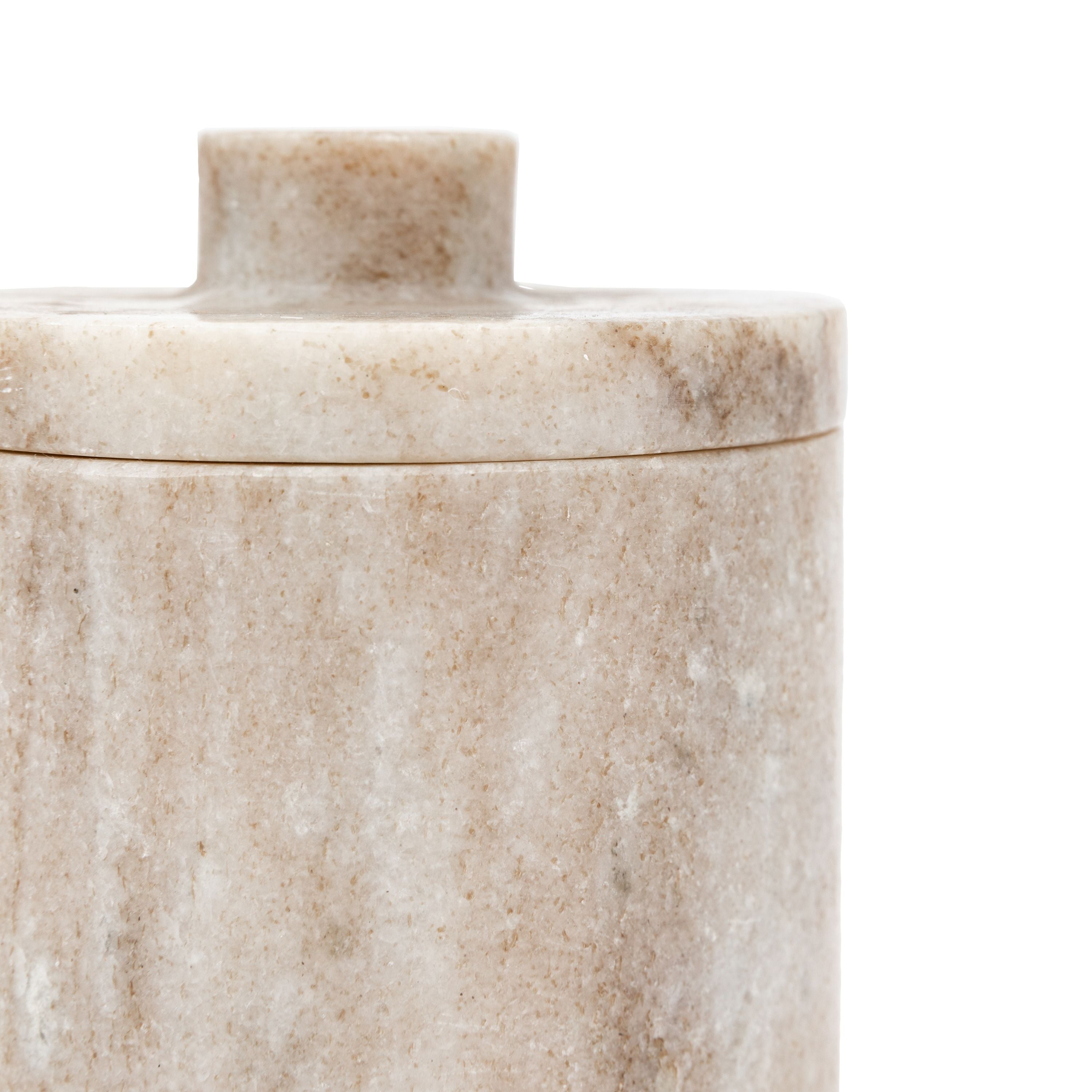 Elevate your storage with this sophisticated jar. Hand carved from natural marble, the jar is both simple and characterful, showing off the richly veined marble and adding elegant storage to your bathroom or kitchen.