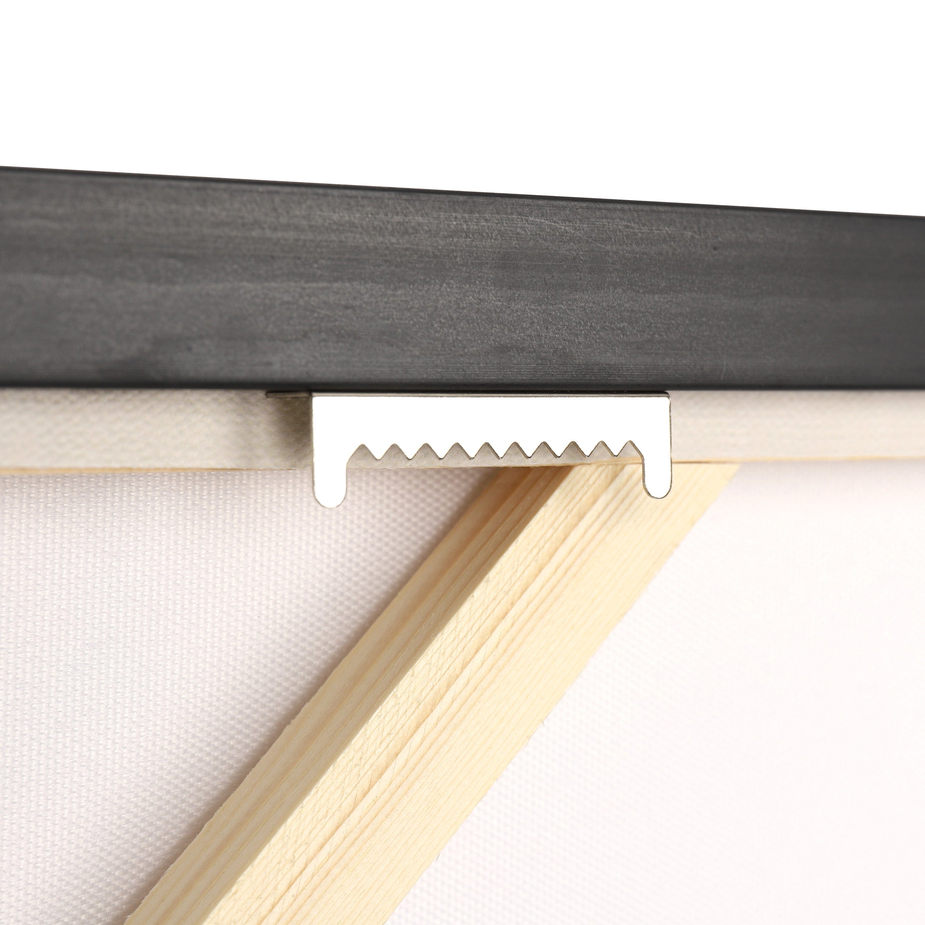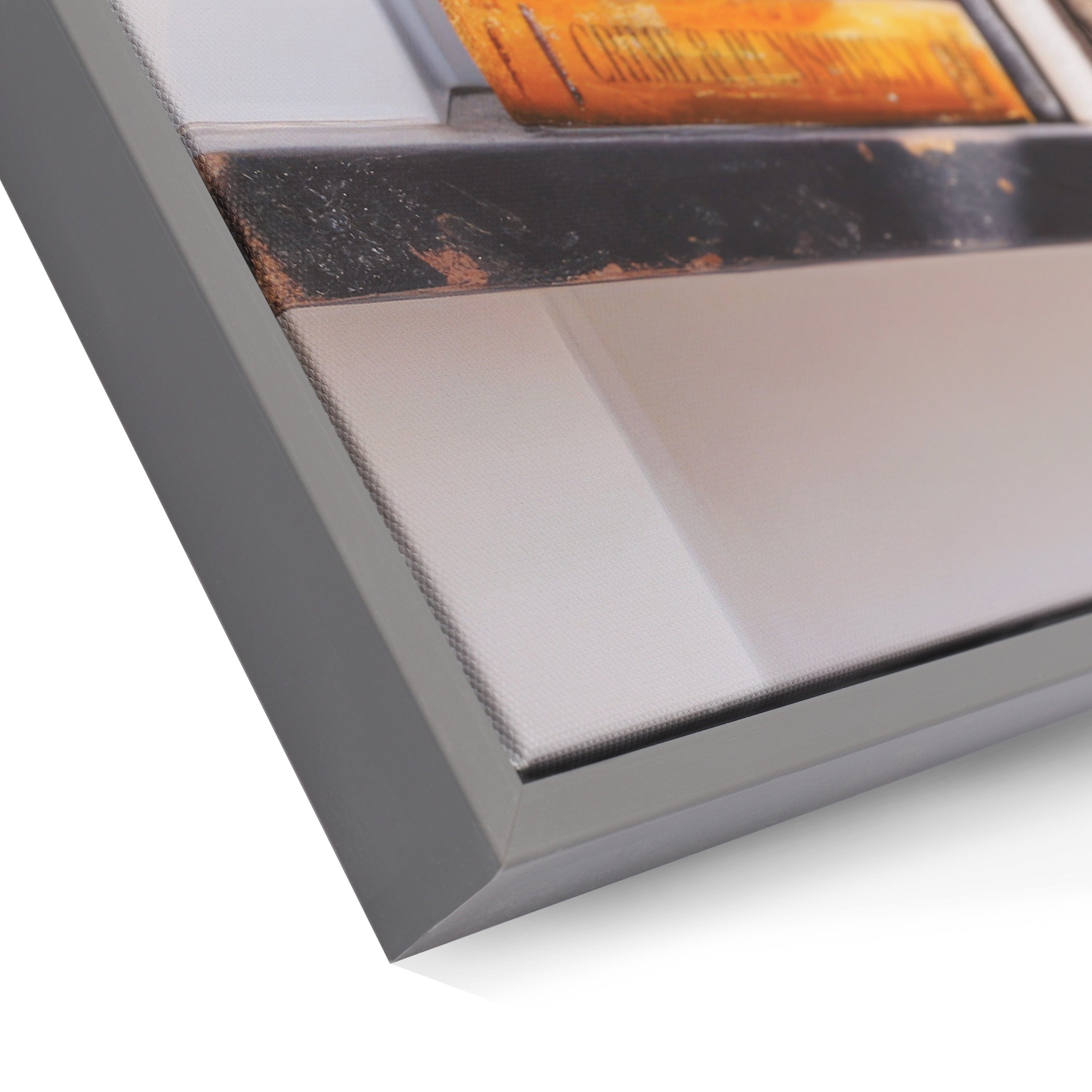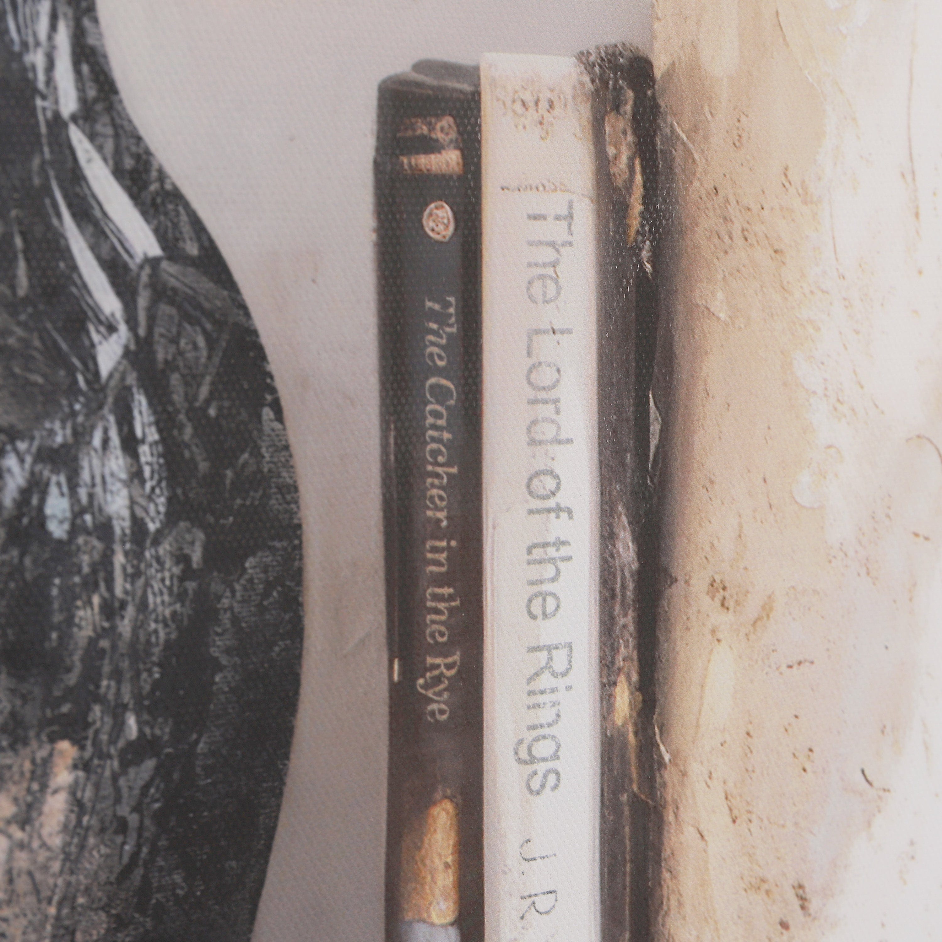 An assortment of classic literature sits neatly on an ageing bookshelf. Tucked into a cove, the shelf reveals a host of distinguished authors who span a range of novel themes. The well-thumbed assortment sits among ceramic vintage vases that reveal their texture in the sun's golden rays beaming through an adjacent window. Karen Reavill captures this simple view with a range of muted paints. Printed onto canvas, the wall art completes itself with a slimline dark grey frame.
