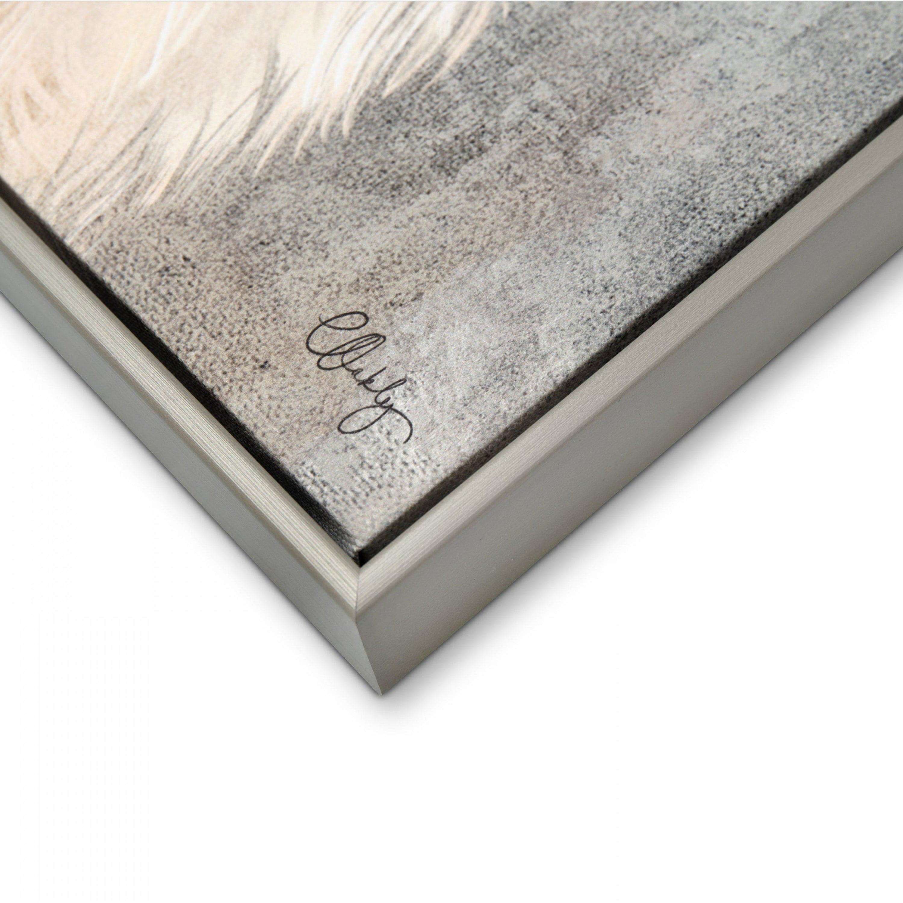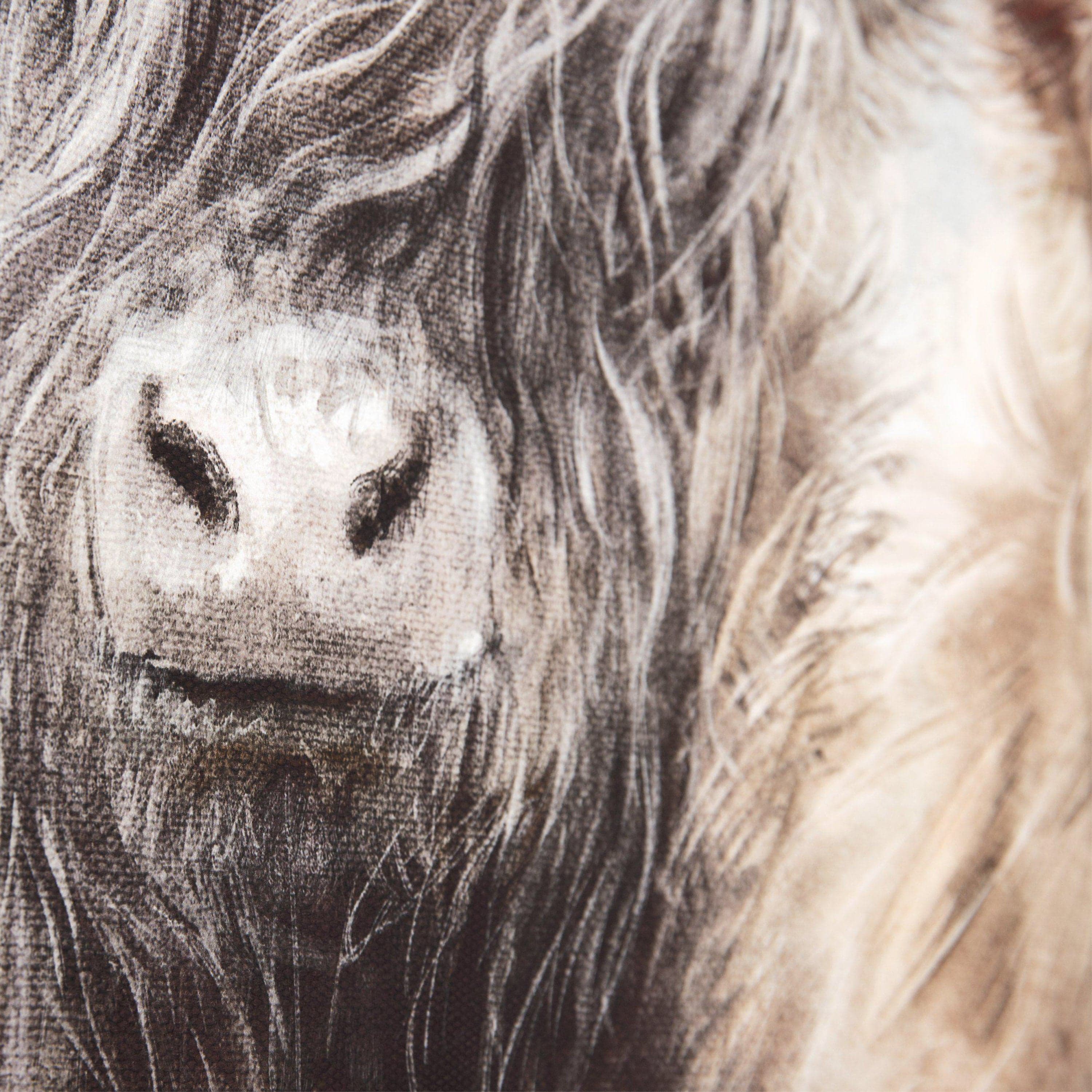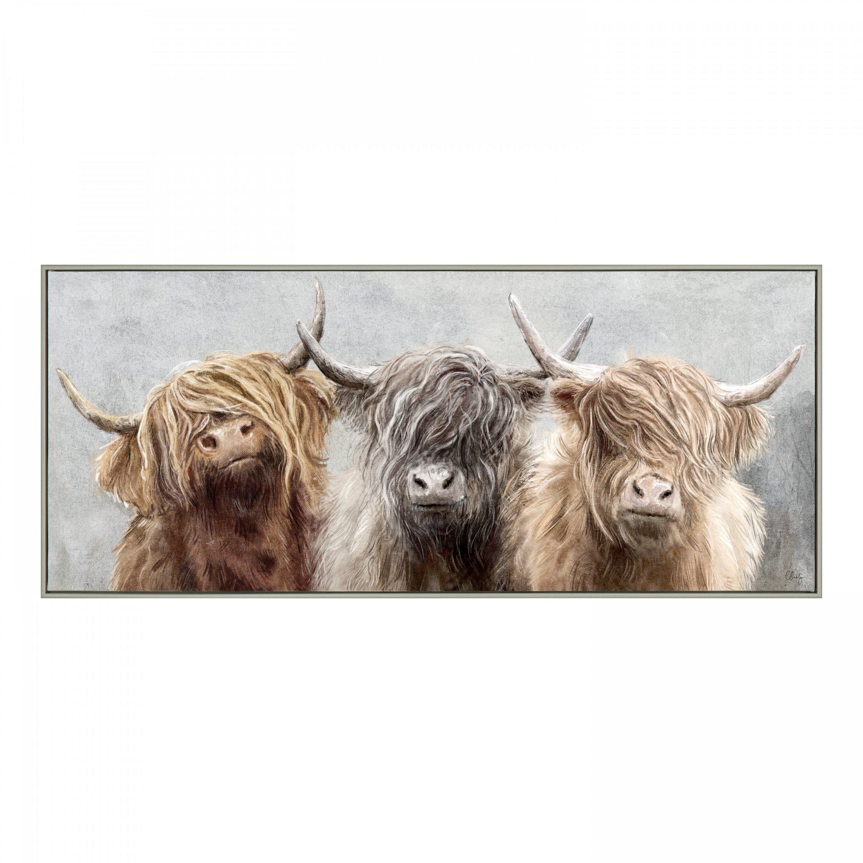 A compact presentation of our trio of handsome Highland Longhorns. Peering through their tousled and tangled fringes, these curious beasts stand firm together. A gentle aura radiates off this detailed portrait. Charlotte Oakley's love for nature flows tenderly through her illustrative strokes. The traditional design lays itself across a canvas. A contemporary warm mid grey frame completes the wall art.
