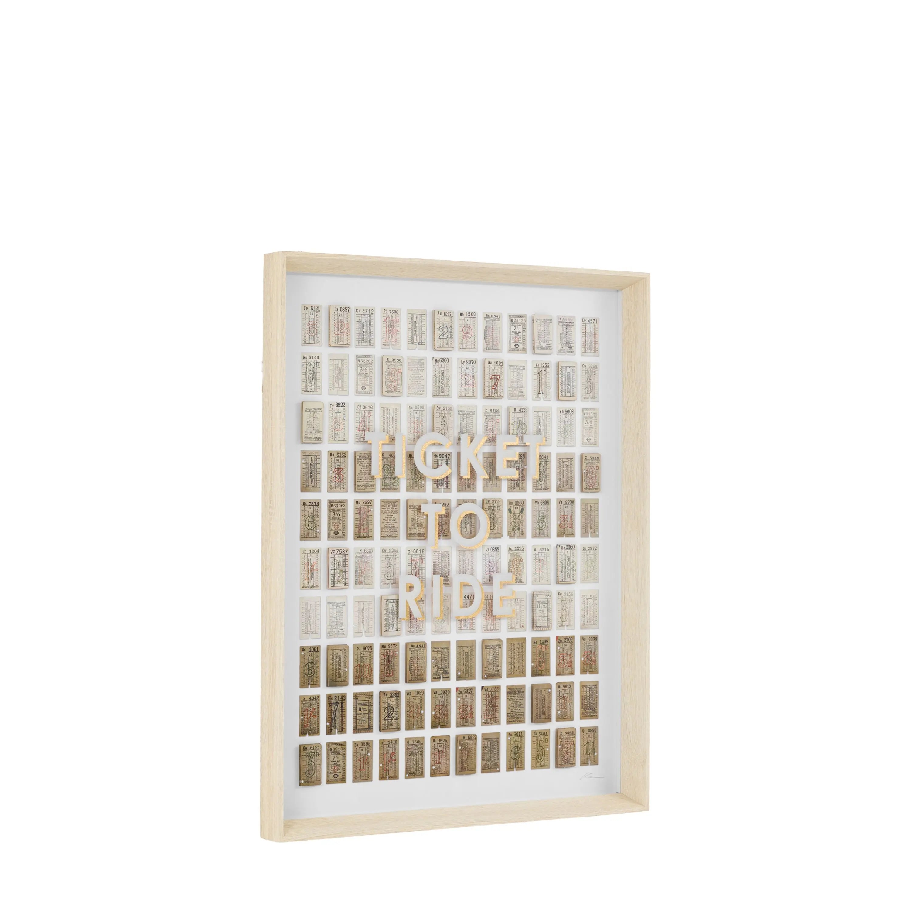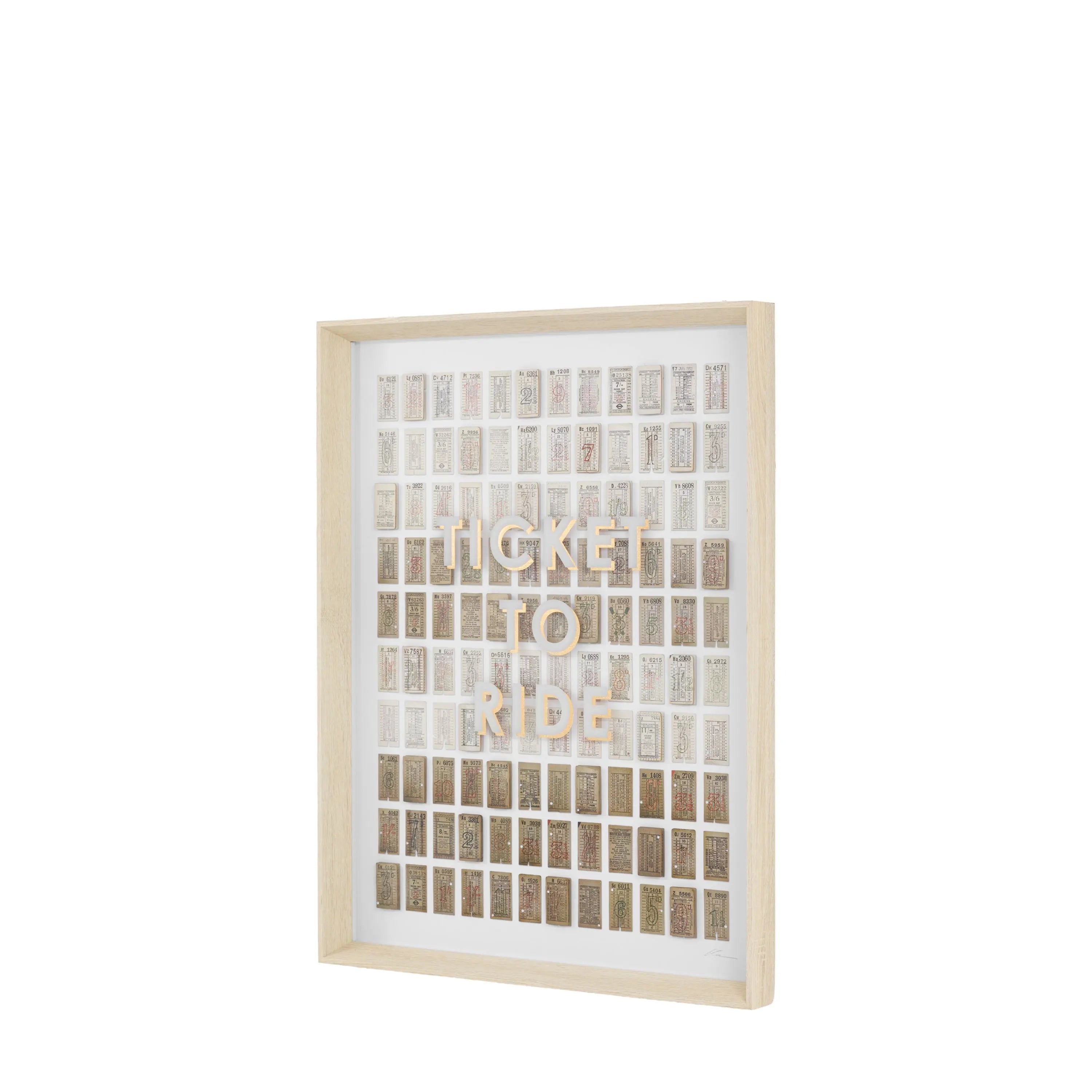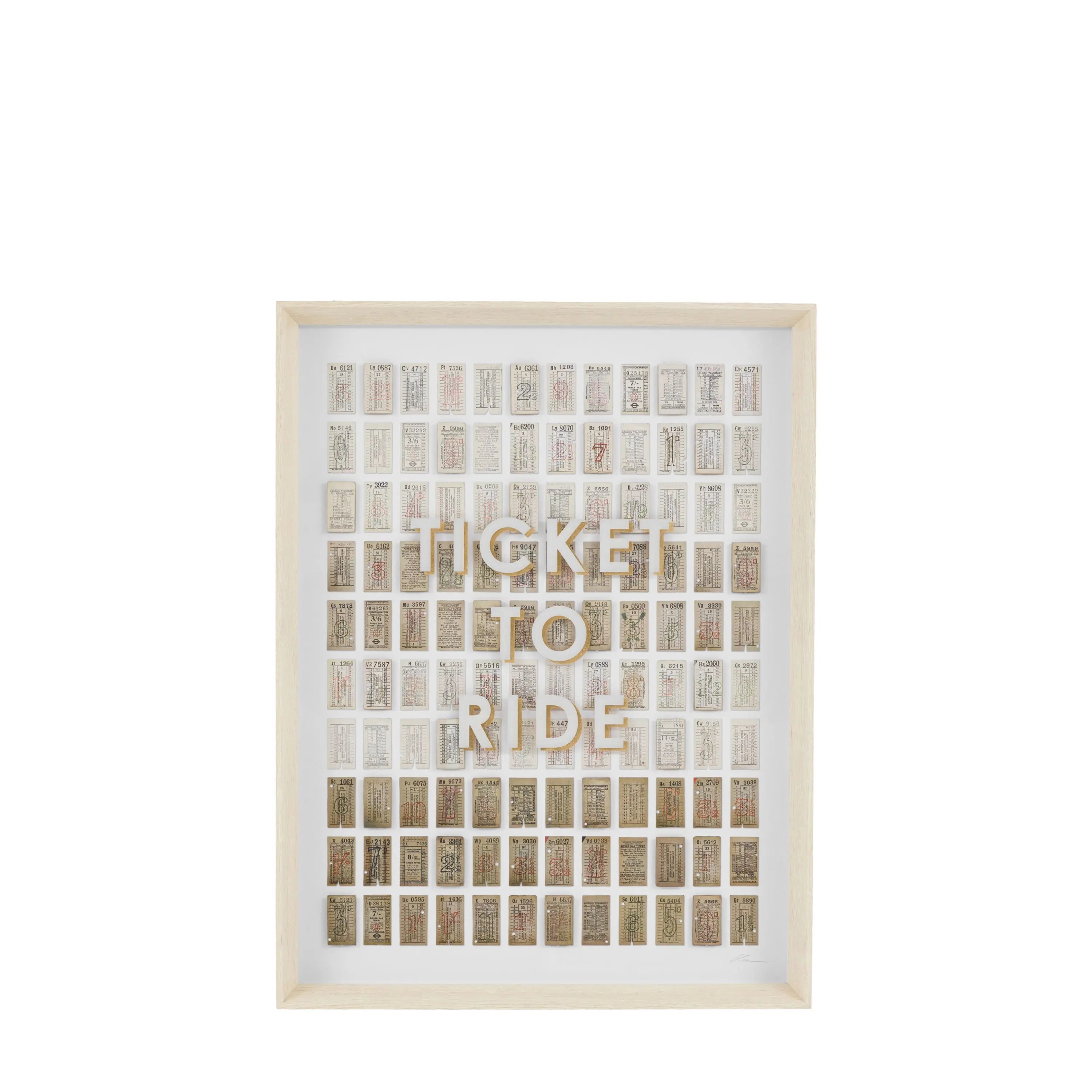 A nostalgic mixed-media artwork composed of original bus ticket designs from the 1930s to 1950s, arranged in muted tones, and displayed within a deep contemporary angled shadow box frame. Selected tickets are subtly raised to create depth and texture, while the phrase 'Ticket to Ride' is silkscreened in white and gold foil onto the glass, adding a shining layer of reflection and meaning. The piece captures both the romance of travel and the passing of time through a thoughtful blend of history and design.