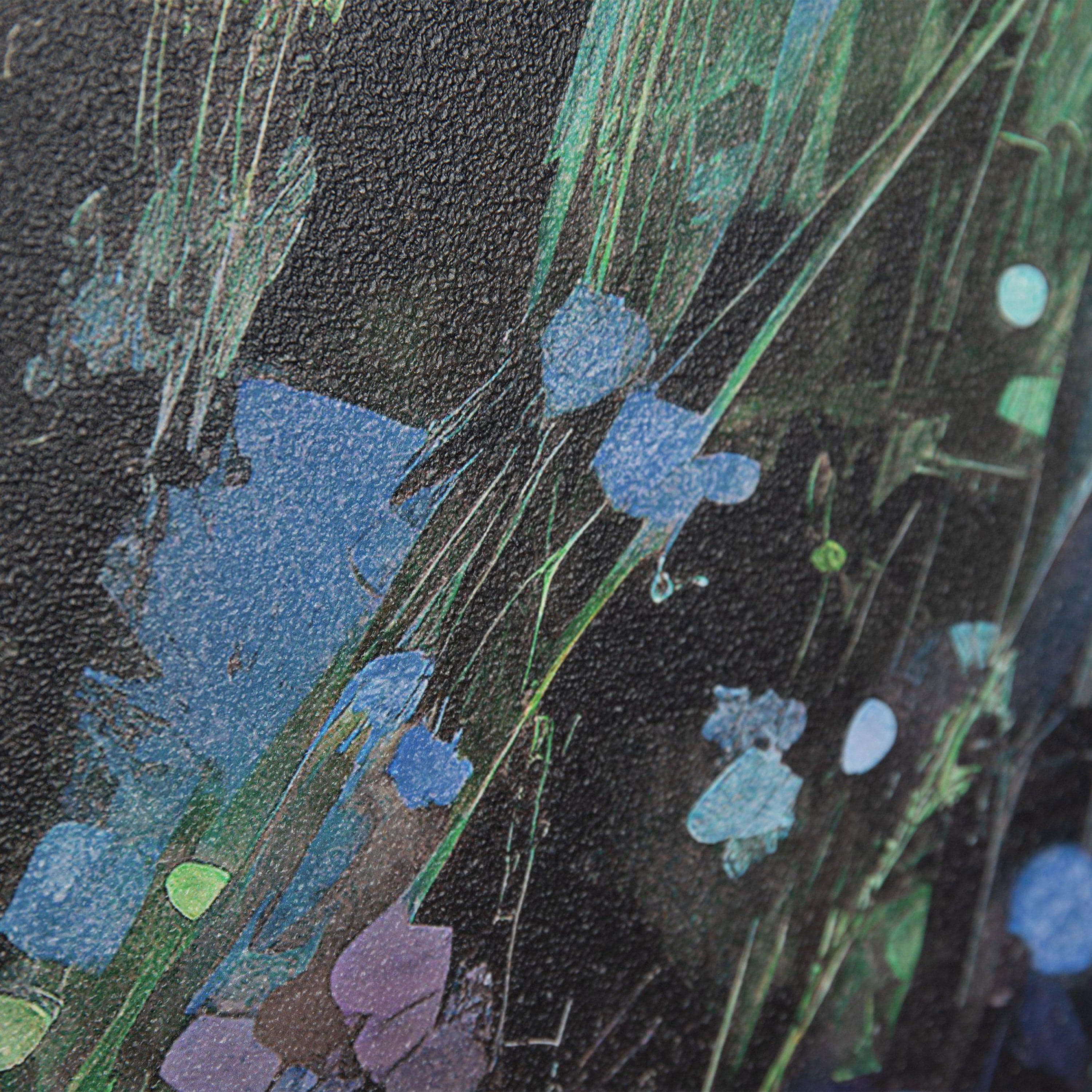 An expansive wetland thrives with life. A vivid illustration that embraces an assortment of brightly coloured blues and greens, along with splashes of pink and purple, to declare a whimsical vista. A low sun brings hope to a moody skyline. The unglazed canvas wall art uses a mink wood effect profile to complete the presentation.