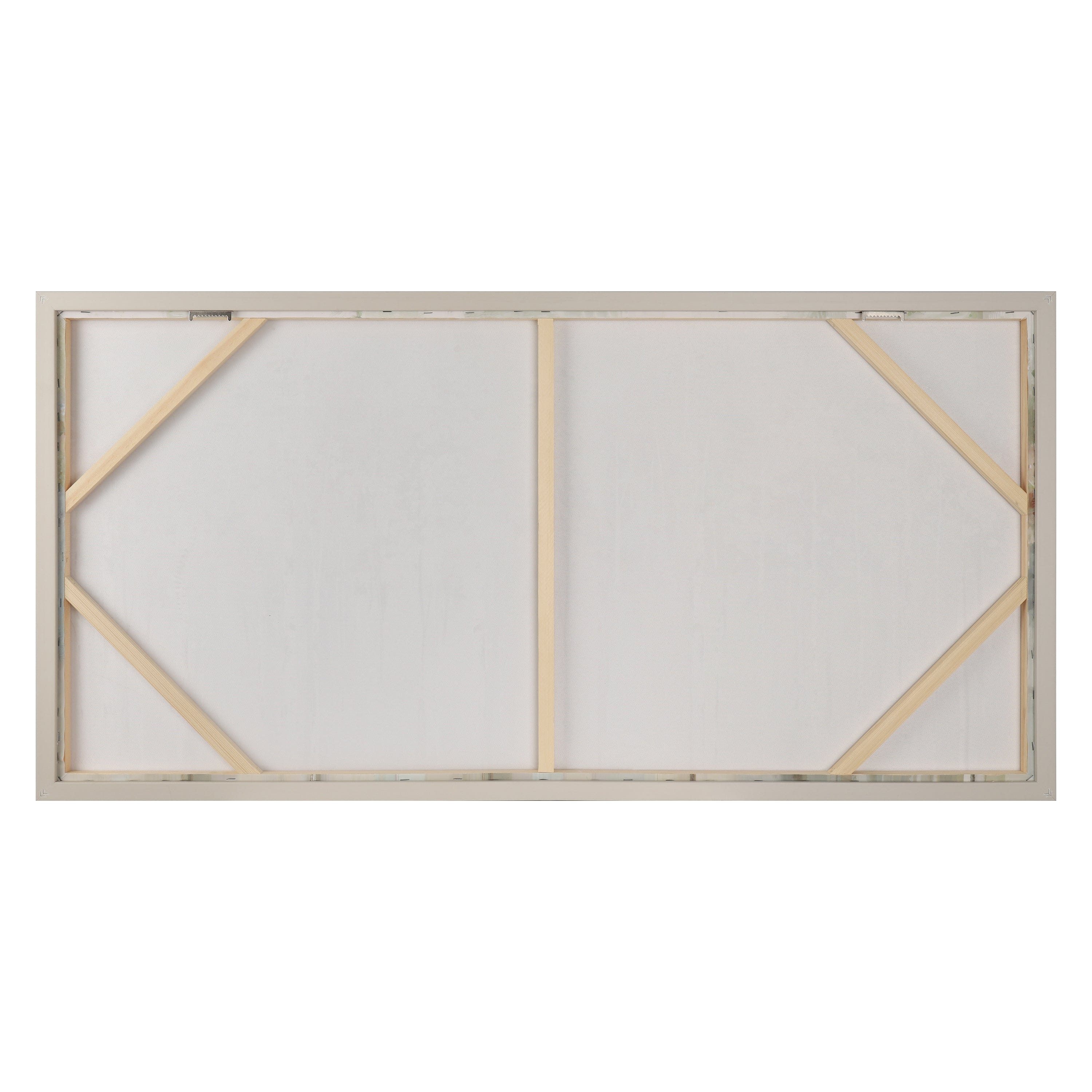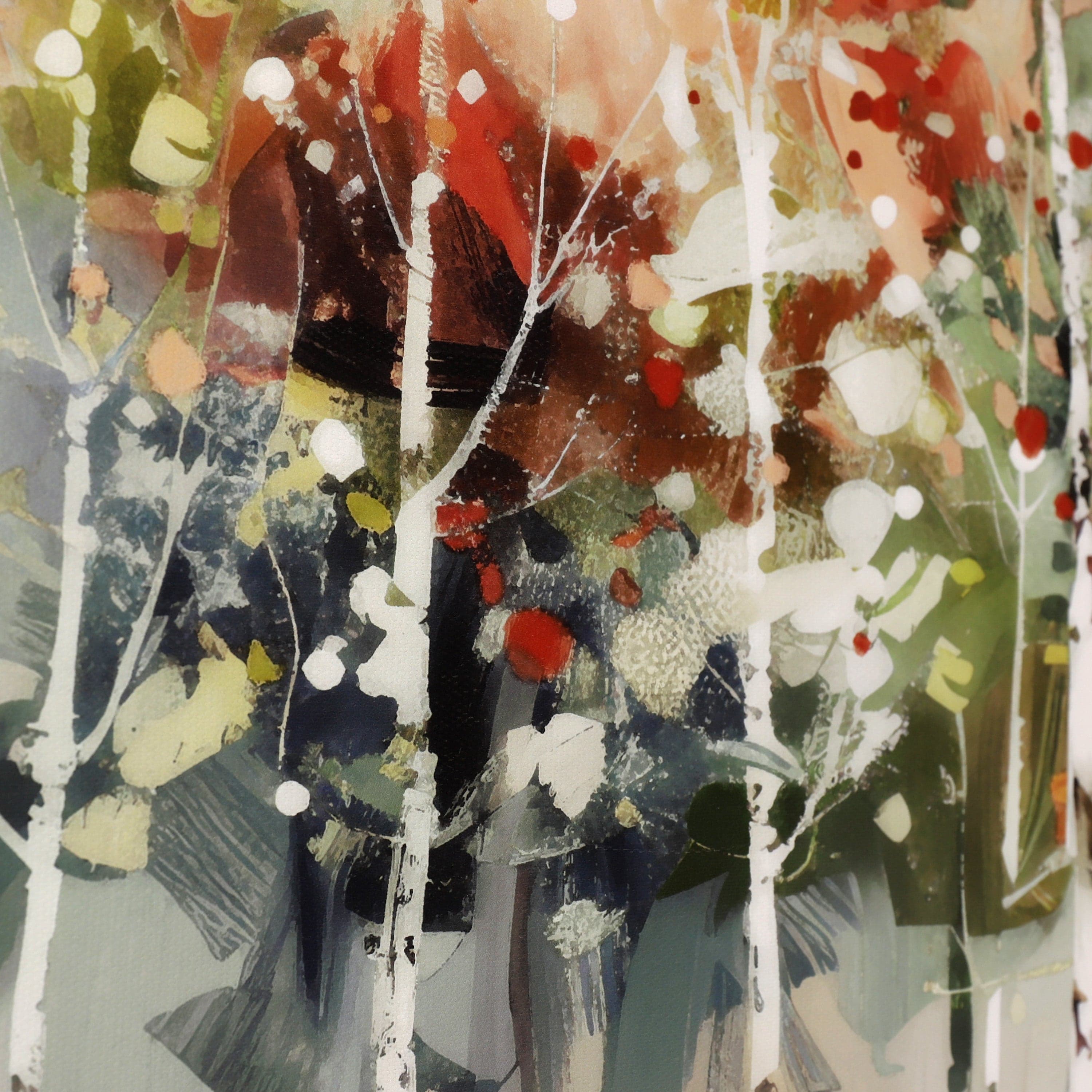 An abstract composition depicting a cluster of delicate silver birches. The artwork features a blend of autumnal colours, from rich olive green to deep terracotta, capturing the transition of the tree canopy into the new season. Faye Reynold-Lydon brings energy to the contemporary composition by layering her paint to create a full and vibrant piece. The wrapped canvas is framed with a warm, textured grey finish.