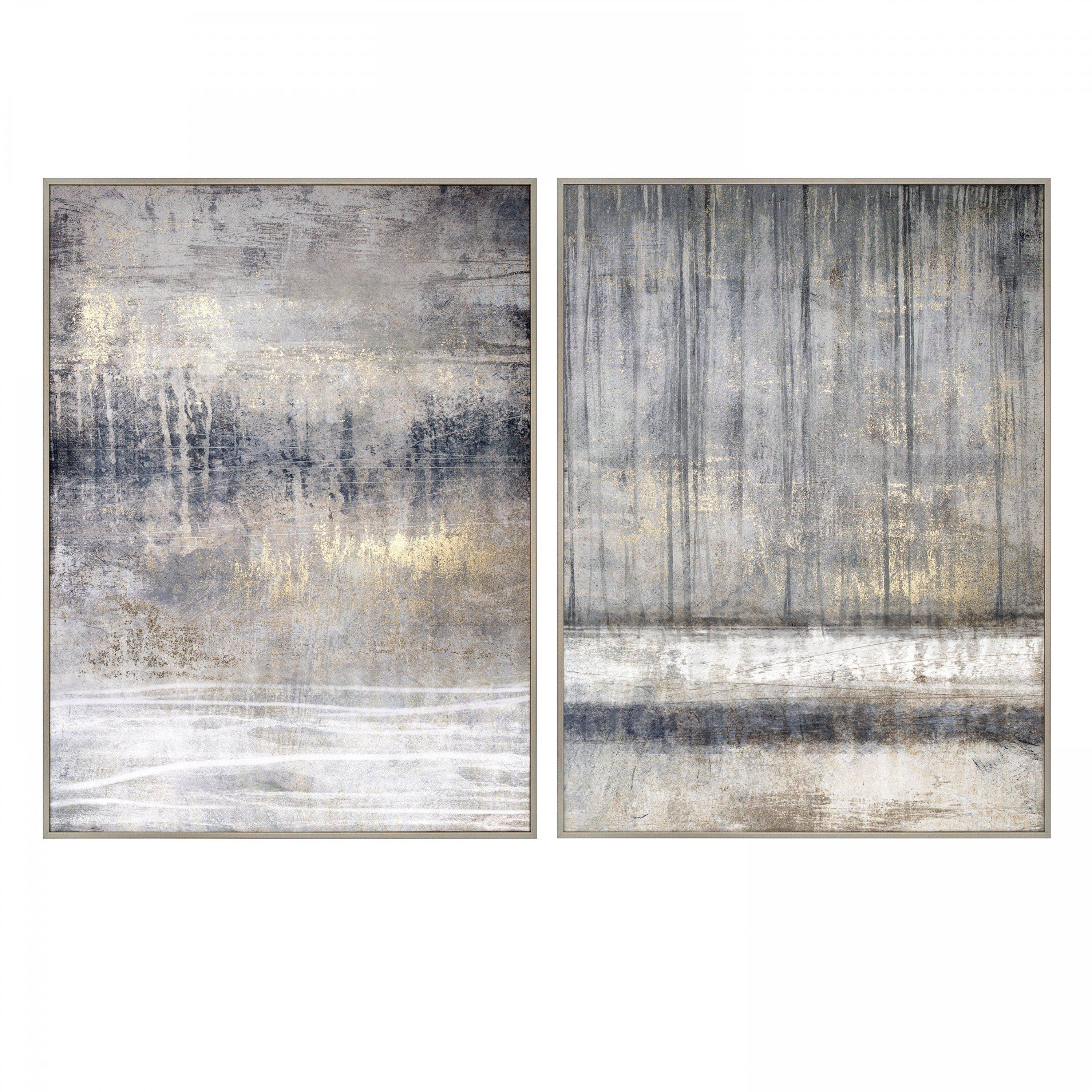 A set of contemporary framed canvases that boast flare. The abstract pieces are designed with muted tones that will blend into an array of interior ambitions. Shades of dove grey, deep indigo and glistening gold foil metallics roll themselves across the statement wall art. Modern effects are deliberately arranged to create a breadth of dramatic sensations. The canvases are framed with a slimline mottled pewter design.