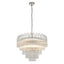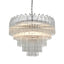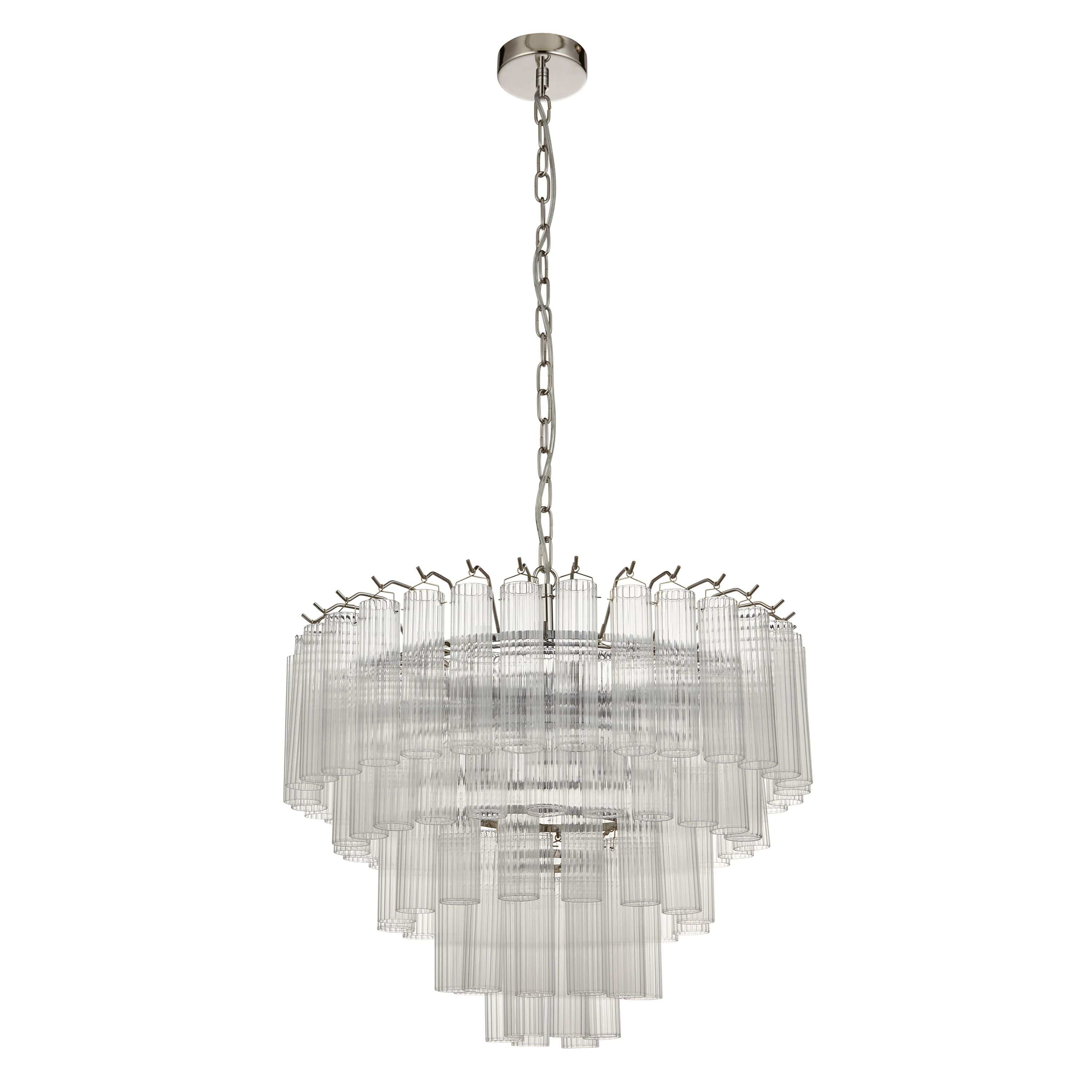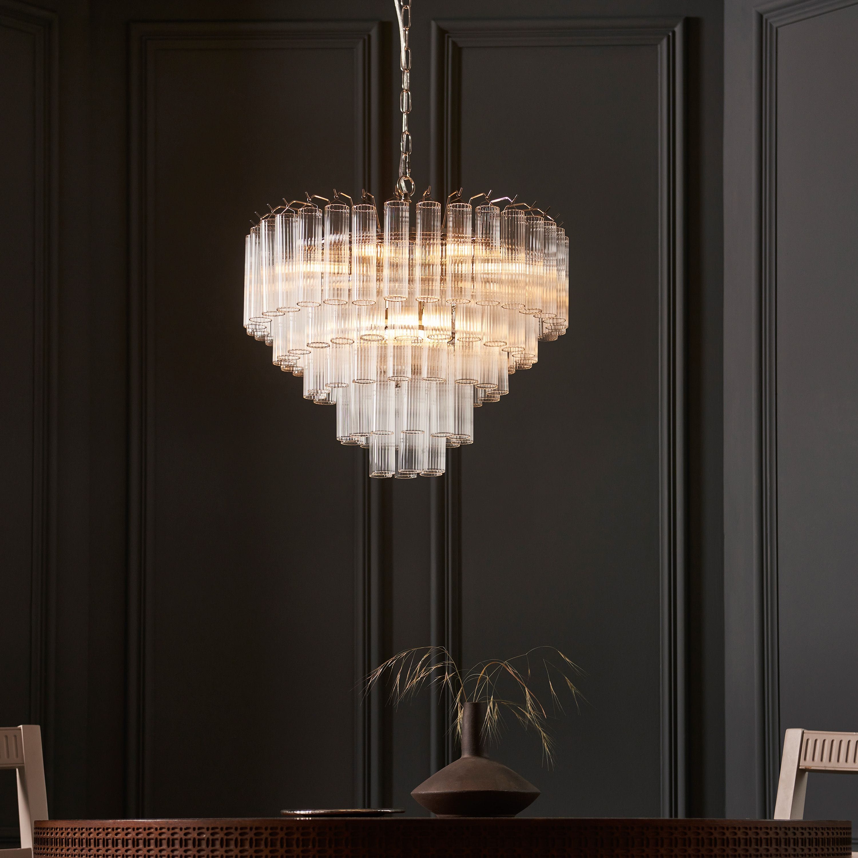 Showstopping tiered tubular glass chandelier with fine ribbed cylindrical clear glass set amongst polished nickel metalwork. A stunning focal piece to light up an interior space with grandeur.