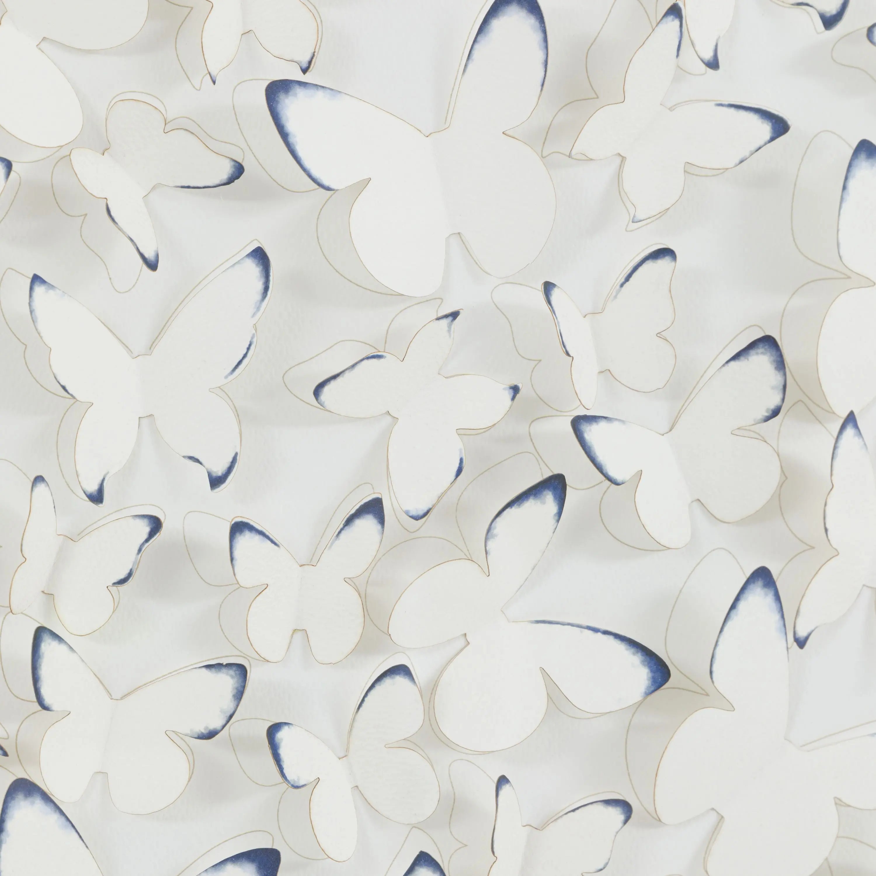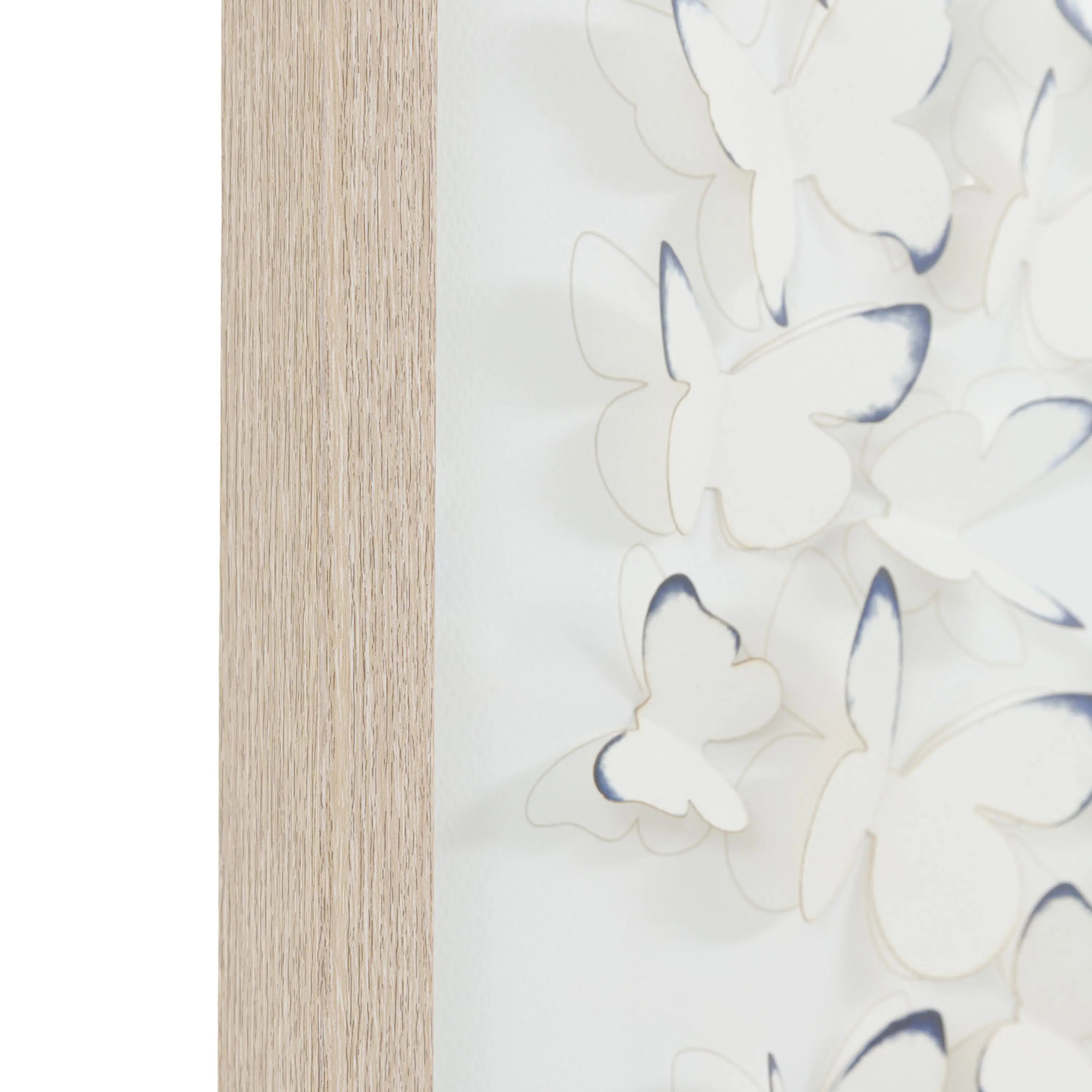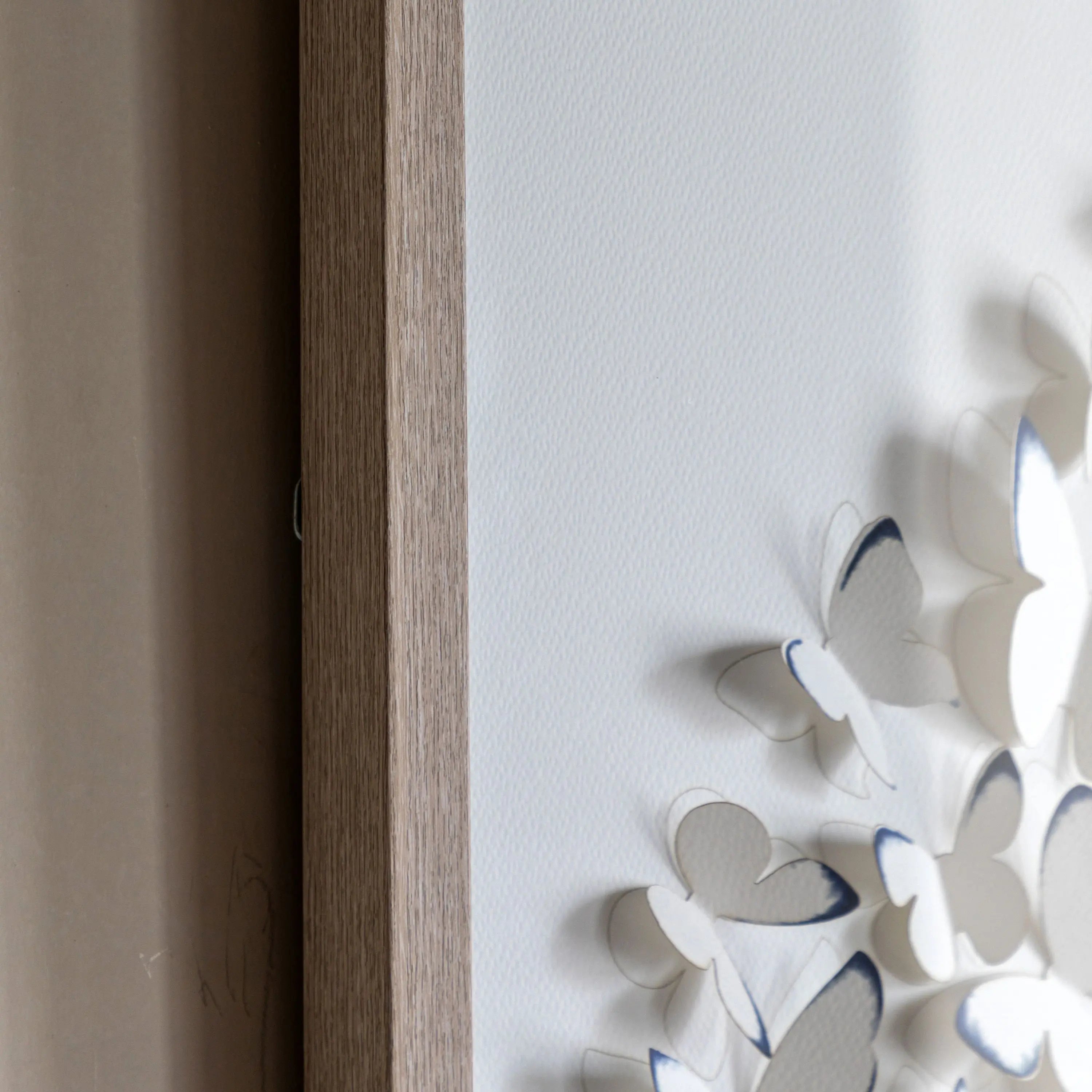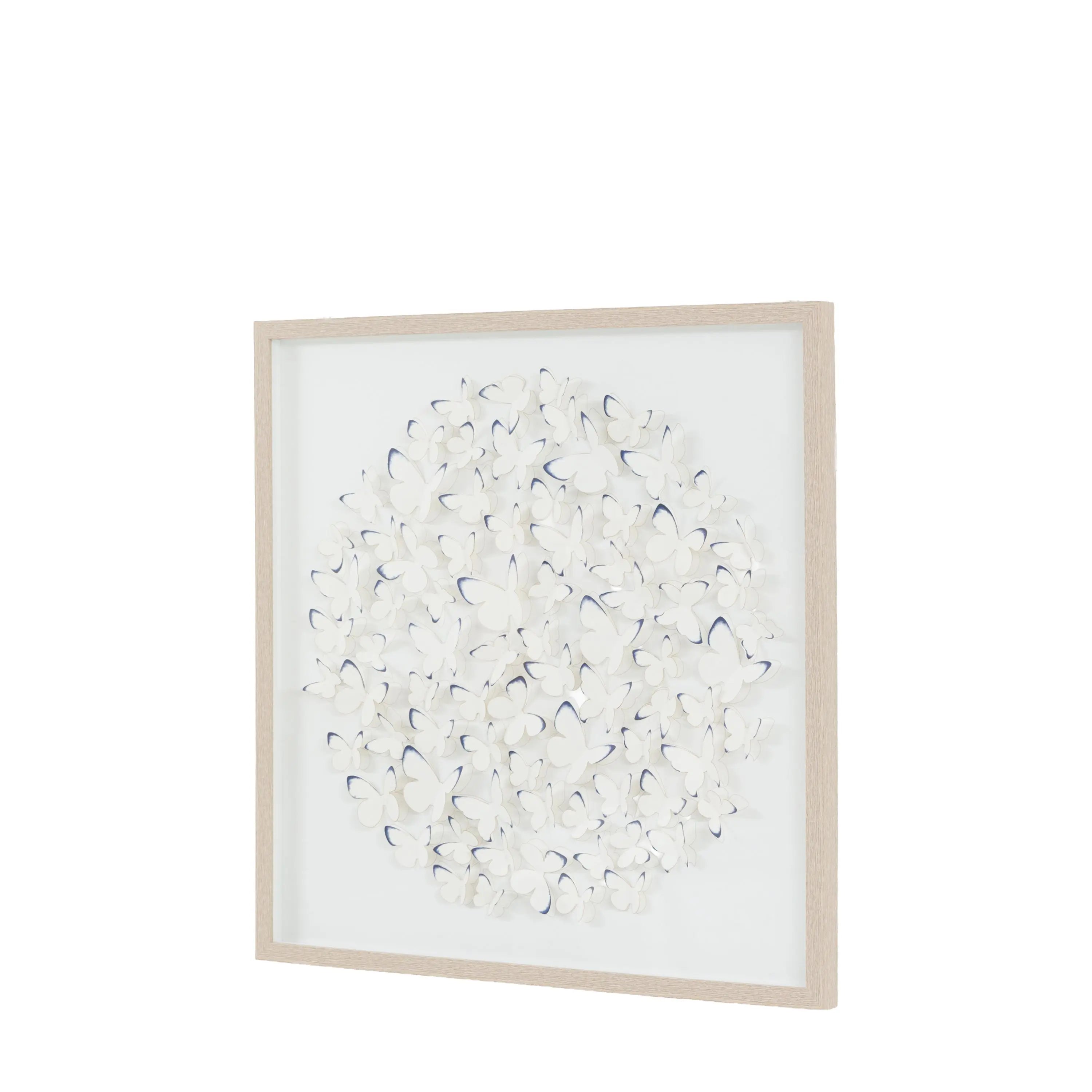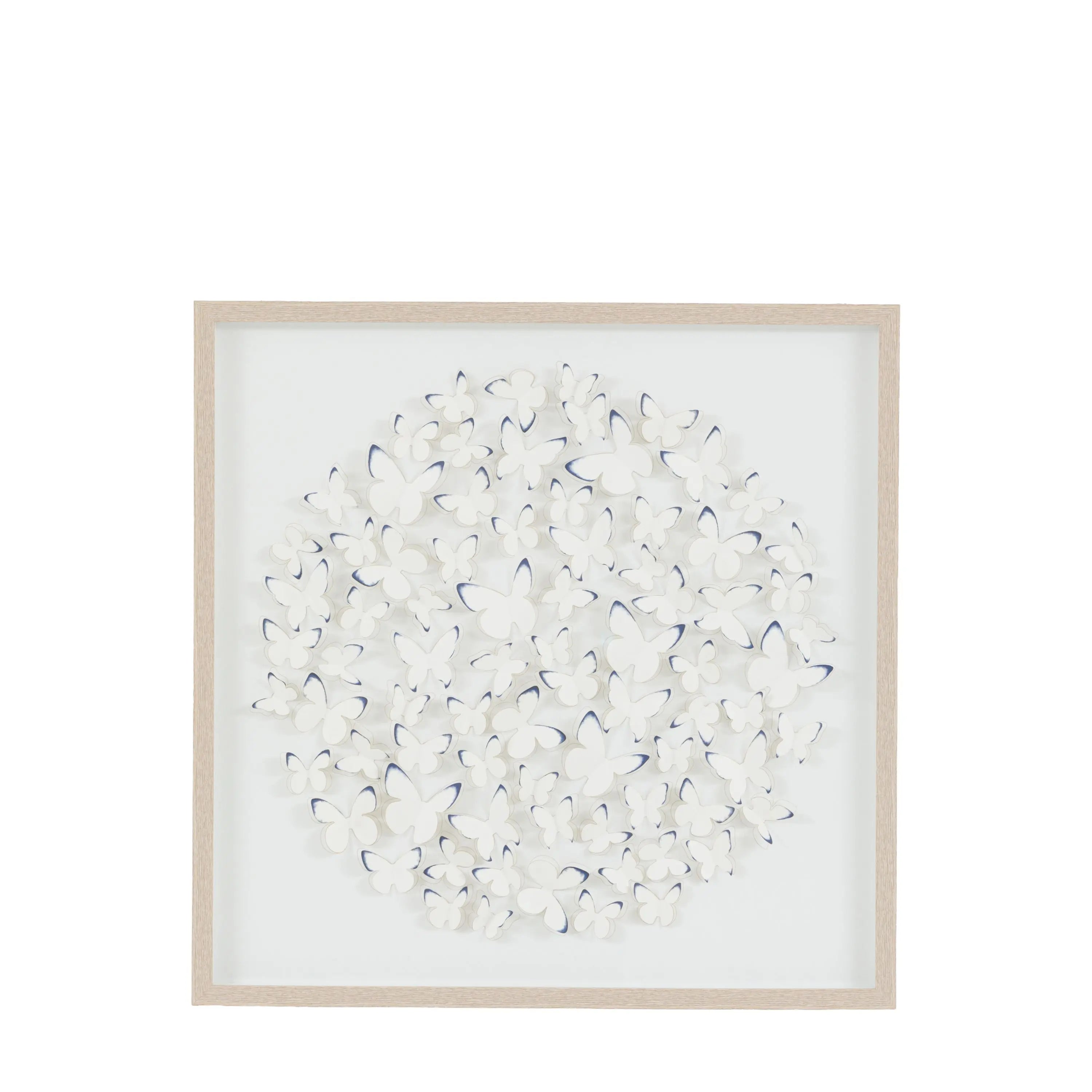 A captivating three dimensional artwork printed on fine watercolour paper, intricately die cut to create a delicate cluster of butterflies in graceful motion. Each butterfly's wings are gently raised to cast soft shadows and bring a sense of depth, texture, and lightness to the piece. Framed in a shadow box frame in a muted oak finish