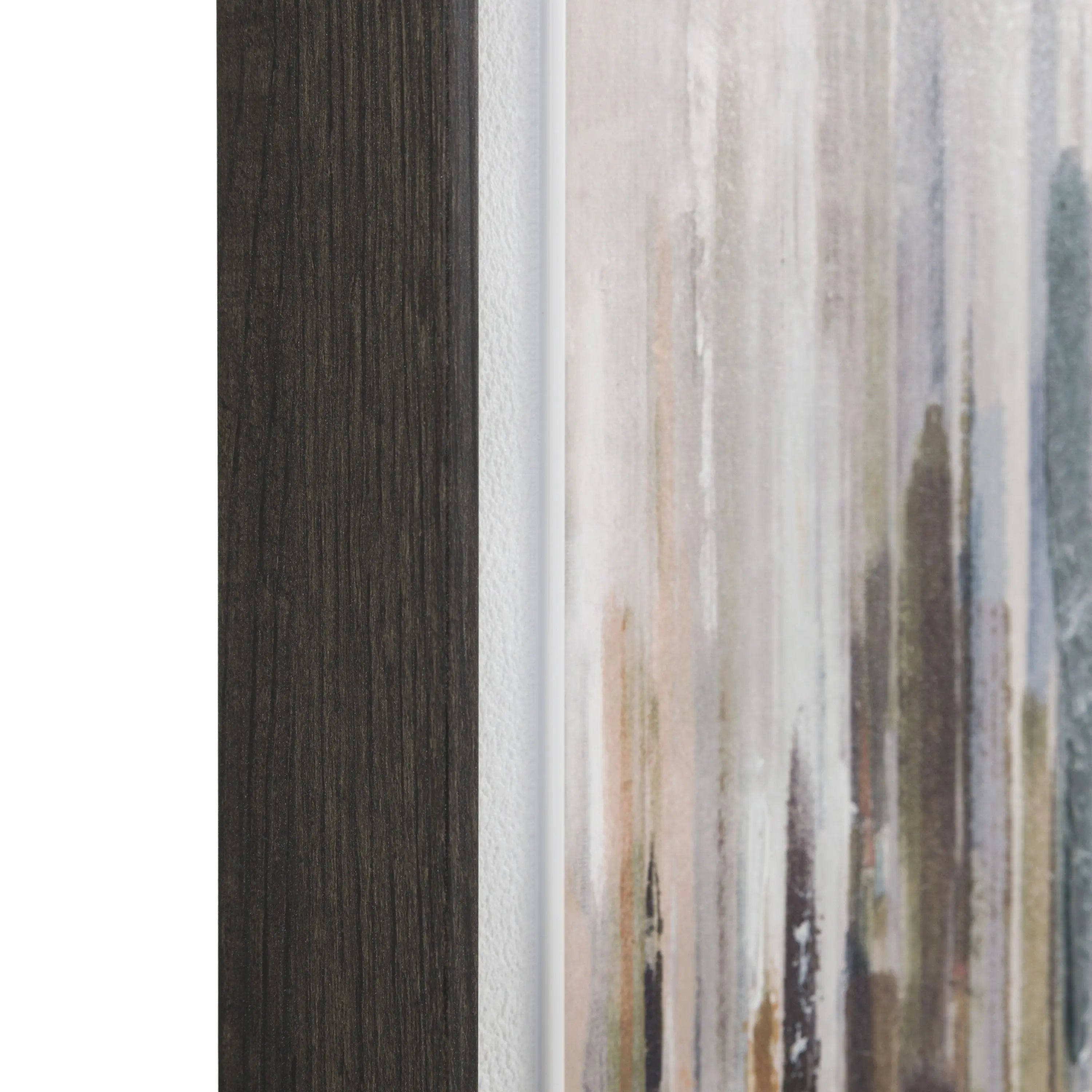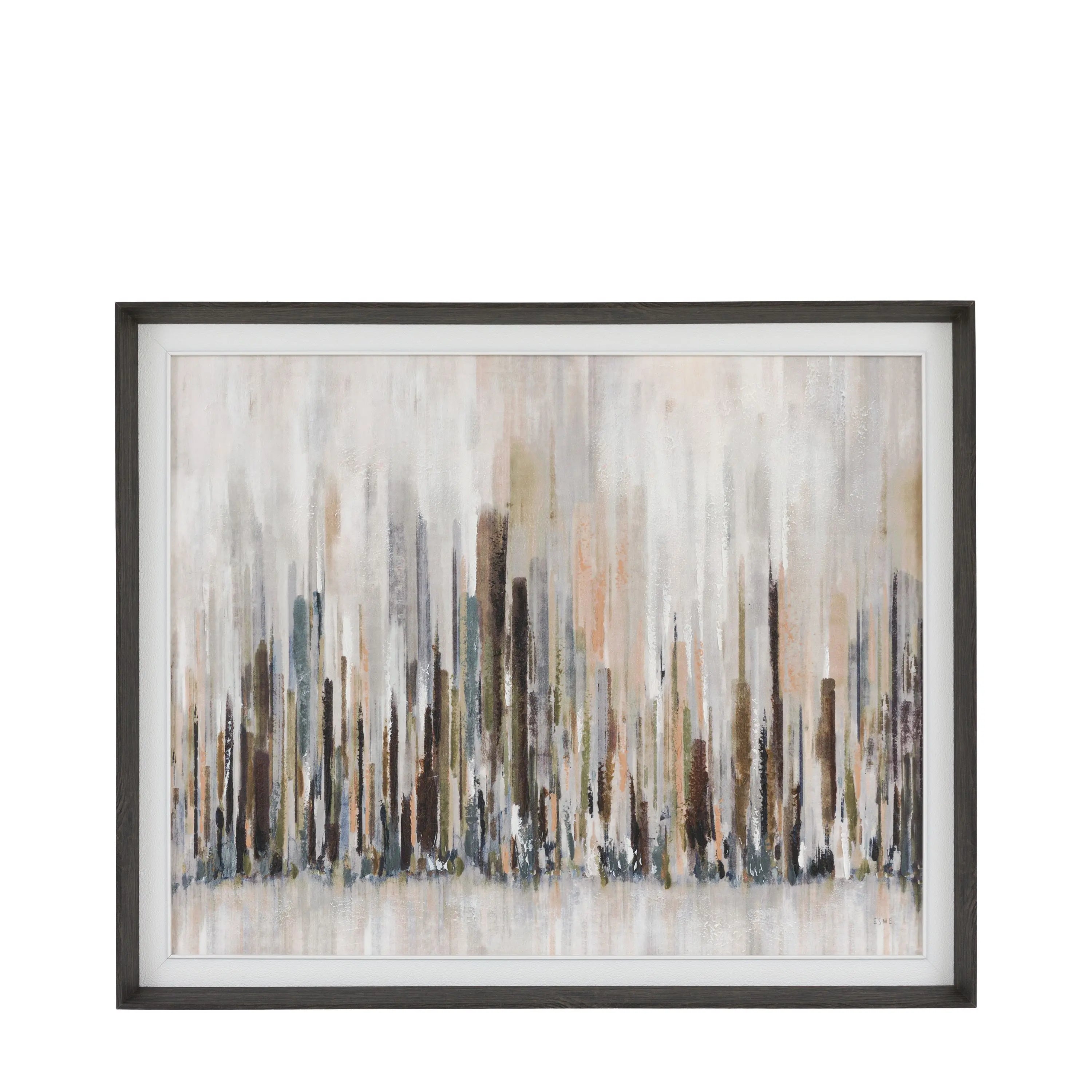 A striking abstract interpretation of an urban skyline, composed of vertical strokes in layered tactile tones and thick hand painted elements in taupe, grey and black. The rhythmic composition suggests reflection and movement, capturing the shifting light and structure of a city in an atmospheric, contemporary style.