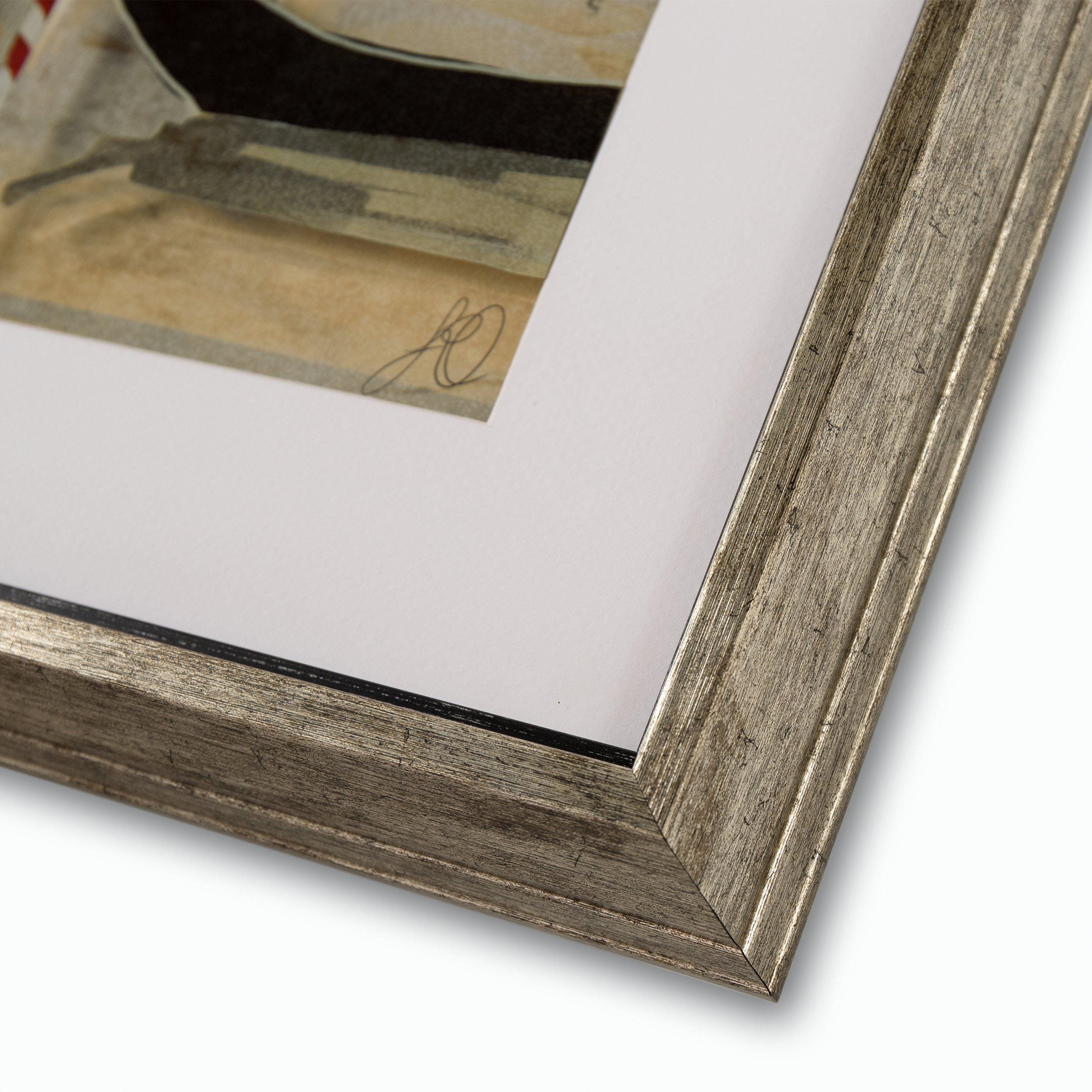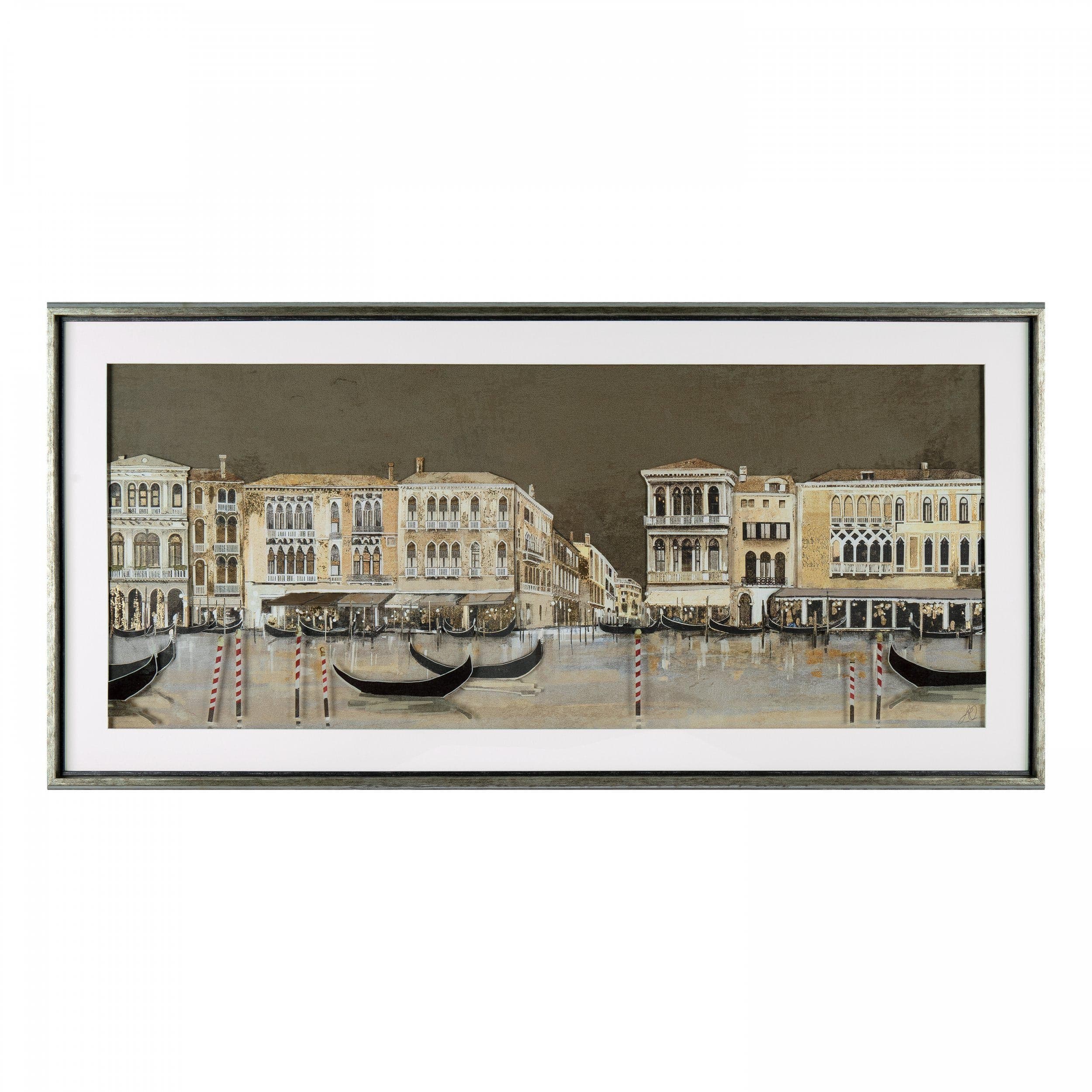 A charming Venetian scene is depicted at dusk using rich colours to capture the romantic setting. As night falls, the peaceful canal glistens in the moonlit sky, creating a serene and tranquil atmosphere. Faye Reynolds-Lydon beautifully captures the traditional architecture of the townhouses that stand tall against the calm, gondola-filled canal. The light from the cafes spills onto the narrow streets. A layering technique gives the city scene depth, creating an immersive illusion. Gold foils add a glamorous touch of magic to the design. A decorative golden frame with a black fleck texture completes the glazed composition.