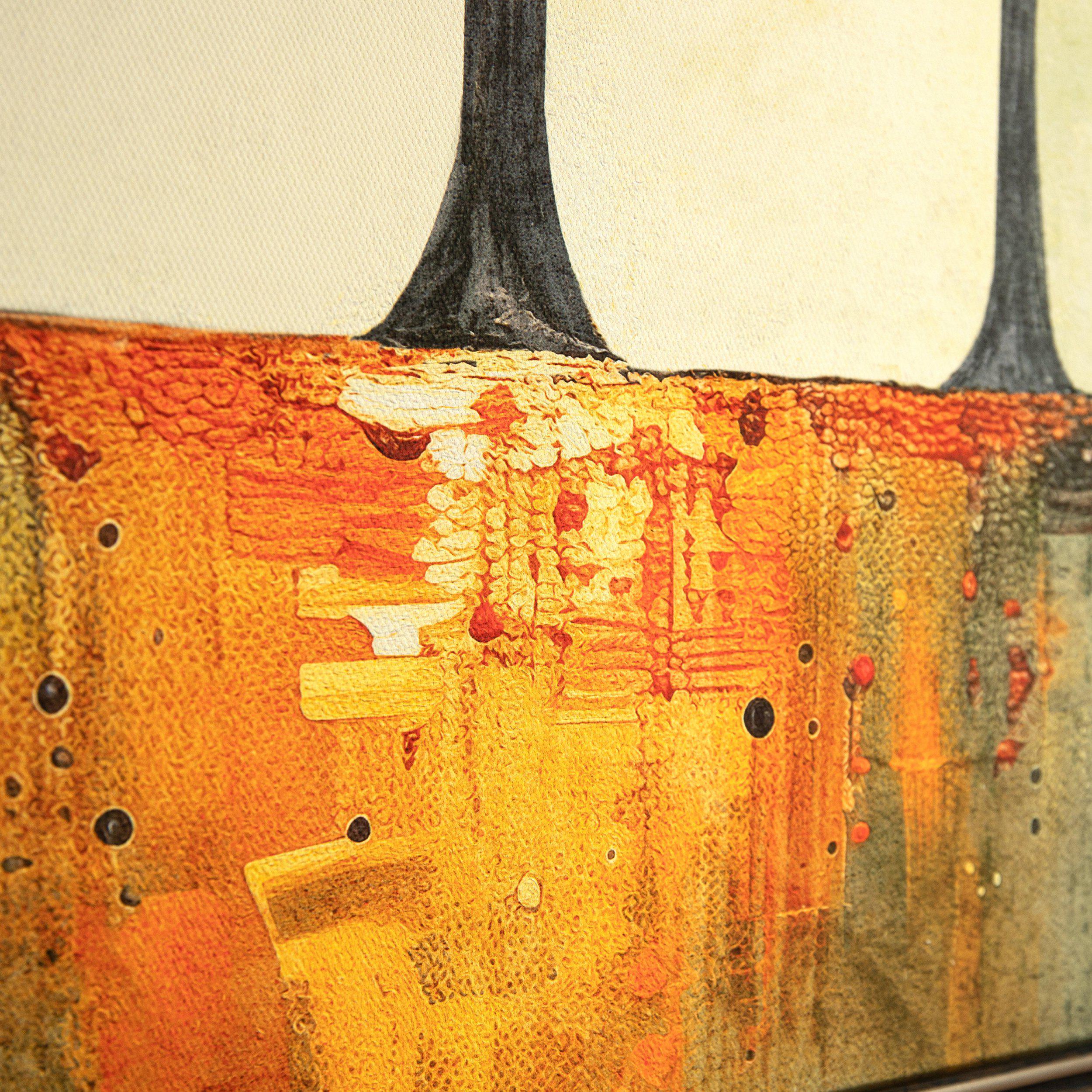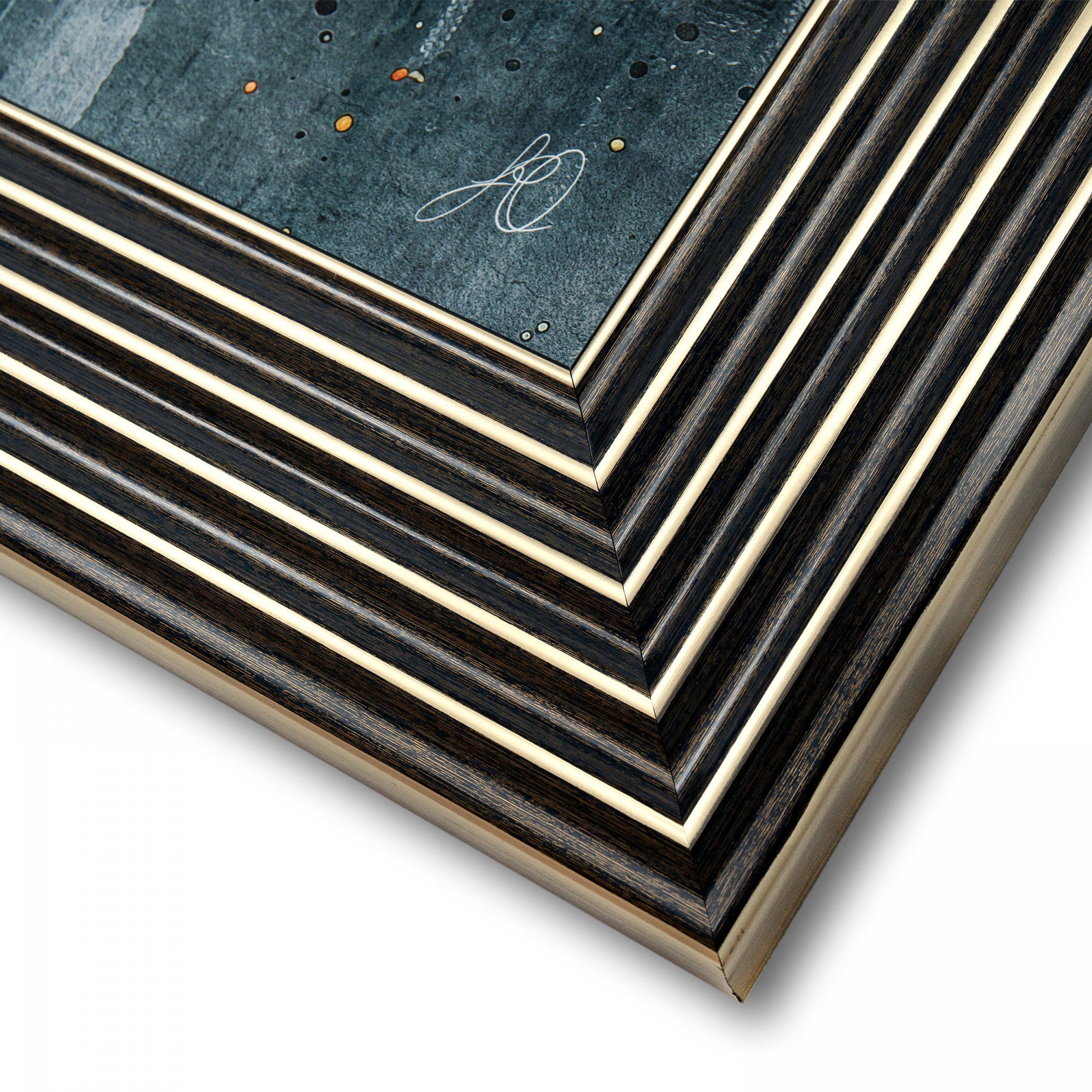 A dynamic row of trees stands tall on the horizon. The abstract composition demands the use of bold, intense paints to form the full shape of the tree's canopy. The splashes of paint that work around the branches create a sense of depth and vibrancy. A golden yellow tree takes centre stage, creating a warm shadow on the hilltop. Faye Reynolds-Lydon selects a decorative ribbed profile, a unique choice that adds texture and depth to the piece. A dark blue with a golden texture wraps around the moulding.