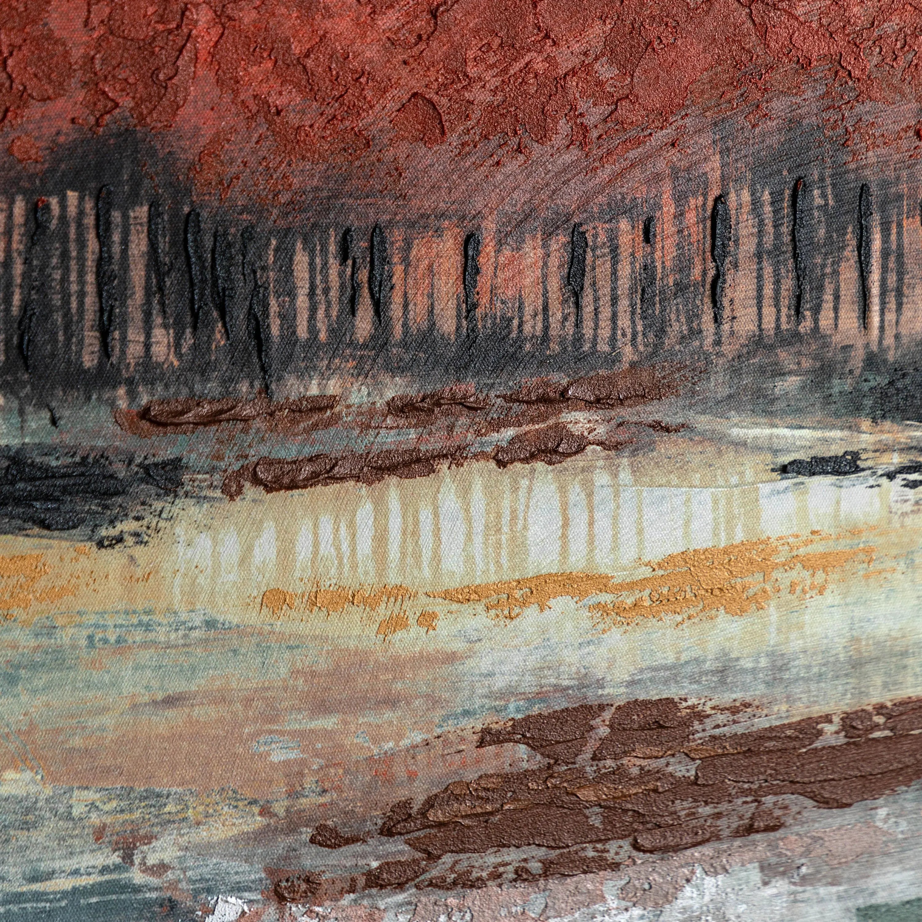 A tranquil woodland scene bathed in autumn light. Rich amber and rust tones sweep across the horizon, meeting the cool blues of water and sky. The artist captures a fleeting moment of calm, where colour and reflection merge in quiet harmony, with the tactile surface creating a natural warmth